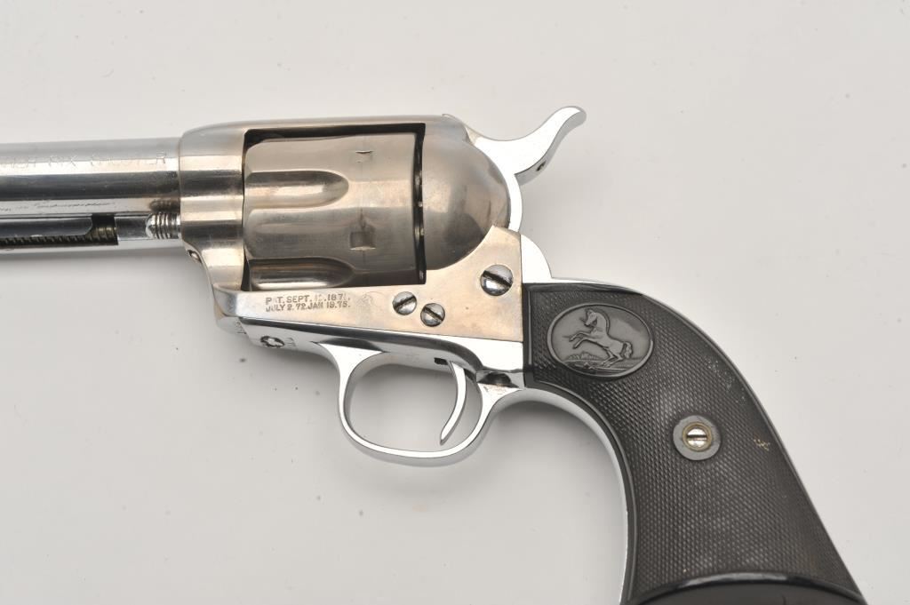 Colt SAA Frontier Six Shooter revolver, 4.75” barrel, old re-nickel finish, checkered hard rubber grips, S/N 159132; overall good condition with a good bore, crisp action, good markings and grips; majority of re-nickel remains on metal surfaces. (Antique). Est.: $1,200-$2,400.