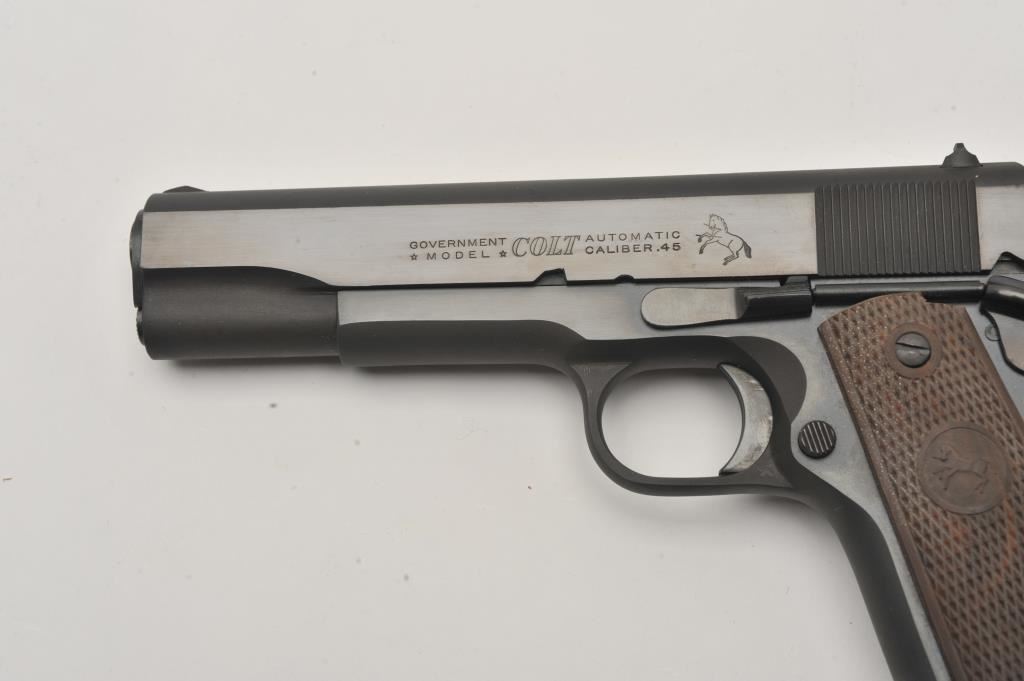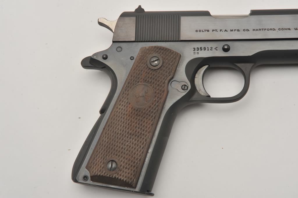 Colt 1911 A-1 Government Model semi-automatic pistol, .45 ACP caliber, Serial #335912C. The post-war pistol is as new in the factory woodgrain cardboard box with a 5” barrel. The pistol retains nearly all of its original blue finish with only light handling marks noted. The pistol is marked, “BB” on the both the frame and barrel. BB is also written on the end and bottom of the factory box. The checkered plastic grips are in very good condition with sharp checkering. The lot includes one correct, magazine. The bore is very good, the markings are sharp and action is crisp. Est.: $1,250-$2,500. (C+R/PPT).