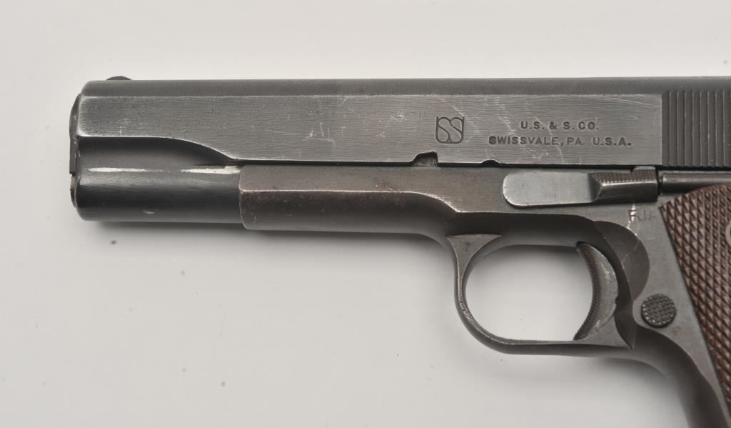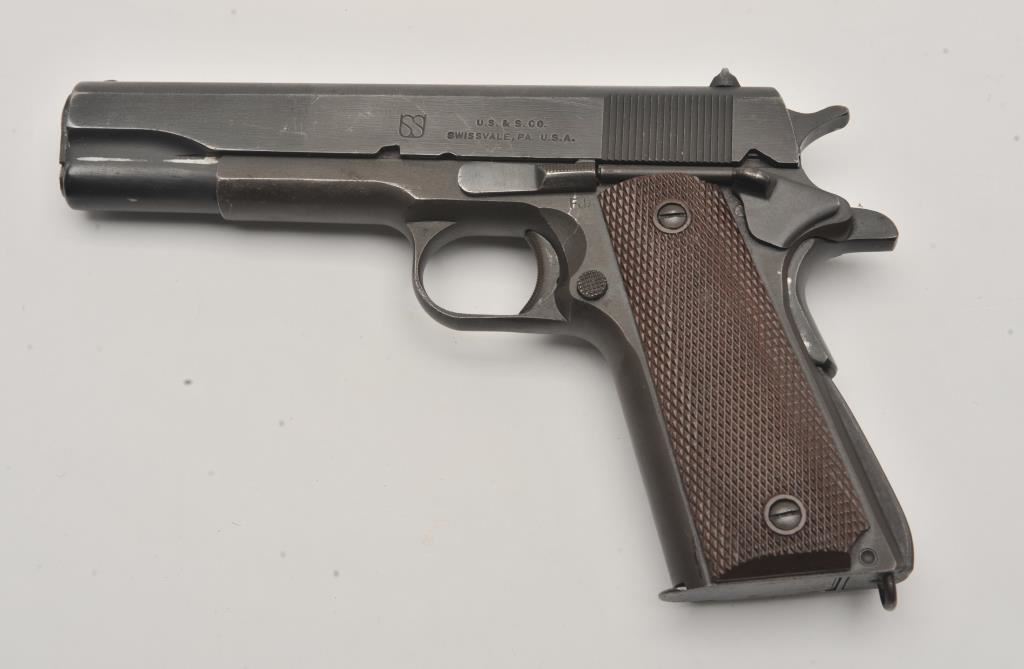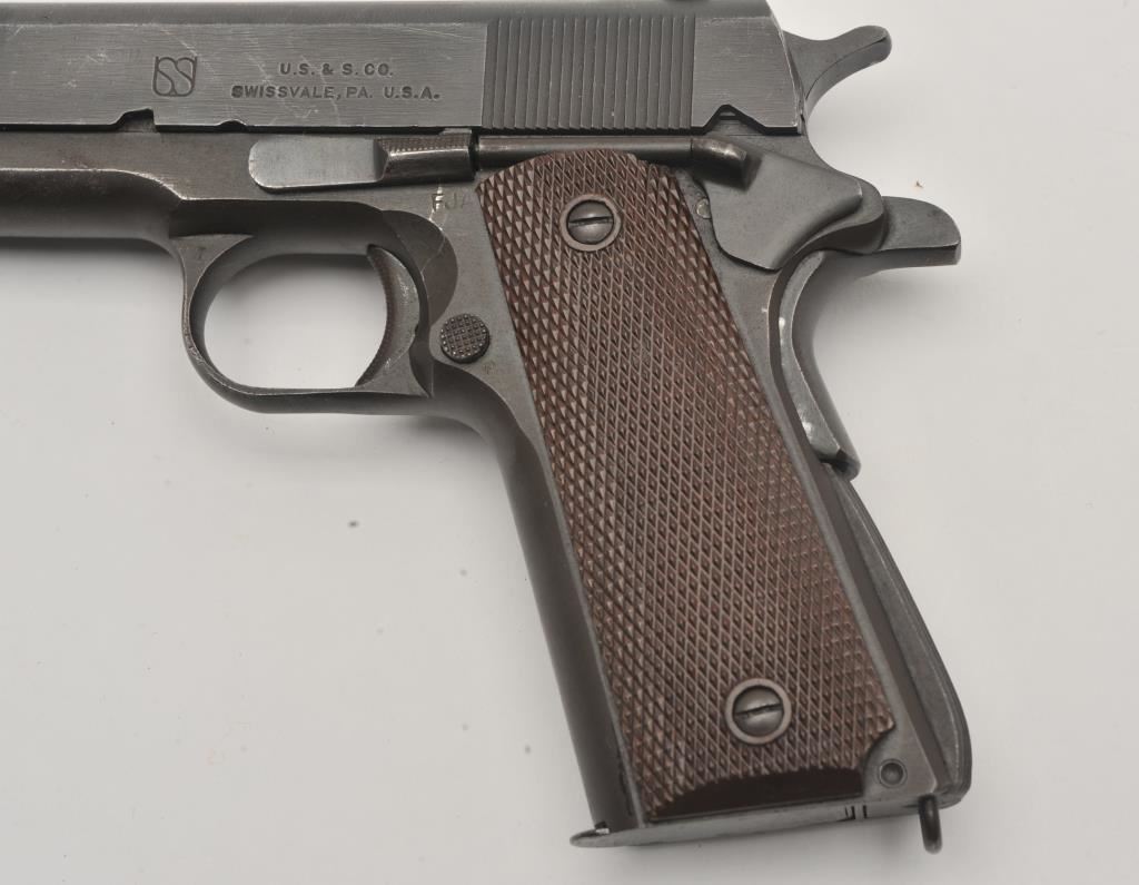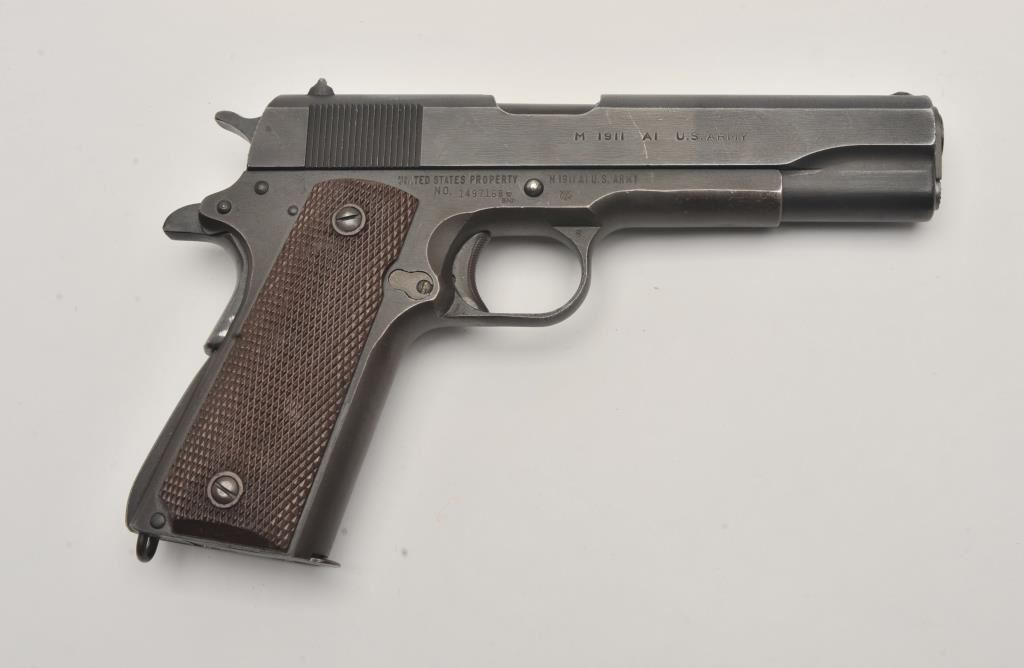 U.S. Property marked Model 1911-A1 semi-automatic pistol by Union Switch and Signal Co., .45 caliber, 5” barrel, military finish, checkered brown plastic grips, S/N 1497168; British proofed; overall very good to near fine condition with majority of military finish remaining on metal surfaces, very good to near fine bore, crisp action, sharp markings, fine grips. (C&R/PPT). Est.: $2,000-$4,000.