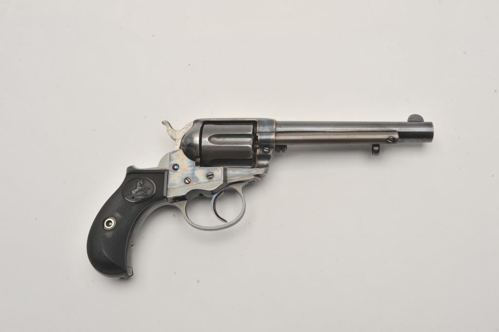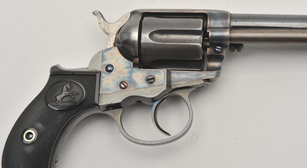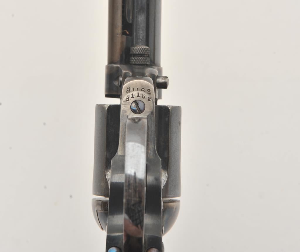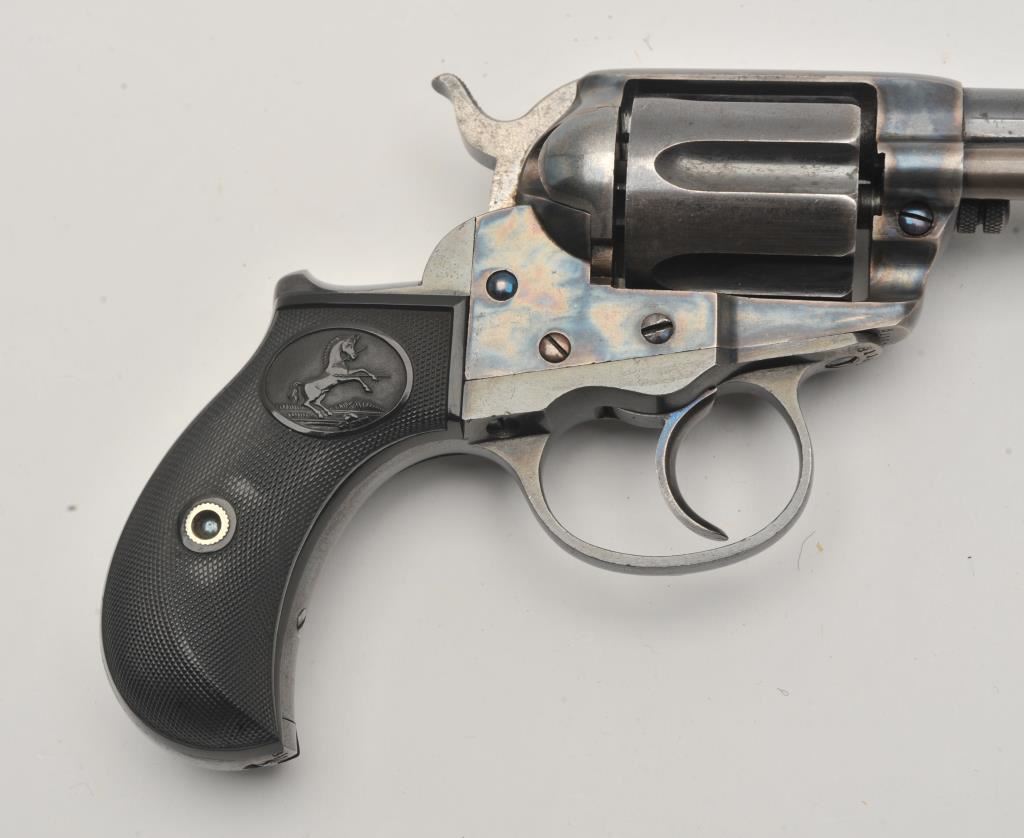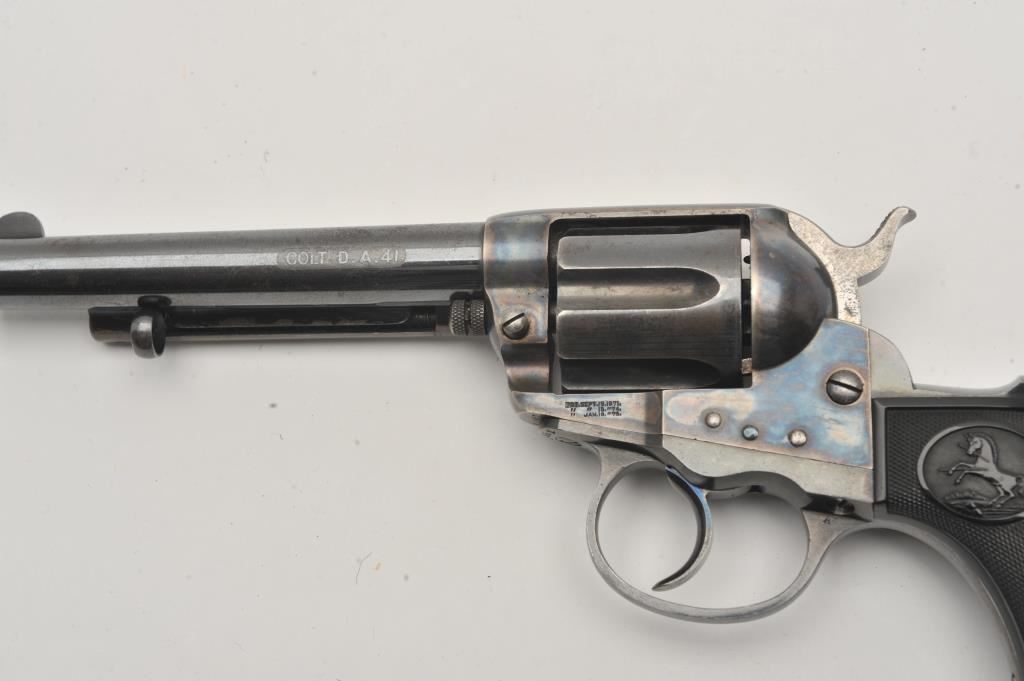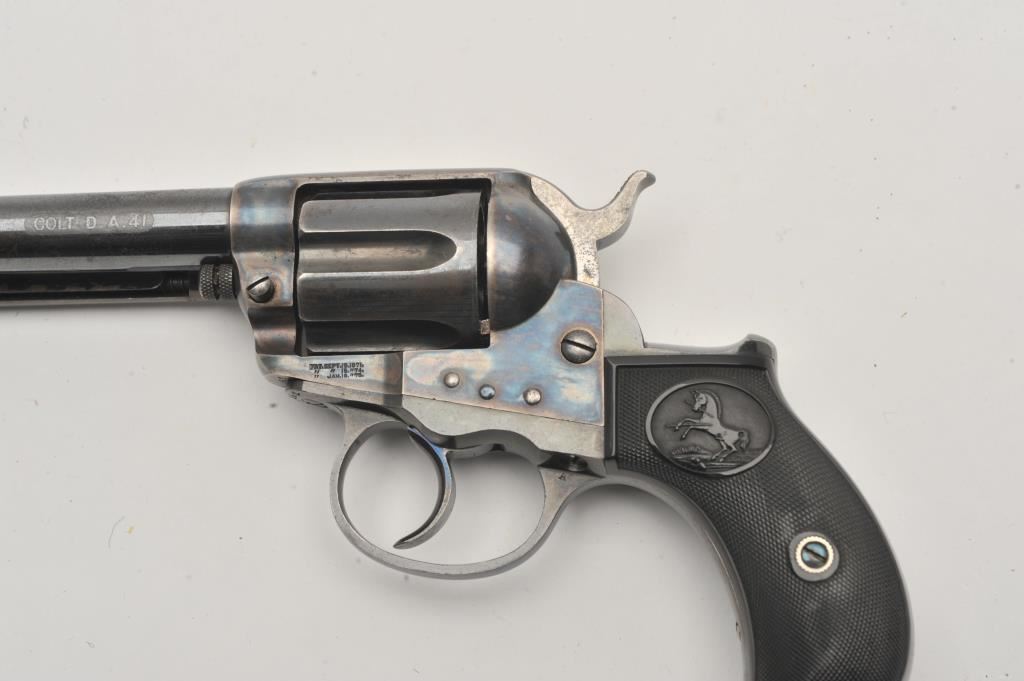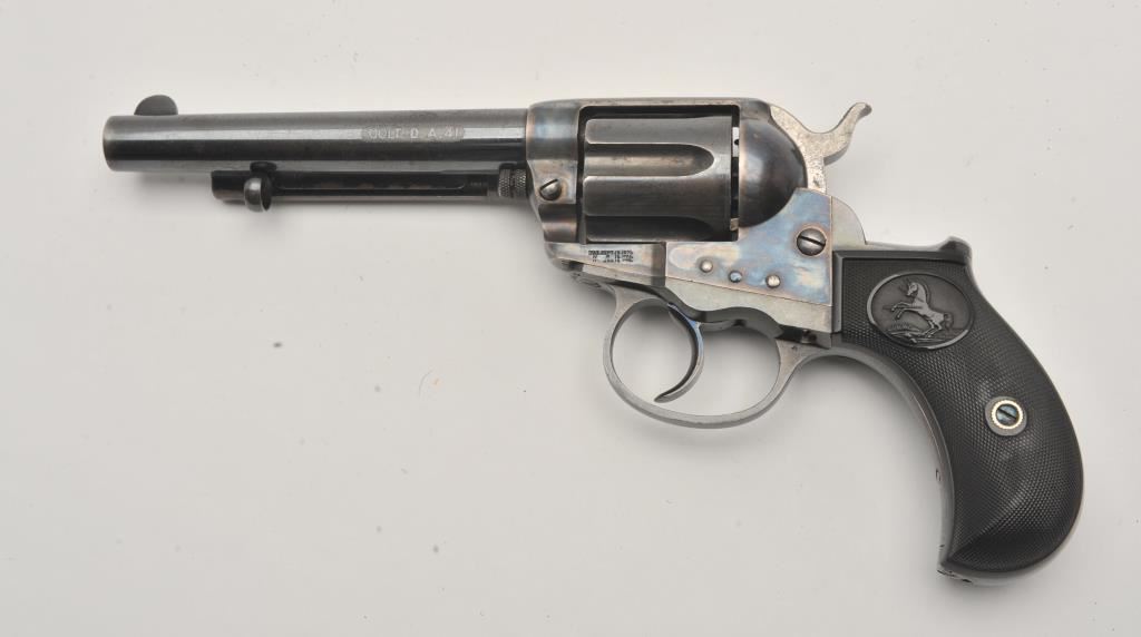 Colt Model 1877 “Thunderer” DA revolver, .41 caliber, 5” barrel with etched panel, blued and case hardened finish, checkered black hard rubber grips, S/N 81162; overall very good to fine condition with majority of original blued and case colors remaining, action crisp and working at time of description, fine bore, sharp markings and fine grips. (Antique). Est.: $1,500-$3,000.