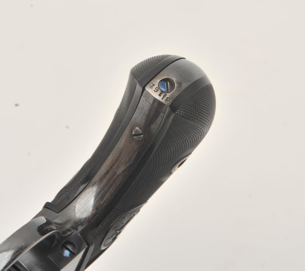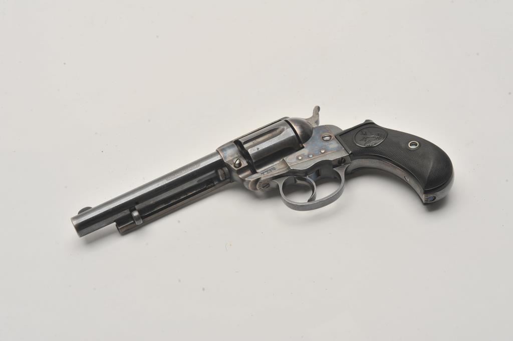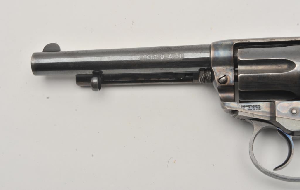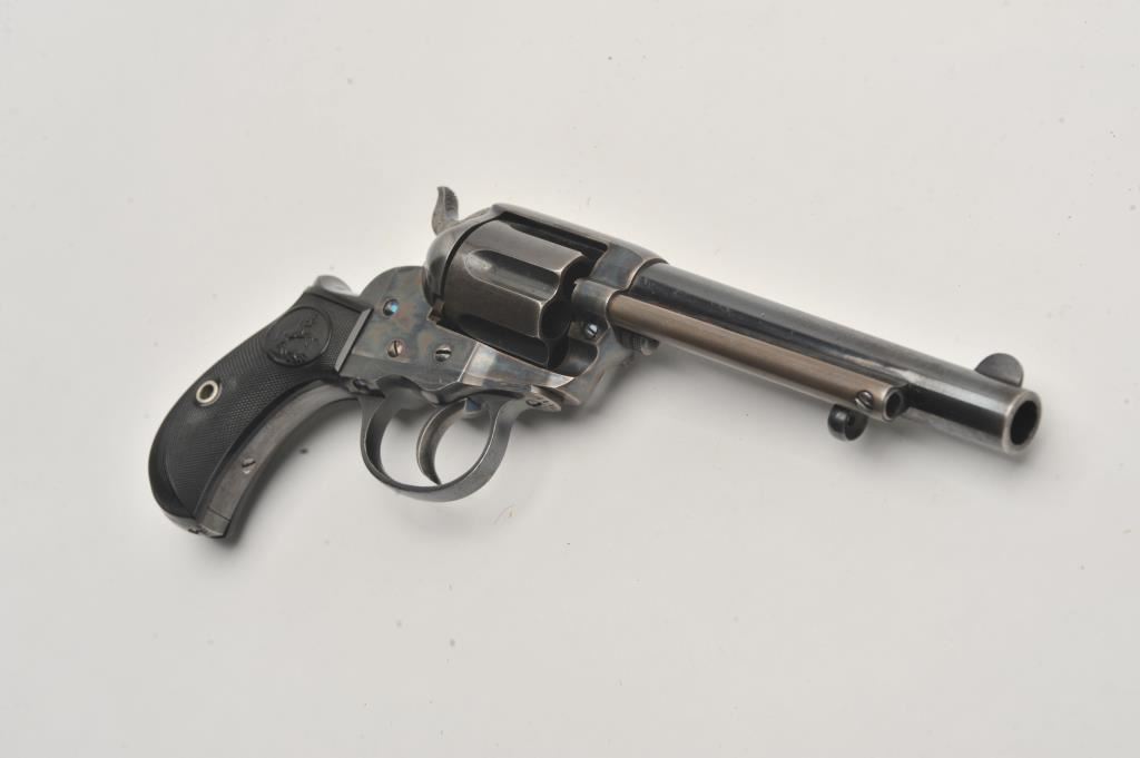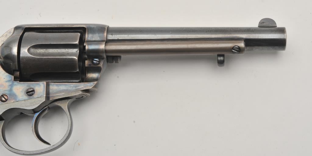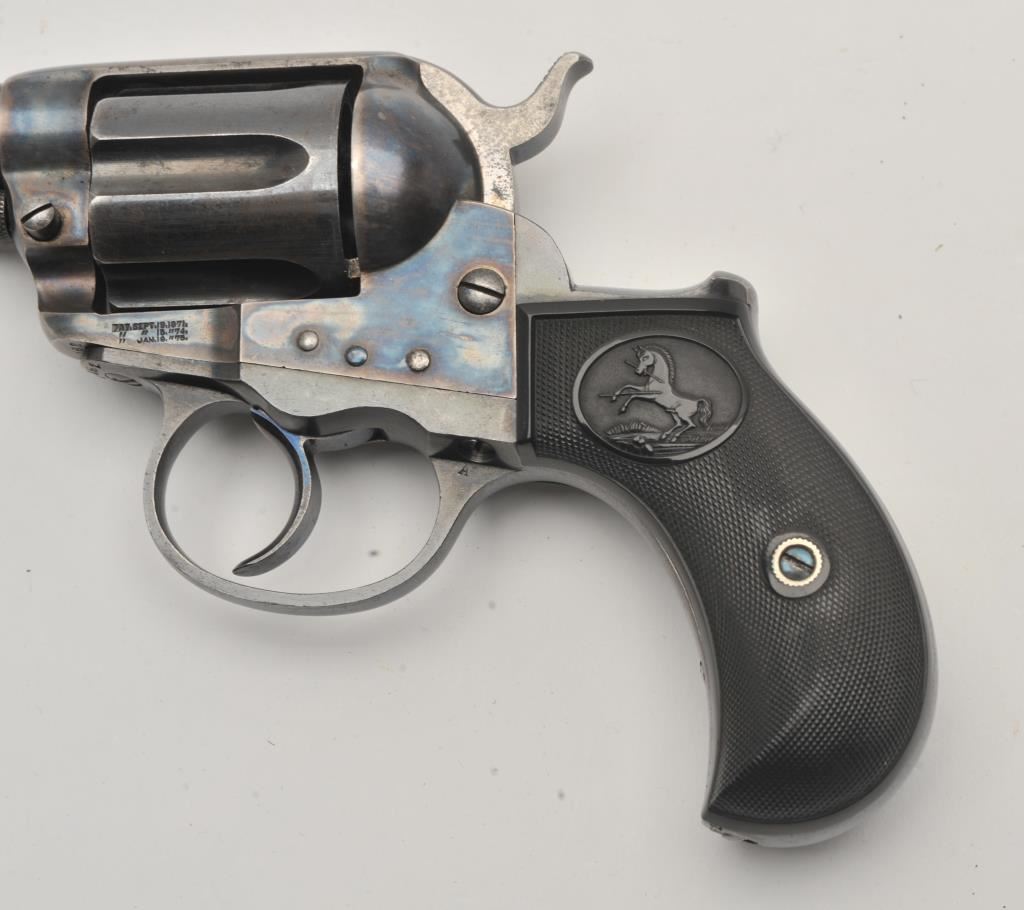 Colt Model 1877 “Thunderer” DA revolver, .41 caliber, 5” barrel with etched panel, blued and case hardened finish, checkered black hard rubber grips, S/N 81162; overall very good to fine condition with majority of original blued and case colors remaining, action crisp and working at time of description, fine bore, sharp markings and fine grips. (Antique). Est.: $1,500-$3,000.
