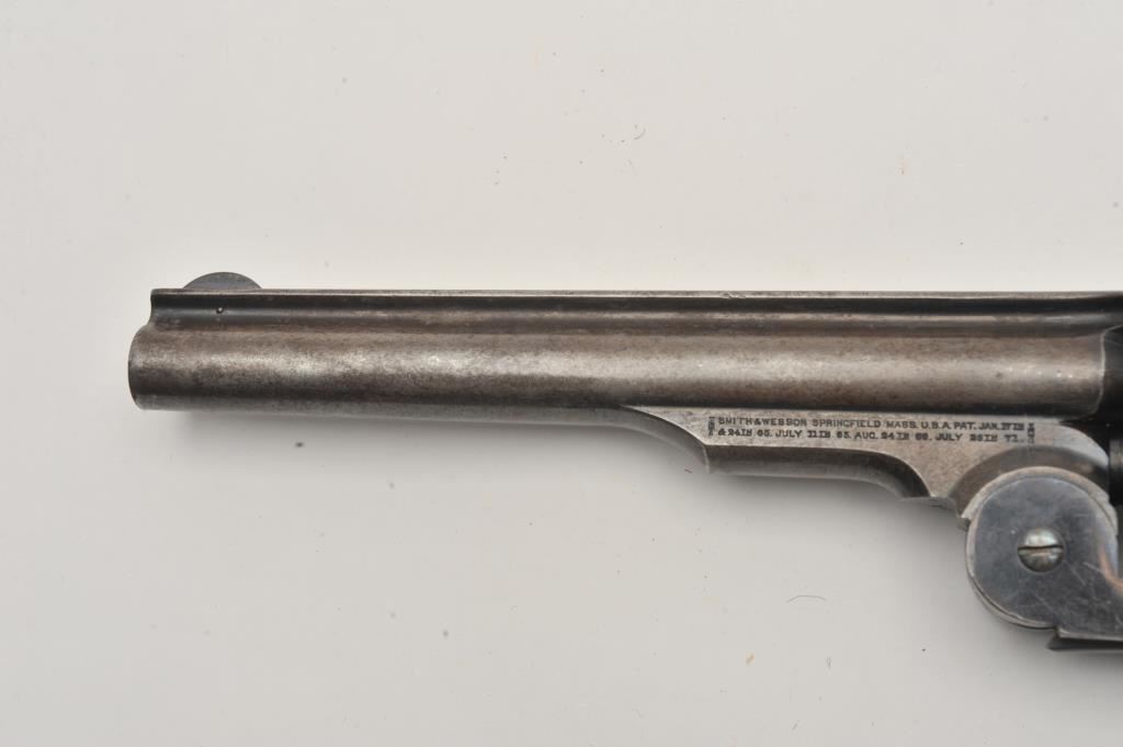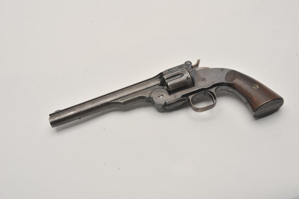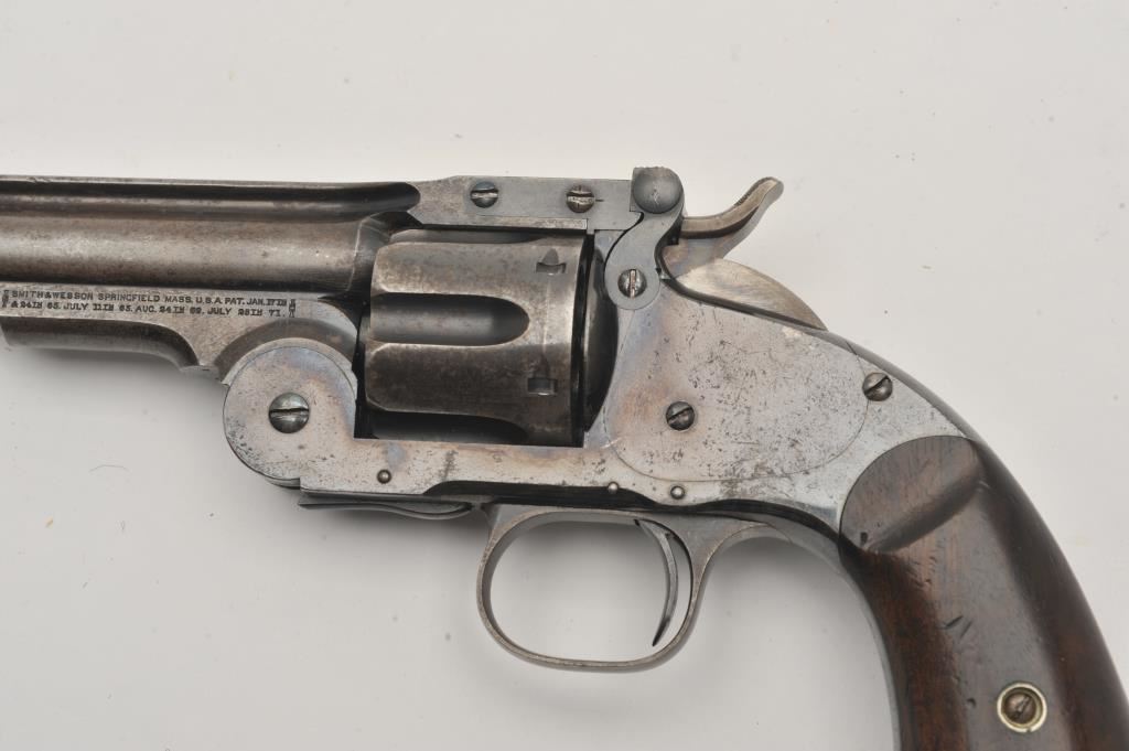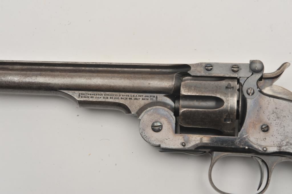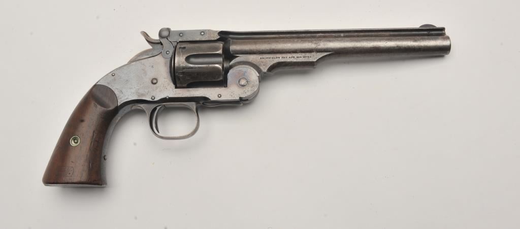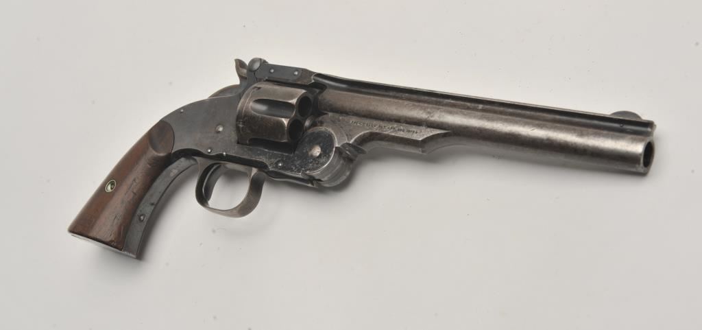 Smith & Wesson Schofield Second Model Single Action revolver, U.S.-marked, .45 caliber, 7” barrel, blued finish, wood grips, S/N 4686; overall very good to near fine condition displaying approximately 40% original blued finish, crisp action, sharp markings and near fine bore; grips are very good + and display 1876 date at bottom of left grip with visible cartouches on both grips (“CW” on right grip and what appears to be “JPJr” on left grip. (Antique). Est.: $3,000-$6,000.