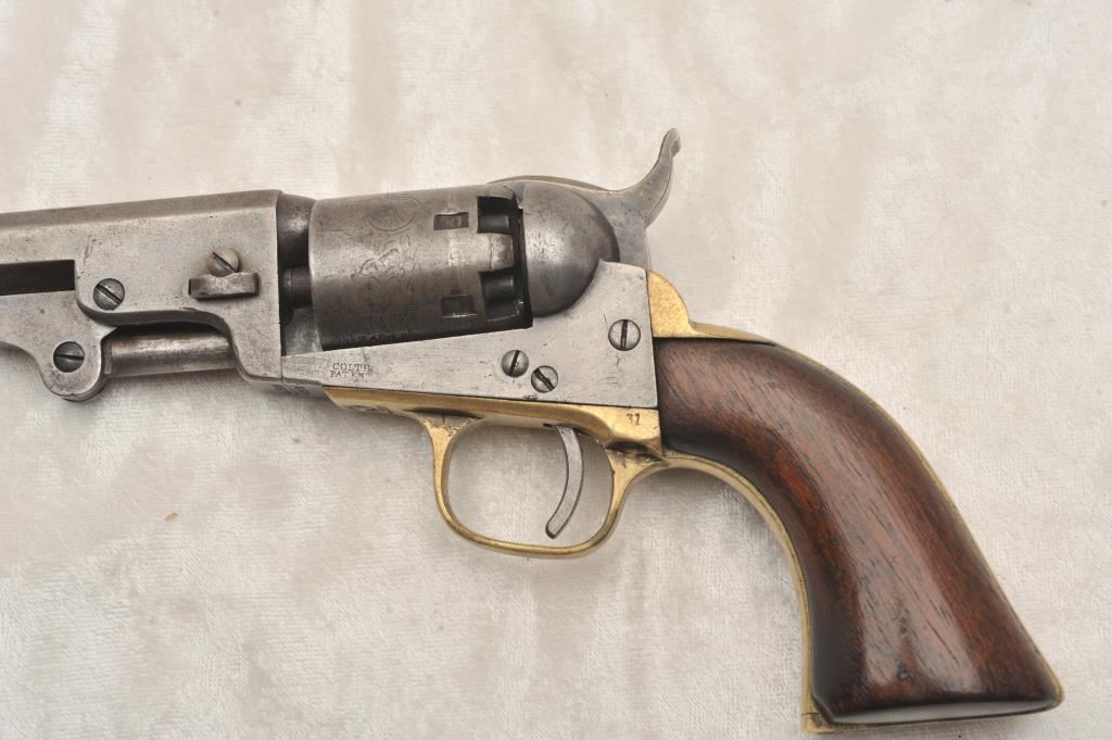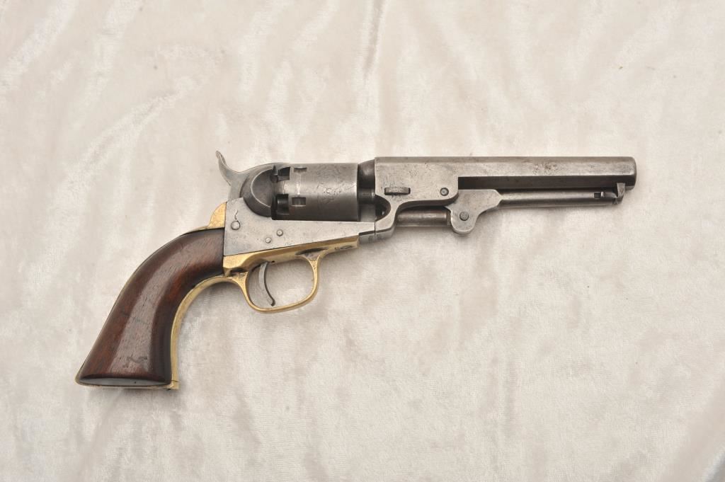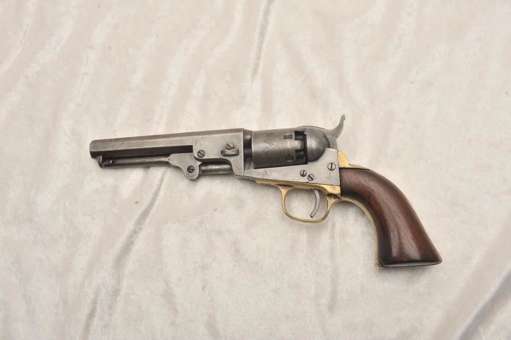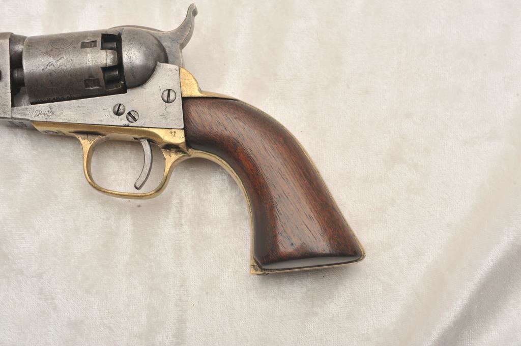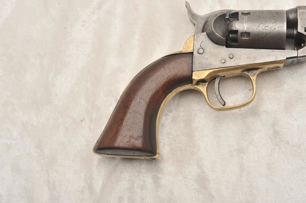 1849 Colt Pocket model revolver in .31 caliber with a 5” barrel, inscribed “Pvt. F. Shaw Va, CSA” and “1862-64” on butt. This revolver remains in fair to good condition showing wear and heavy use. Light cleaning. Grips are undersized and refinished. Good markings. Traces of scene. The action is not always revolving due to bad hand. Provenance: The estate of Michael Sorenson noted S. California collector. His inventory sheet indicating Shaw was a quartermaster in the Army of Northern VA. Is included. (Antique) Est.: $1400-$2800