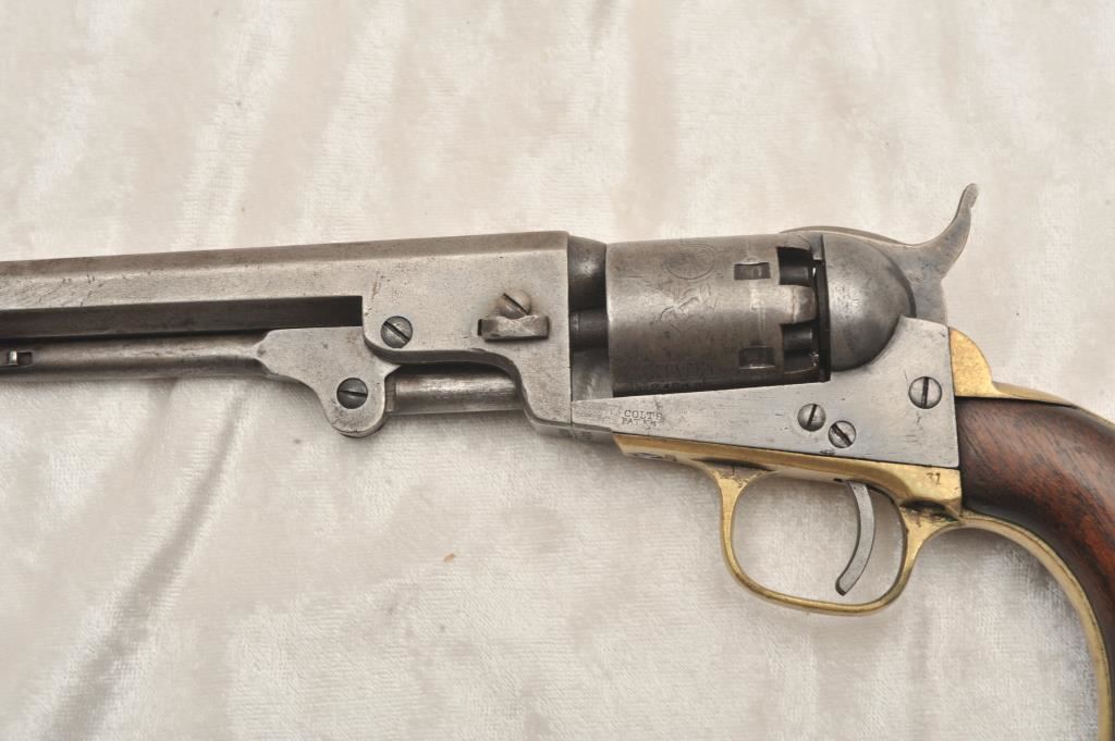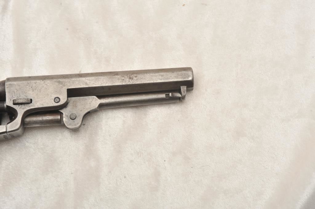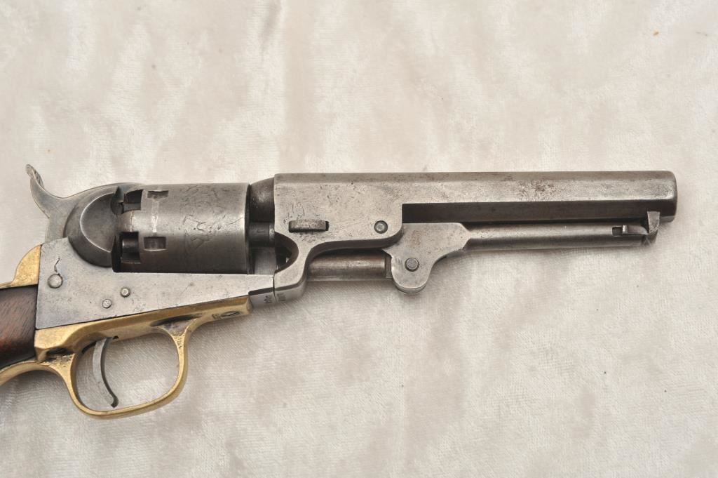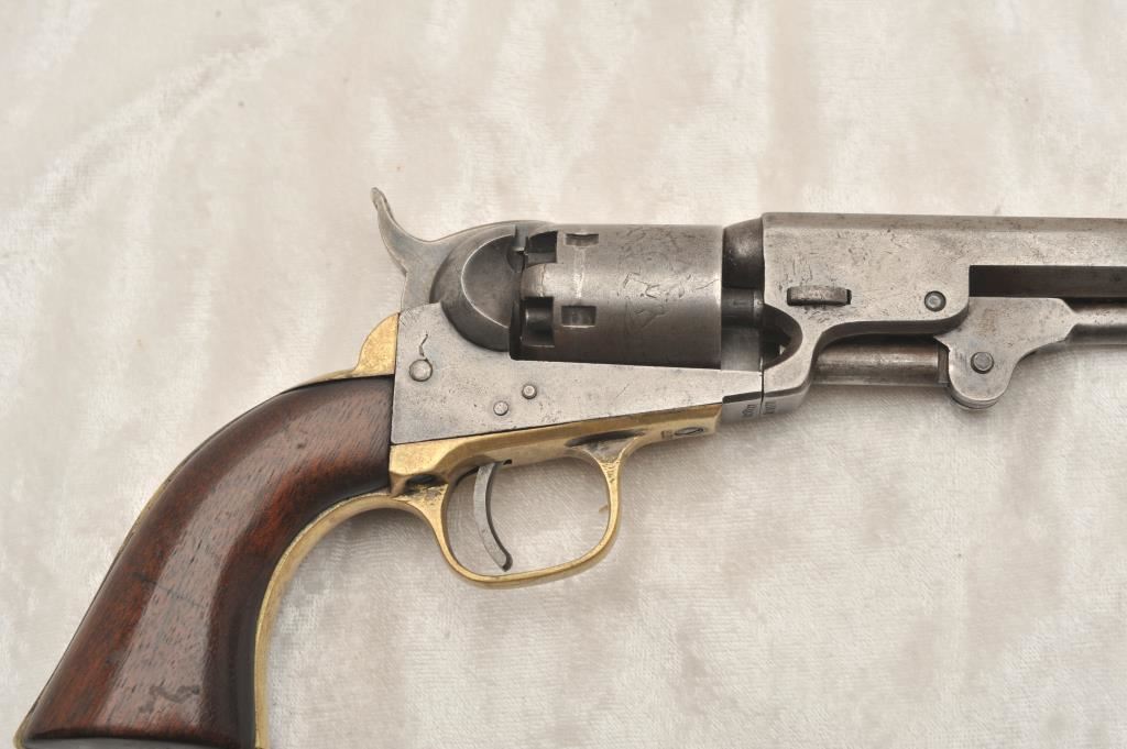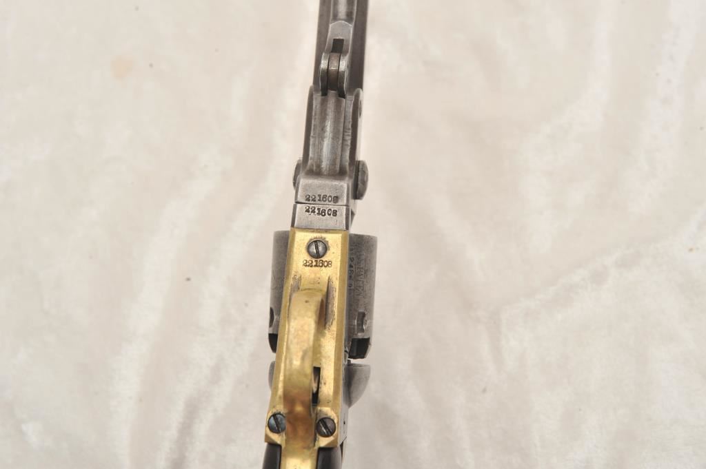 1849 Colt Pocket model revolver in .31 caliber with a 5” barrel, inscribed “Pvt. F. Shaw Va, CSA” and “1862-64” on butt. This revolver remains in fair to good condition showing wear and heavy use. Light cleaning. Grips are undersized and refinished. Good markings. Traces of scene. The action is not always revolving due to bad hand. Provenance: The estate of Michael Sorenson noted S. California collector. His inventory sheet indicating Shaw was a quartermaster in the Army of Northern VA. Is included. (Antique) Est.: $1400-$2800
