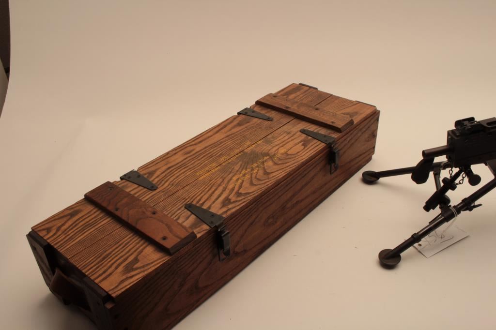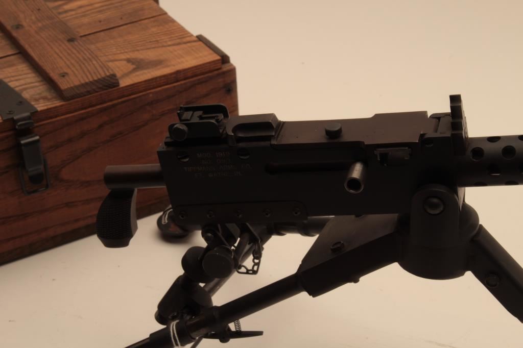 Tippmann Arms Co. Model 1919 1/2 scale semi-automatic model of a Browning tripod mounted machinegun, .22LR caliber, mat black finish, S/N 099; overall fine condition showing little use with some spots of light storage surface rust; two miniature metal ammo cans are included with one can containing .22LR ammo; instructions manual and all contained in a wood carry chest approximately 26” x 8” x 5”. (C&R/MUST BE REGISTERED AS A PISTOL/NO CALIFORNIA SALE). Est.: $2,000-$4,000.