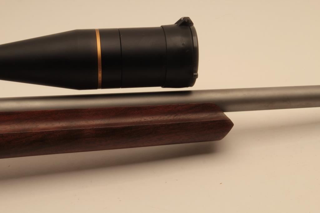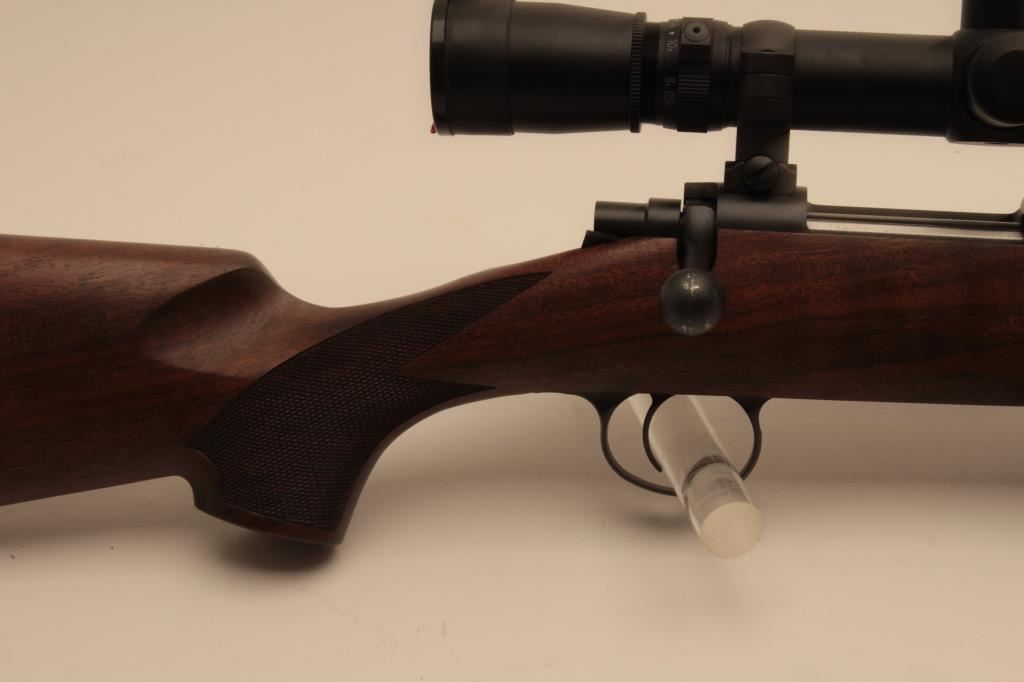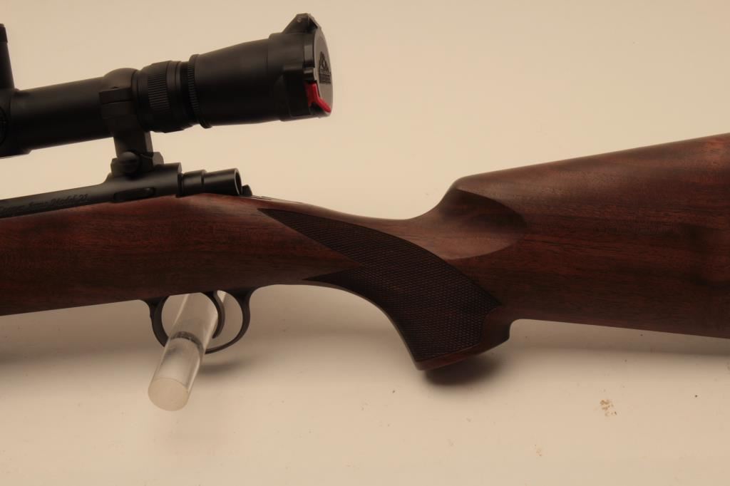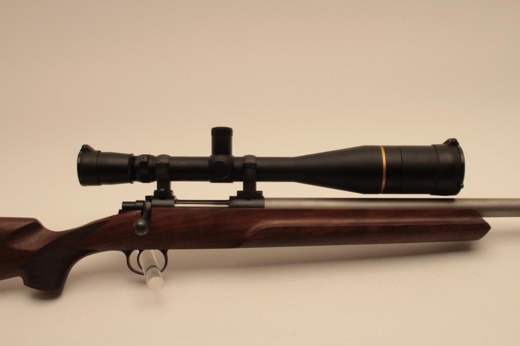 Cooper Arms Model 21 bolt action single shot rifle, .204 Ruger caliber, Serial #4698. The rifle is in fine overall condition with a 26” heavy barrel. The barrel retains nearly all of its matte stainless steel finish with small mars on the underside. The receiver retains nearly all of its matte blue finish with light scratches on the bolt knob. The finely checkered Walnut stock is in very good condition with an oversized fore end and nice figure in the butt stock. The butt ends with a solid rubber recoil pad. The rifle is topped with a Leupold VX-III 6.5 x 20 x 50 Long Range variable power scope with target turrets. The bore is good, the action crisp and markings are sharp on this most desirable Cooper with outstanding optics. Est.: $2,000-$4,000. (Modern).