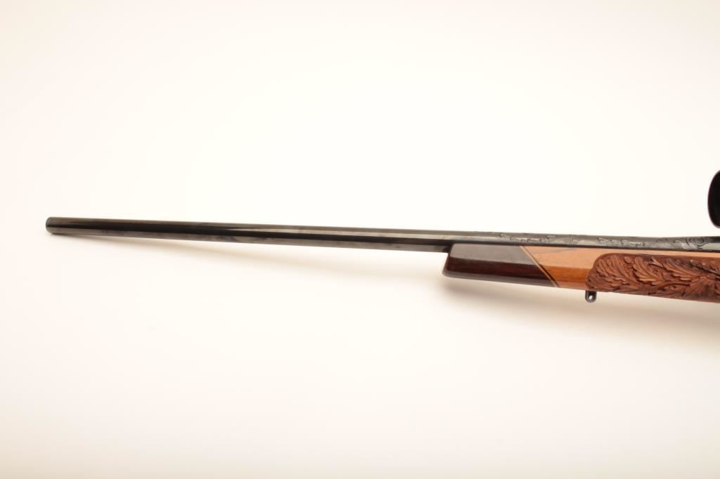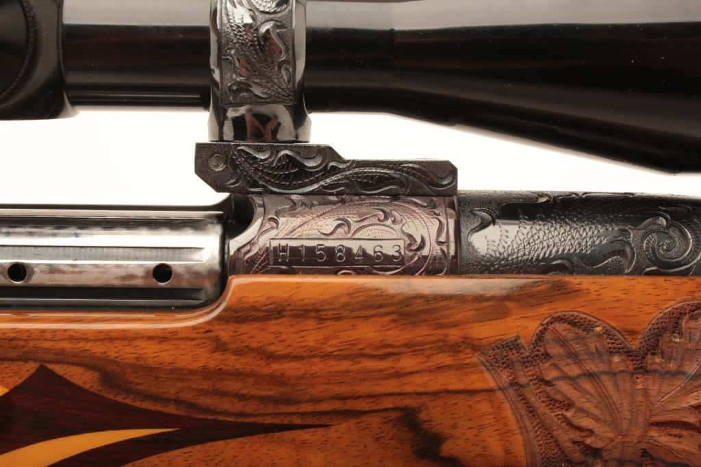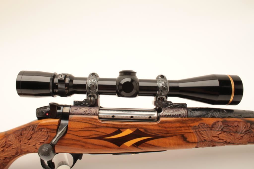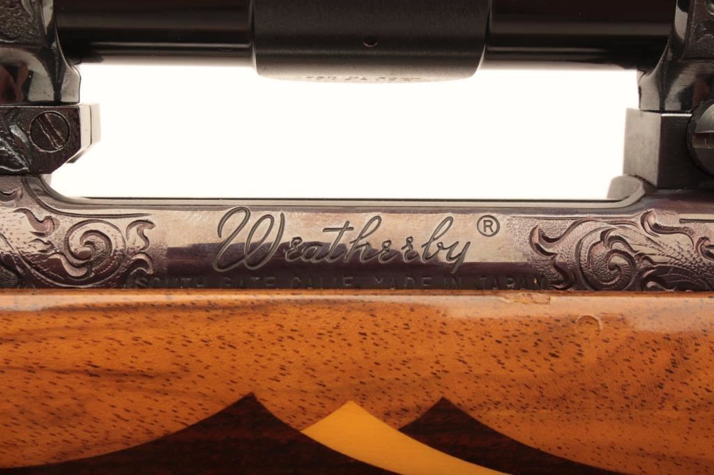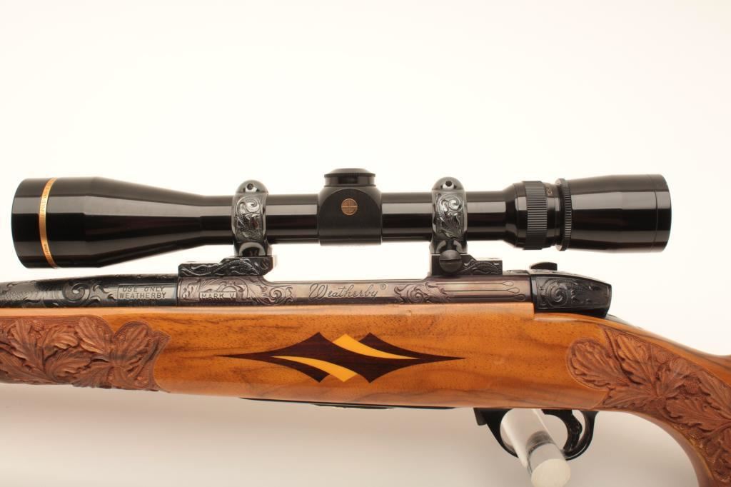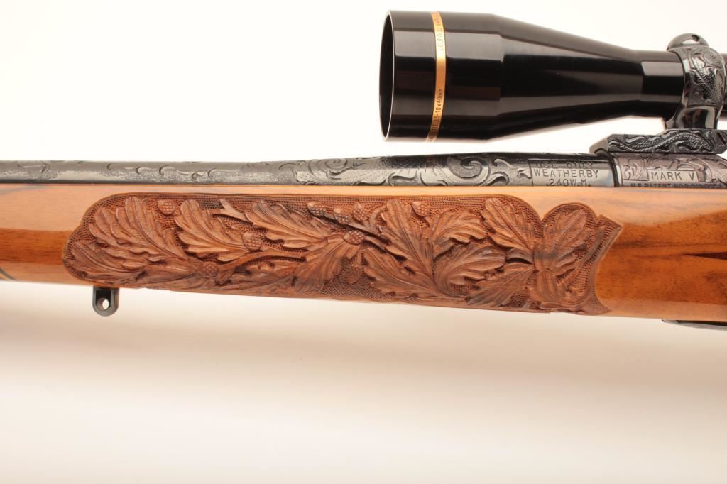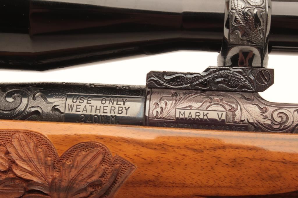 Custom Weatherby MK V bolt action rifle, .240 Weatherby caliber, Serial #H158463. The rifle is in fine overall condition with a 26” barrel. The barrel and receiver retain nearly all of their high polish blue finish with light wear at the muzzle. The receiver is marked, SOUTH GATE CALIF. MADE IN JAPAN”. The first third of the barrel and receiver have been beautifully engraved along with the trigger guard and magazine floor plate. Additionally, the rifle features a jeweled bolt and magazine follower. The bolt handled is checkered and a trigger shoe has been added. The finely checkered Walnut stock features ebony fore end and pistol grip, with custom Germanic style relief engraved oak and acorn ornamentation and inlay. A stylized gold tone escutcheon plate reading, “CEC” has been added at the fore end and a gold tone Whitetail buck embossed on the magazine plate. The butt stock ends with a ventilated rubber recoil pad providing a 13 ½” LOP. The rifle is topped with engraved mounts and scope rings and a Leupold Vari-X III 3.5 x 10 x 40 variable power rifle scope