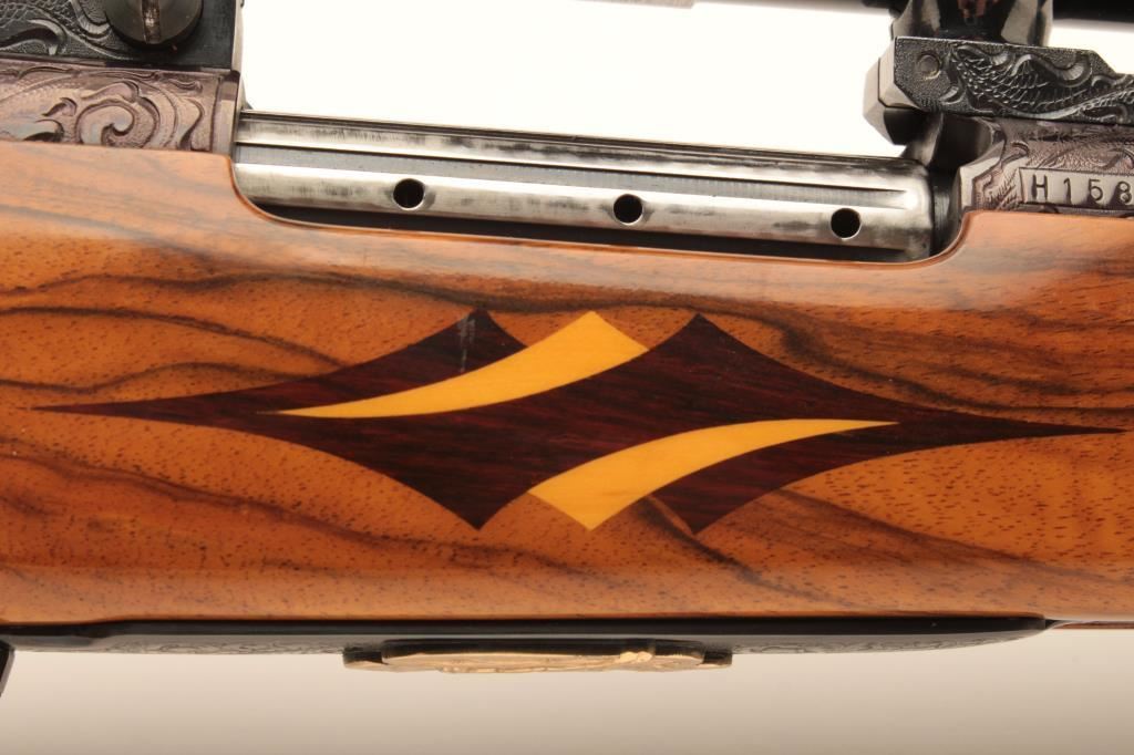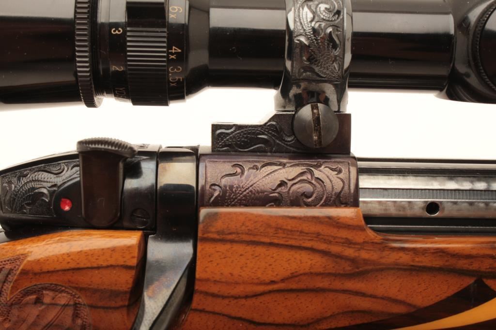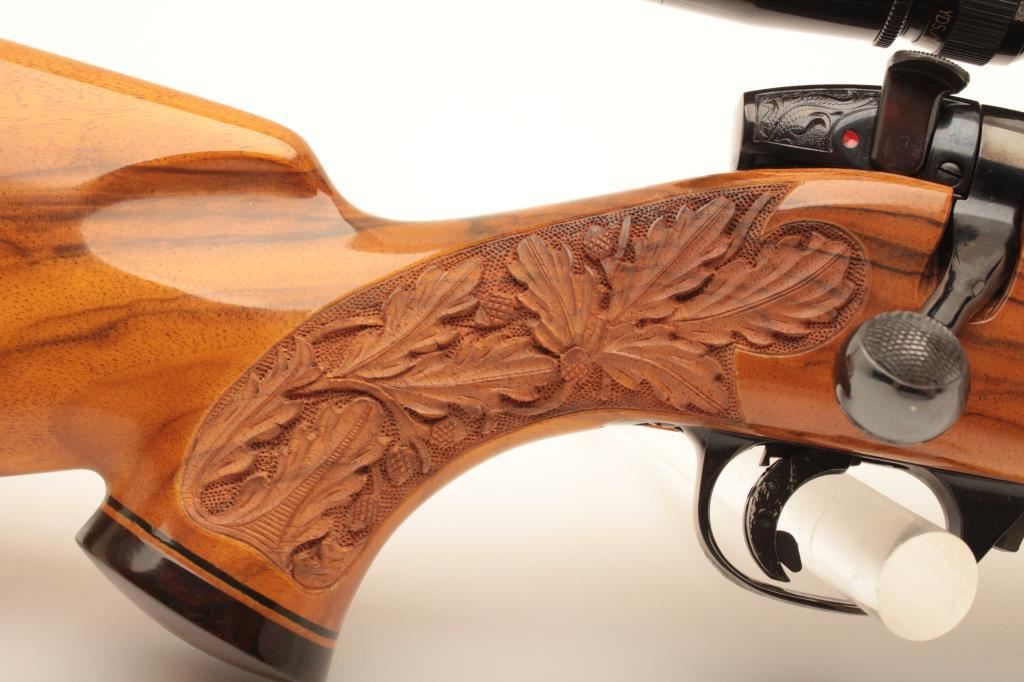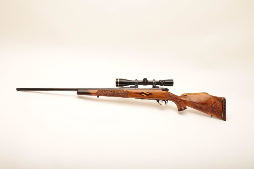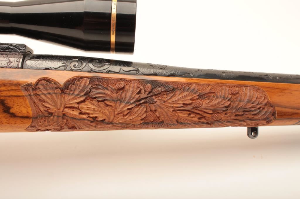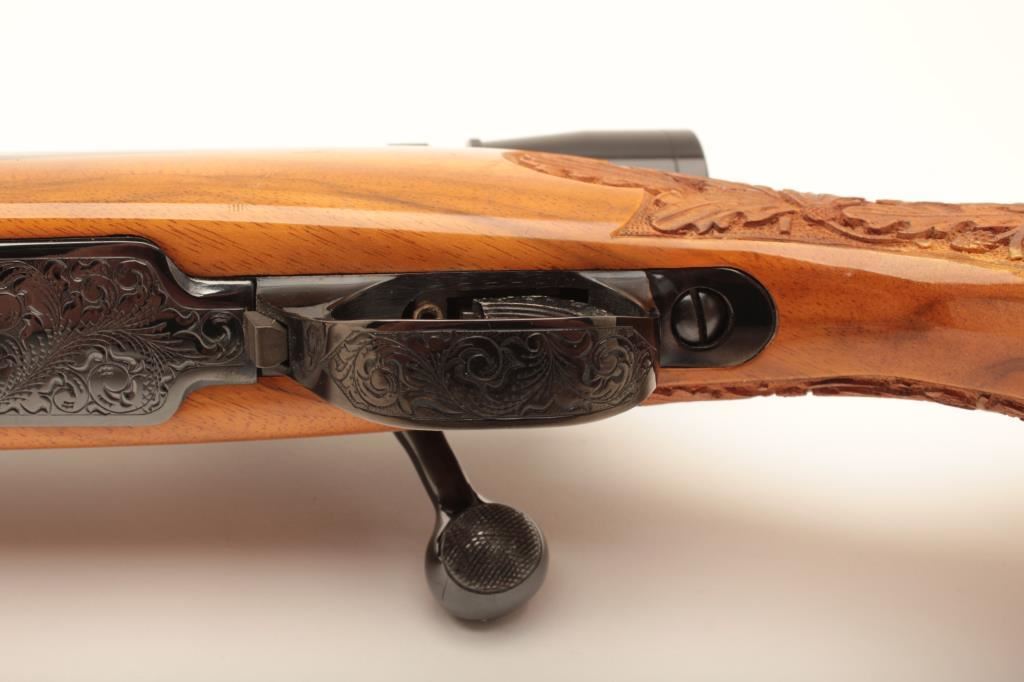 Custom Weatherby MK V bolt action rifle, .240 Weatherby caliber, Serial #H158463. The rifle is in fine overall condition with a 26” barrel. The barrel and receiver retain nearly all of their high polish blue finish with light wear at the muzzle. The receiver is marked, SOUTH GATE CALIF. MADE IN JAPAN”. The first third of the barrel and receiver have been beautifully engraved along with the trigger guard and magazine floor plate. Additionally, the rifle features a jeweled bolt and magazine follower. The bolt handled is checkered and a trigger shoe has been added. The finely checkered Walnut stock features ebony fore end and pistol grip, with custom Germanic style relief engraved oak and acorn ornamentation and inlay. A stylized gold tone escutcheon plate reading, “CEC” has been added at the fore end and a gold tone Whitetail buck embossed on the magazine plate. The butt stock ends with a ventilated rubber recoil pad providing a 13 ½” LOP. The rifle is topped with engraved mounts and scope rings and a Leupold Vari-X III 3.5 x 10 x 40 variable power rifle scope