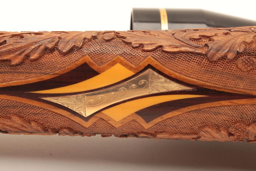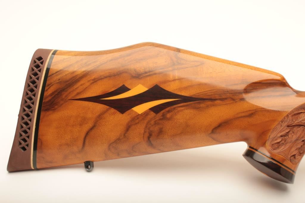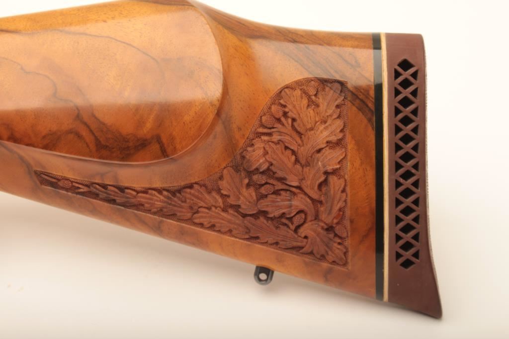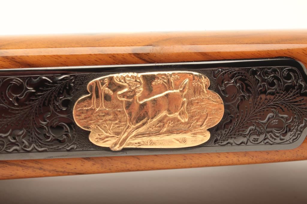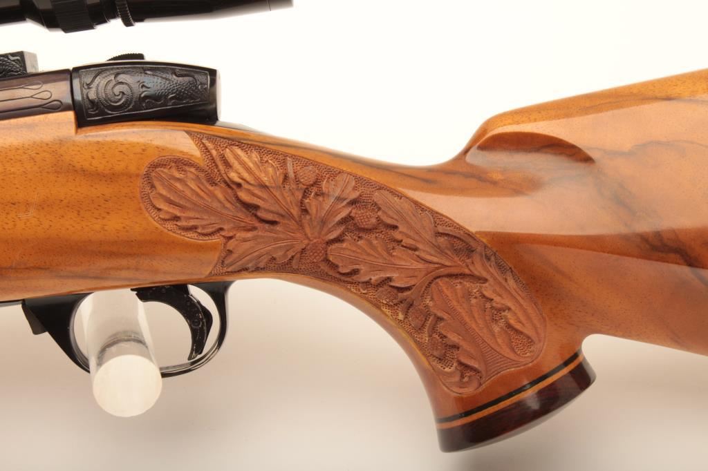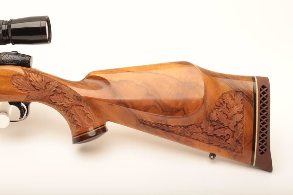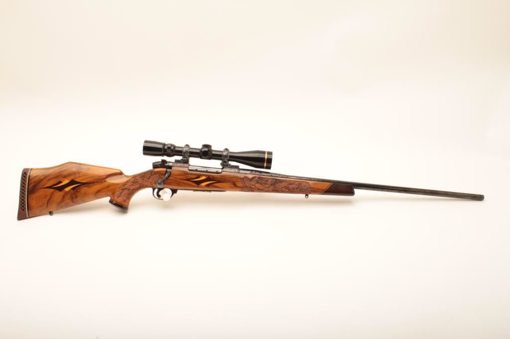 Custom Weatherby MK V bolt action rifle, .240 Weatherby caliber, Serial #H158463. The rifle is in fine overall condition with a 26” barrel. The barrel and receiver retain nearly all of their high polish blue finish with light wear at the muzzle. The receiver is marked, SOUTH GATE CALIF. MADE IN JAPAN”. The first third of the barrel and receiver have been beautifully engraved along with the trigger guard and magazine floor plate. Additionally, the rifle features a jeweled bolt and magazine follower. The bolt handled is checkered and a trigger shoe has been added. The finely checkered Walnut stock features ebony fore end and pistol grip, with custom Germanic style relief engraved oak and acorn ornamentation and inlay. A stylized gold tone escutcheon plate reading, “CEC” has been added at the fore end and a gold tone Whitetail buck embossed on the magazine plate. The butt stock ends with a ventilated rubber recoil pad providing a 13 ½” LOP. The rifle is topped with engraved mounts and scope rings and a Leupold Vari-X III 3.5 x 10 x 40 variable power rifle scope