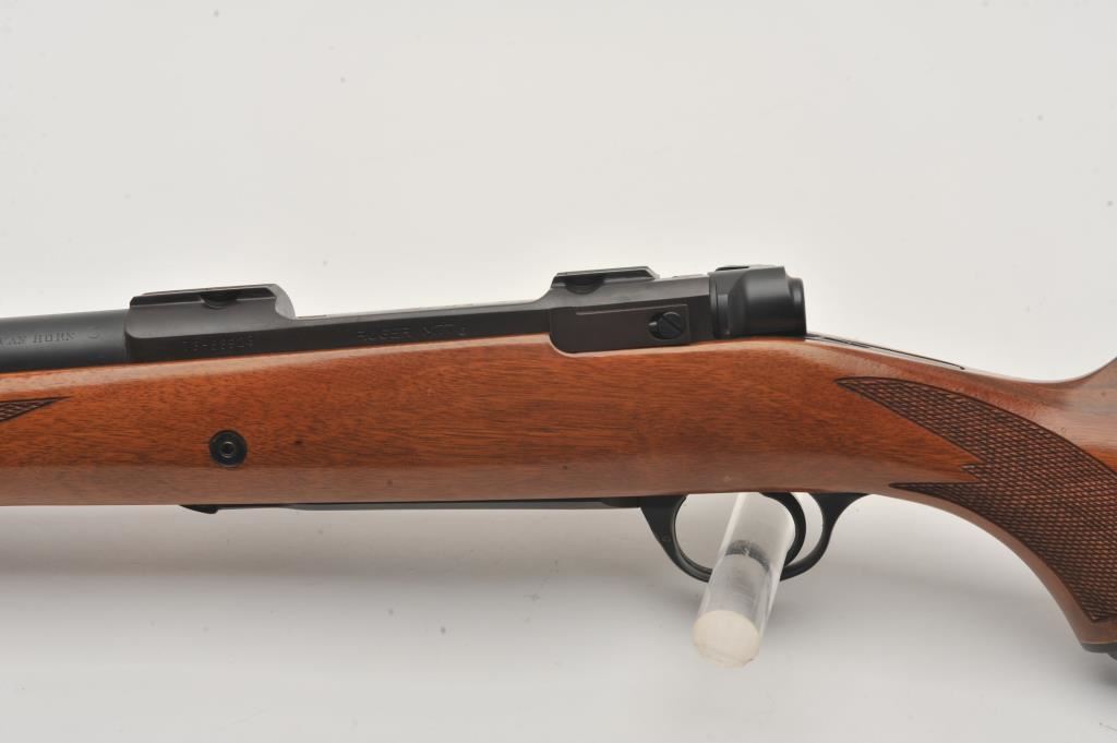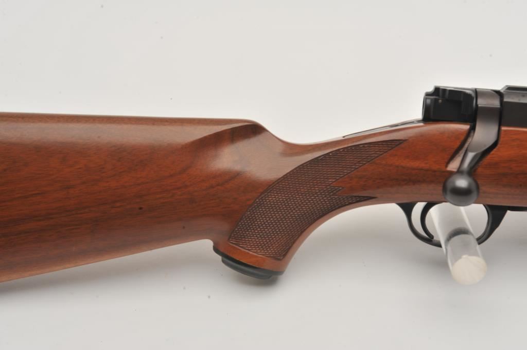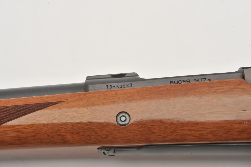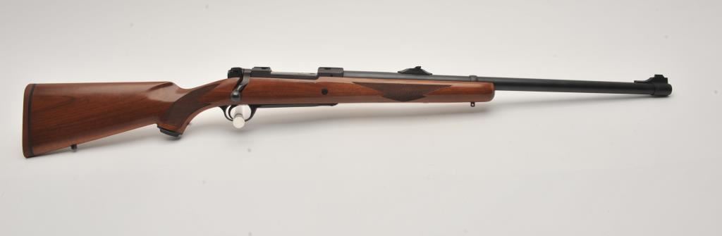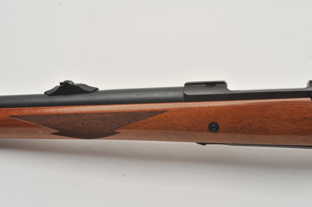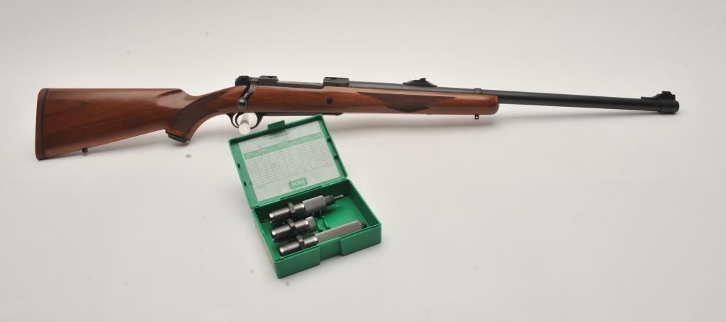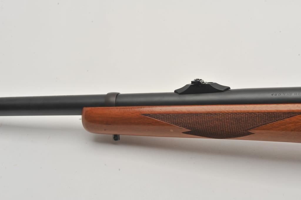 Custom Ruger M77 bolt action rifle, .460 Van Horn caliber, Serial #73-53923. The rifle is in fine overall condition with a 24” barrel with a barrel banded front and folding rear sights. The metal surfaces retain nearly all of their matte blue finish with light surface rust around the front sight. The checkered wood stock is in very good condition and ends with a solid red rubber recoil pad providing a 13 ¾” LOP. The bore is good, the action crisp and markings are sharp on this custom big bore. The .460 Van Horn cartridge is based on a shortened .460 Weatherby case. The lot includes custom RCBS reloading dies. Est.: $3,000-$6,000. (Modern).