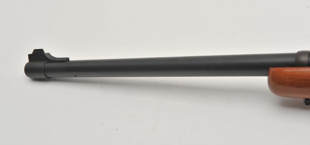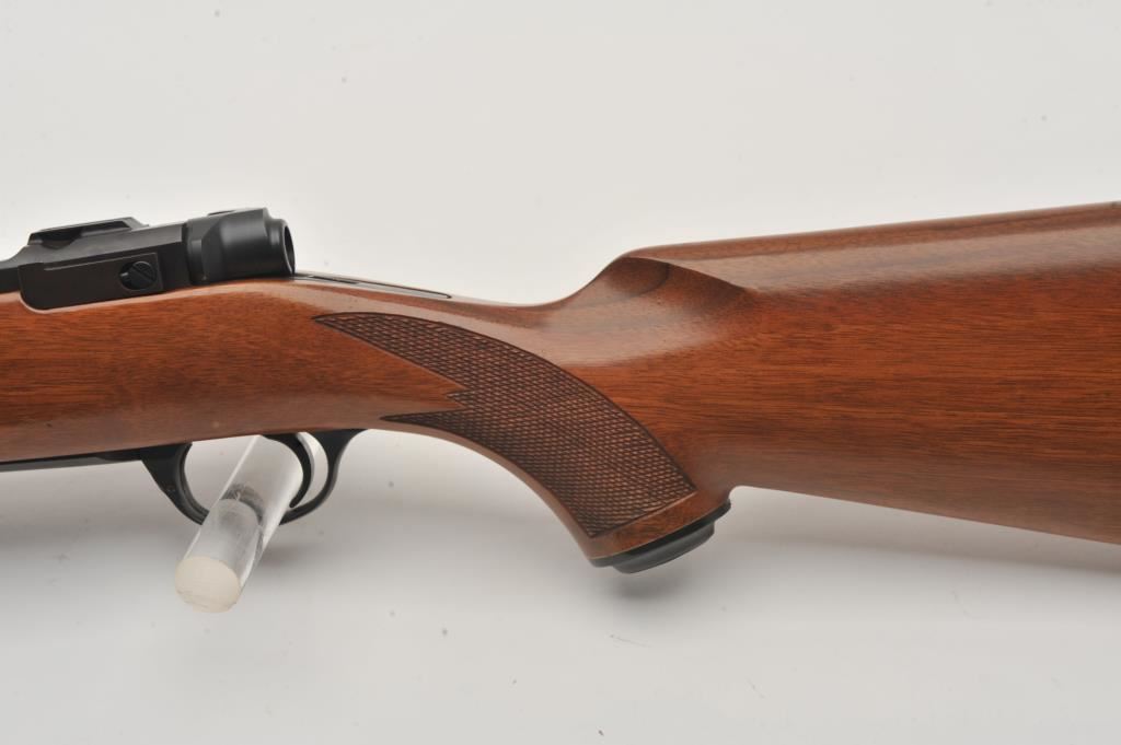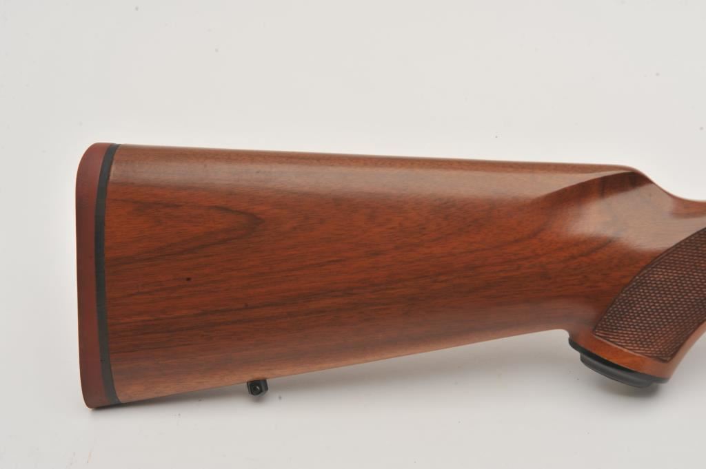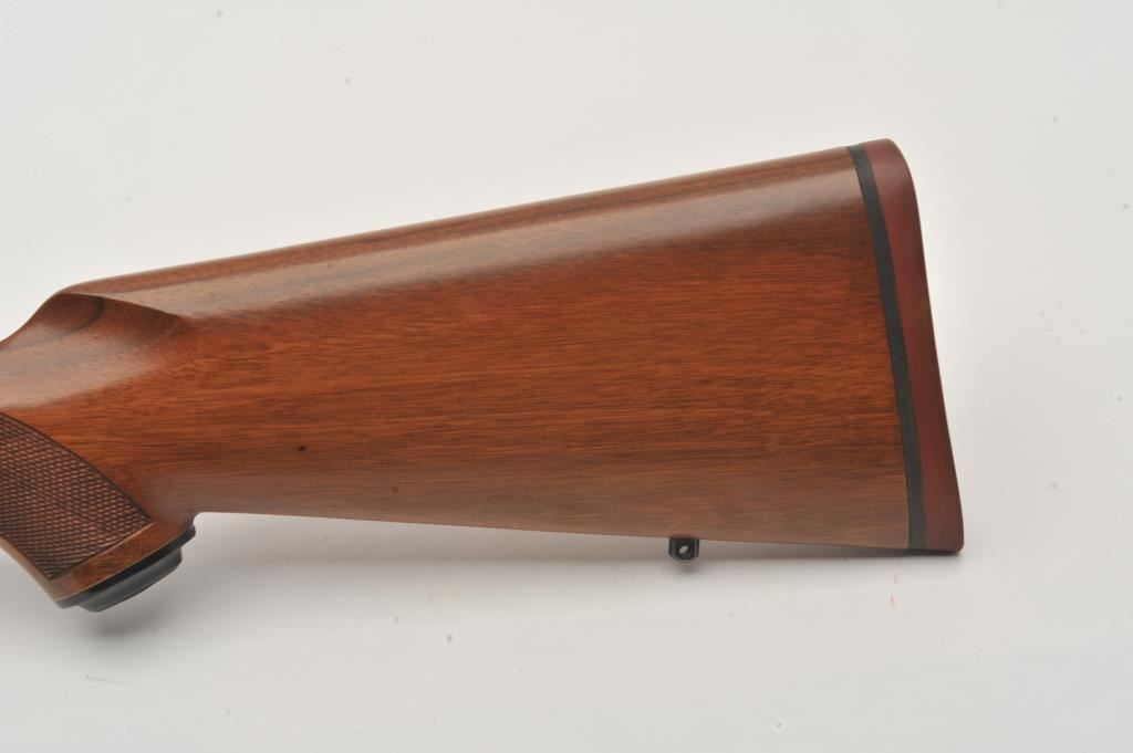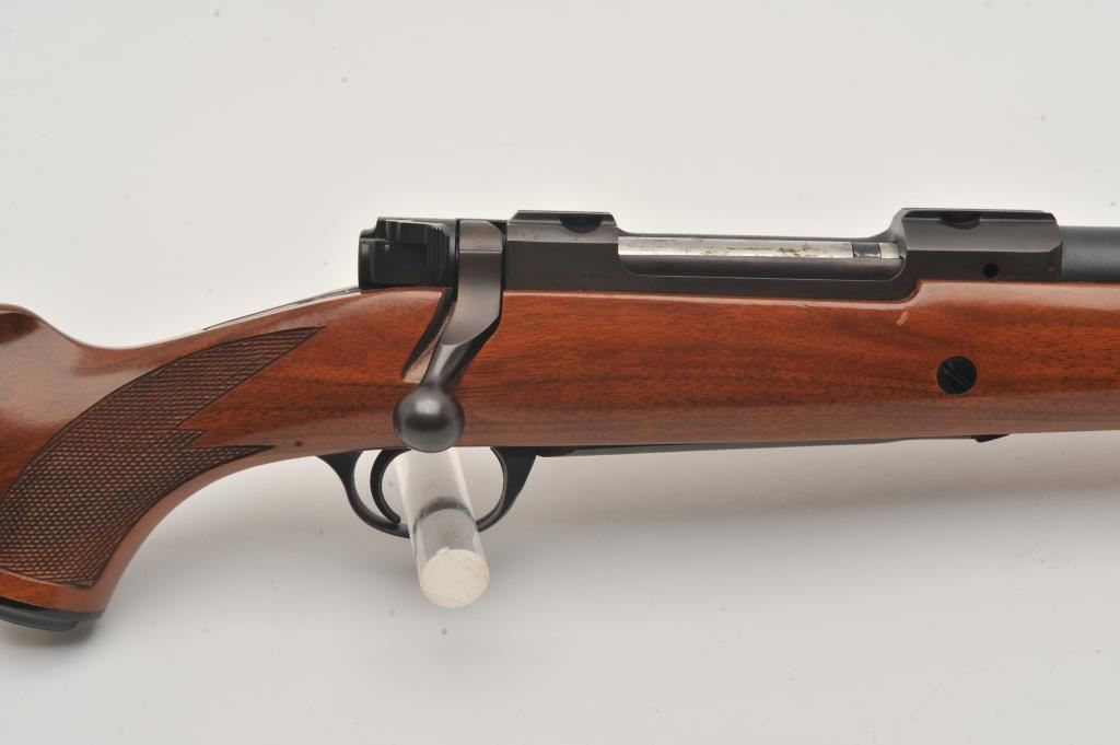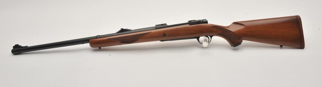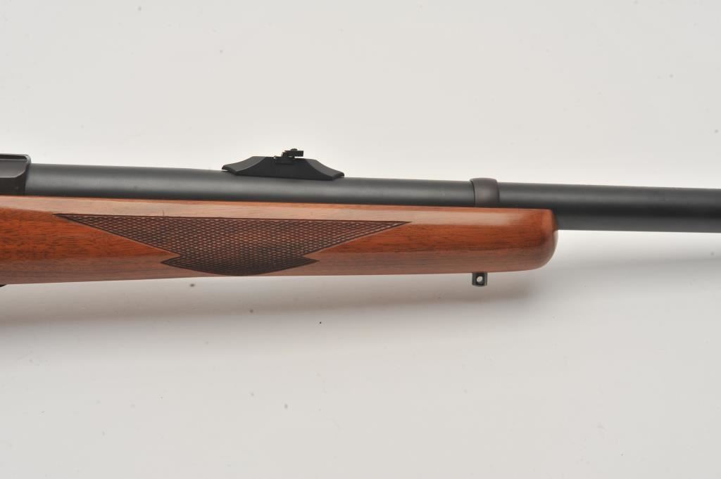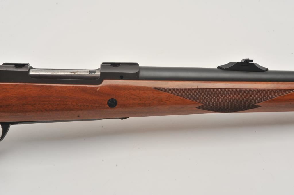 Custom Ruger M77 bolt action rifle, .460 Van Horn caliber, Serial #73-53923. The rifle is in fine overall condition with a 24” barrel with a barrel banded front and folding rear sights. The metal surfaces retain nearly all of their matte blue finish with light surface rust around the front sight. The checkered wood stock is in very good condition and ends with a solid red rubber recoil pad providing a 13 ¾” LOP. The bore is good, the action crisp and markings are sharp on this custom big bore. The .460 Van Horn cartridge is based on a shortened .460 Weatherby case. The lot includes custom RCBS reloading dies. Est.: $3,000-$6,000. (Modern).