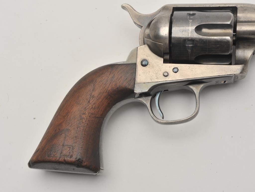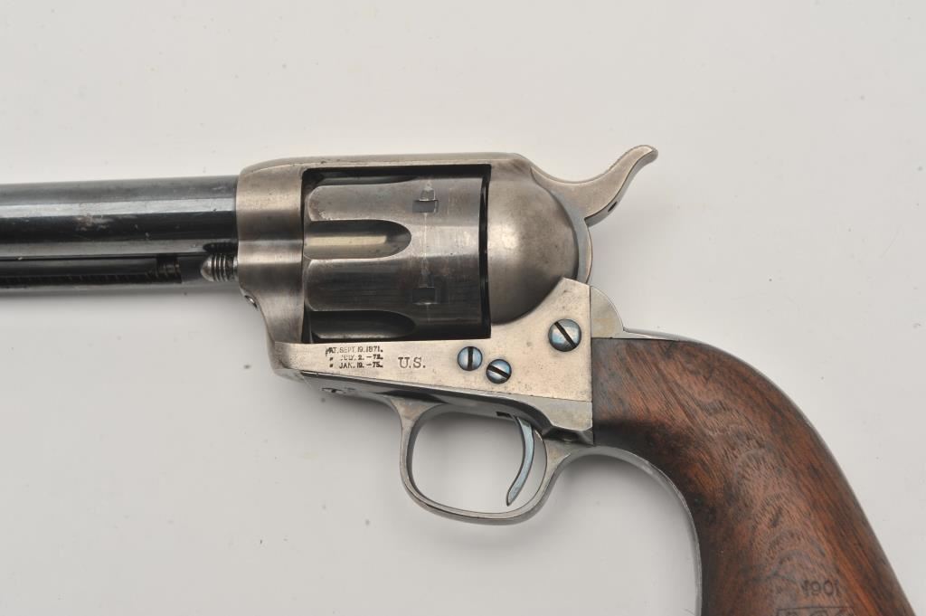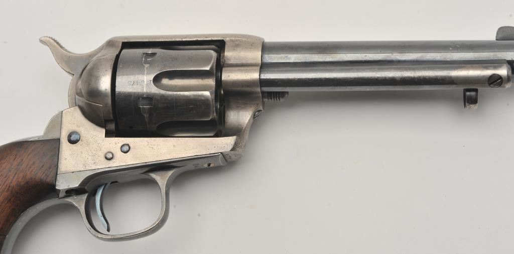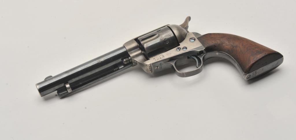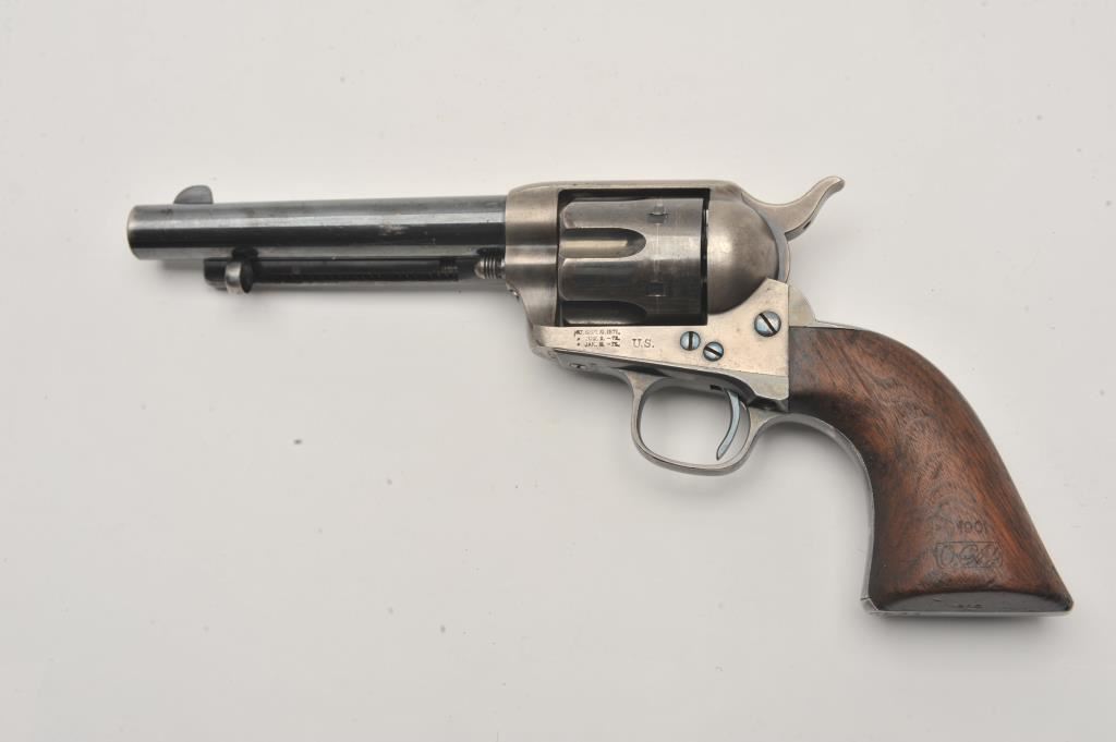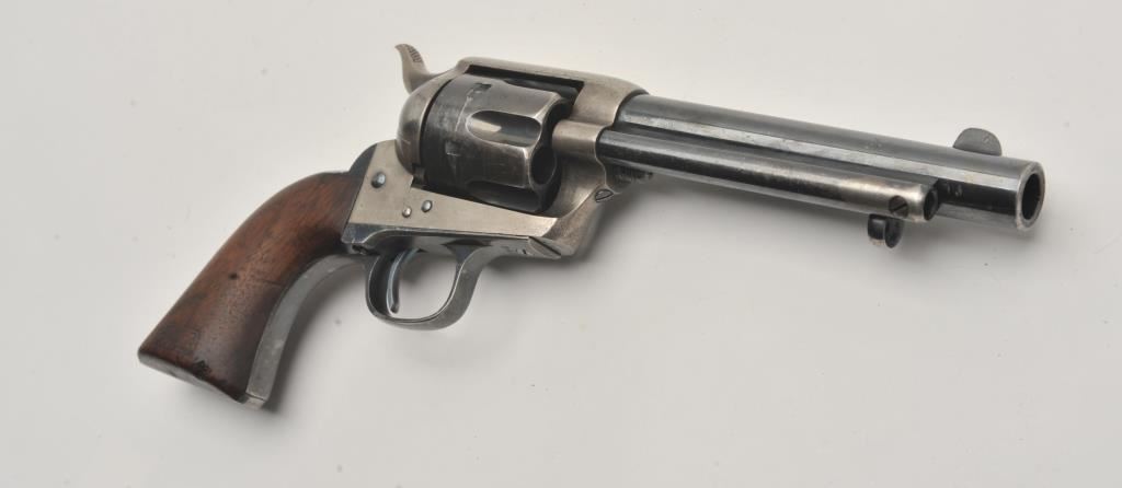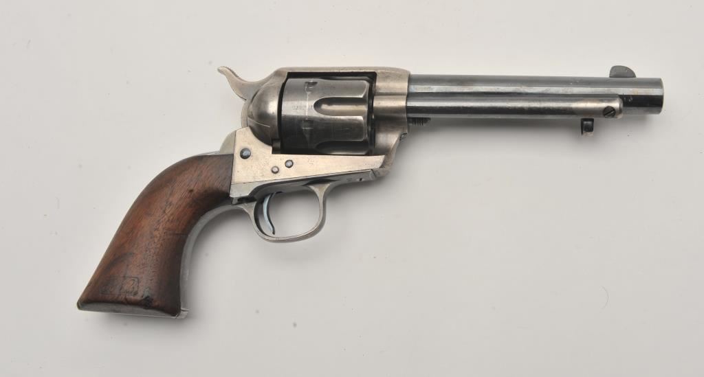 U.S. Colt Artillery Model SAA revolver, .45 caliber, 5.5” barrel, blued and case hardened finish, wood grips, S/N 95377 (frame); 84276 (trigger guard); 116504 (backstrap); 1_0475 (cylinder); 4553 (barrel); overall very good to near fine condition displaying majority of original blued finish to barrel assembly, straps and cylinder; traces of original case colors on frame with balance gone to silvery tone; crisp action, sharp markings, near fine bore and very good grips displaying 1901 date plus inspector’s cartouches (R.A.C. on right side of grip and O.C.H. on left side of grip). Accompanied by a Colt factory letter dated Sept. 7, 2004 indicating frame numbered gun sold to the U.S. Government and delivered to the Government Inspector at the Colt plant on July 20, 1883, in a lot of 150 guns; letter also notes the revolver was returned to the factory for refurbishing and subsequently reshipped to the Springfield Armory in Springfield, Mass. on December 21, 1901. (Antique). Est.: $2,500-$5,000.