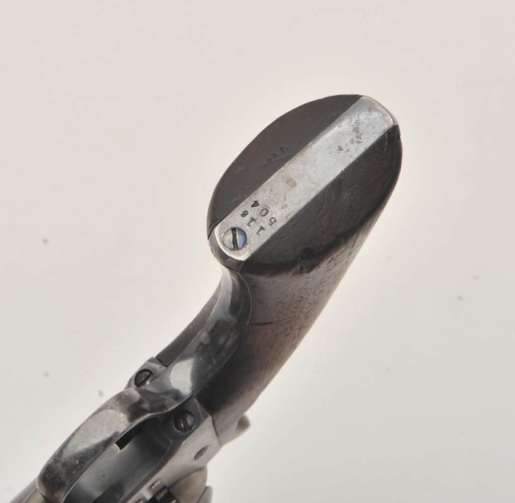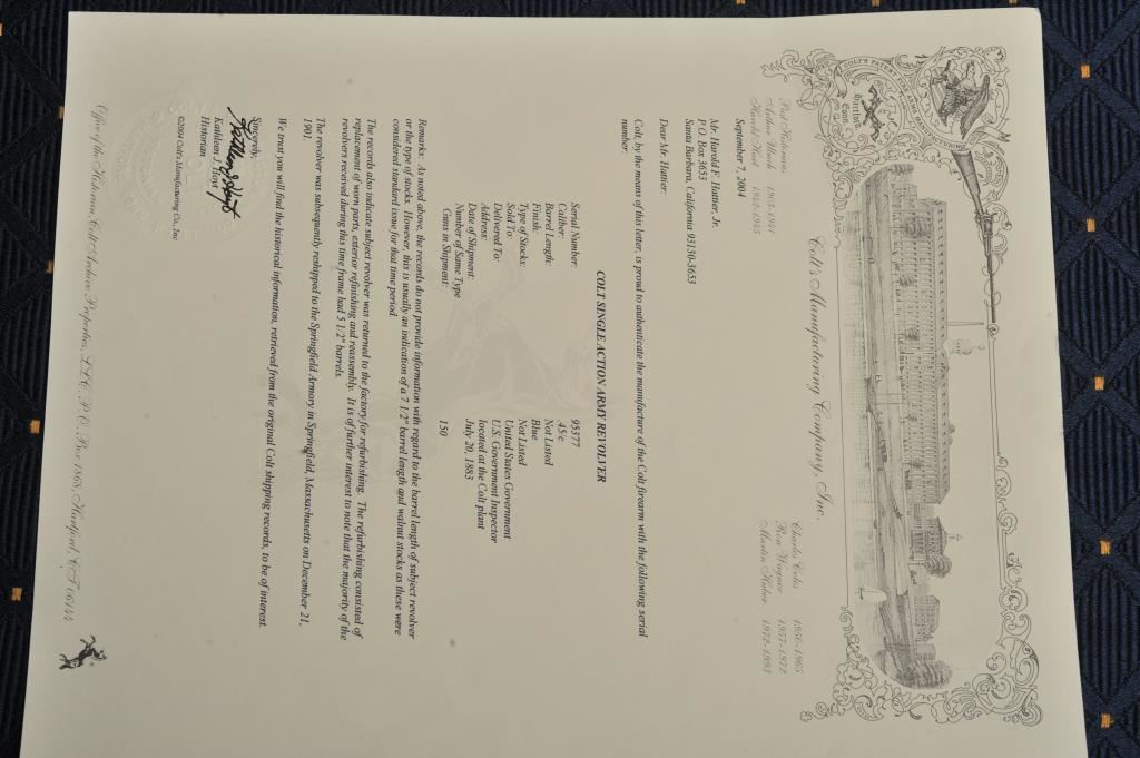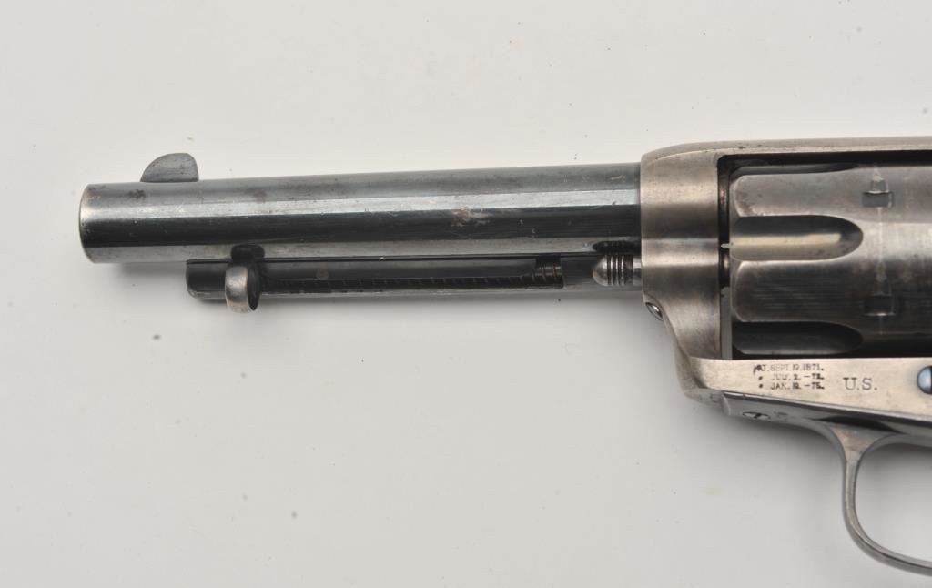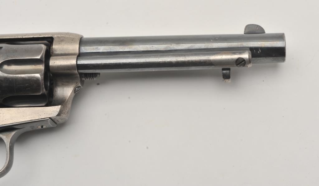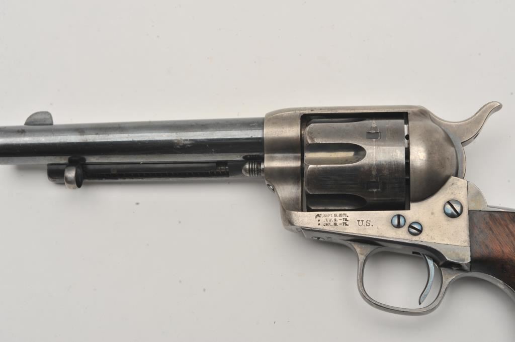 U.S. Colt Artillery Model SAA revolver, .45 caliber, 5.5” barrel, blued and case hardened finish, wood grips, S/N 95377 (frame); 84276 (trigger guard); 116504 (backstrap); 1_0475 (cylinder); 4553 (barrel); overall very good to near fine condition displaying majority of original blued finish to barrel assembly, straps and cylinder; traces of original case colors on frame with balance gone to silvery tone; crisp action, sharp markings, near fine bore and very good grips displaying 1901 date plus inspector’s cartouches (R.A.C. on right side of grip and O.C.H. on left side of grip). Accompanied by a Colt factory letter dated Sept. 7, 2004 indicating frame numbered gun sold to the U.S. Government and delivered to the Government Inspector at the Colt plant on July 20, 1883, in a lot of 150 guns; letter also notes the revolver was returned to the factory for refurbishing and subsequently reshipped to the Springfield Armory in Springfield, Mass. on December 21, 1901. (Antique). Est.: $2,500-$5,000.