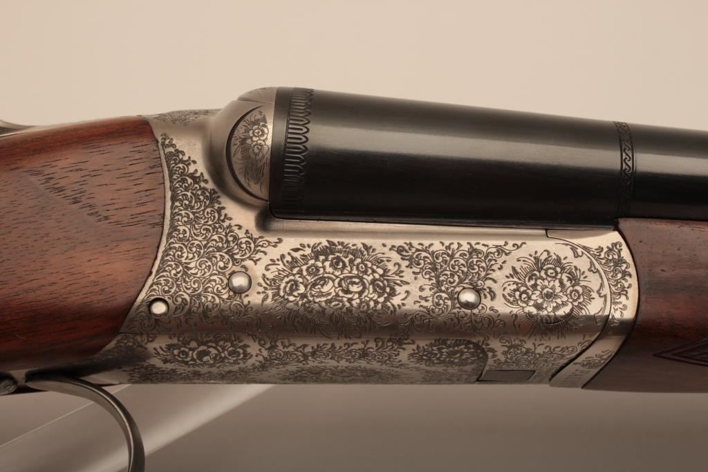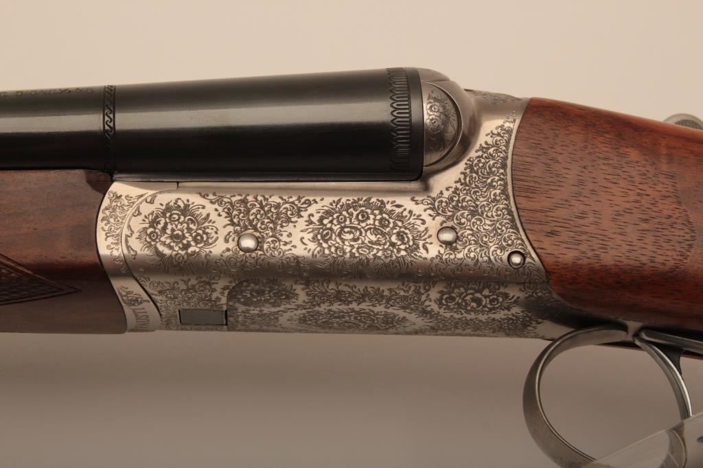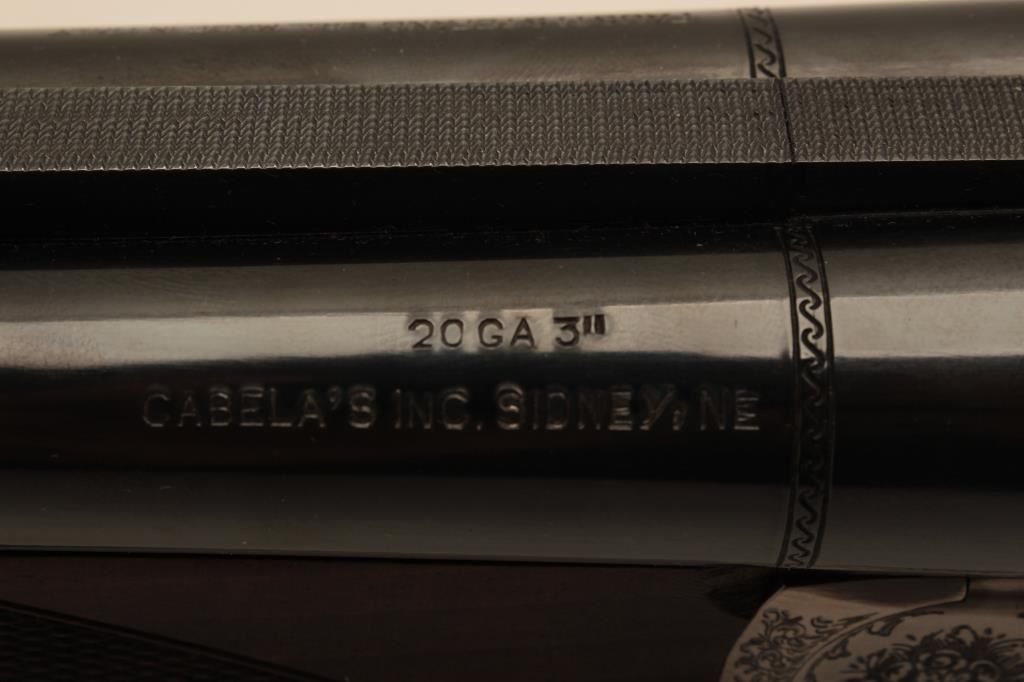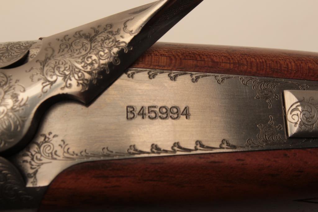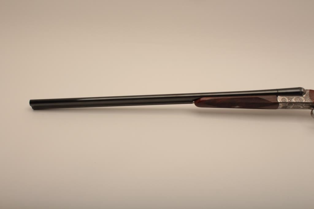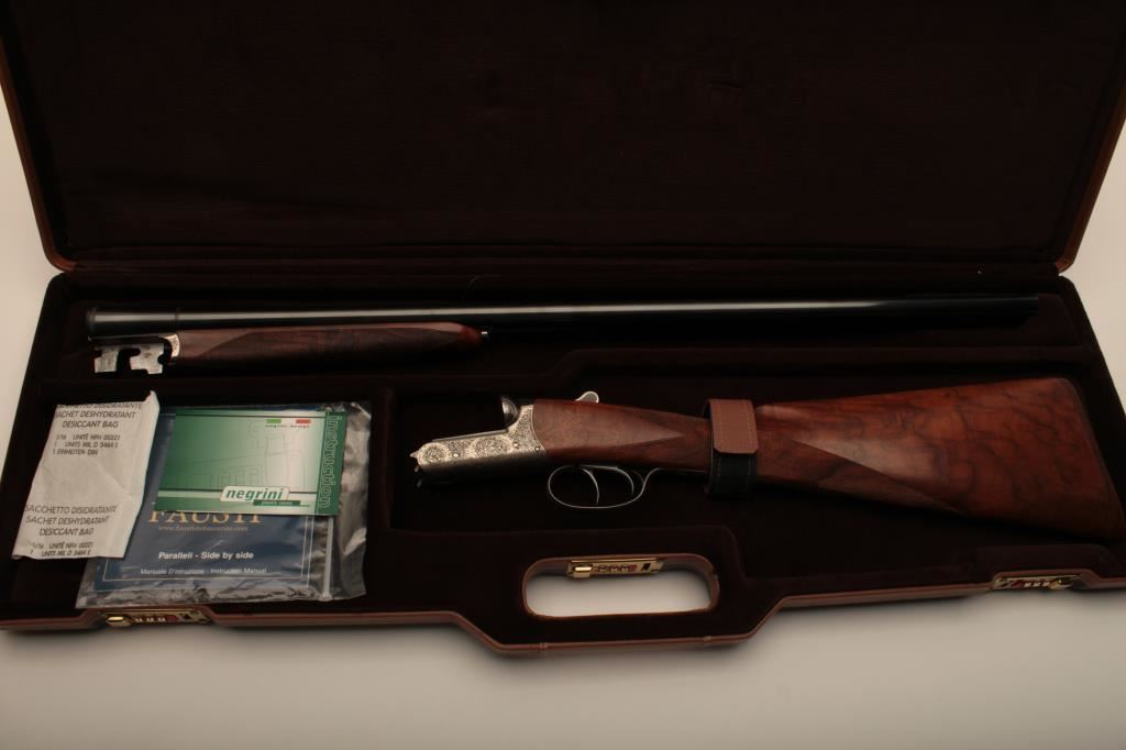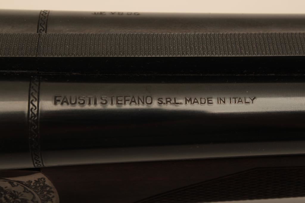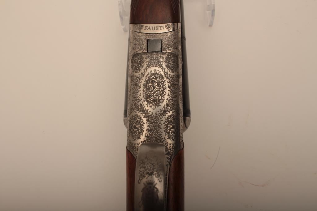 Fausti DEA SLX model SxS shotgun, #B45994, 20 Ga., 28" barrels with solid rib, finely engraved coin finished rounded receiver, double triggers, long tang with English stock and hard wood butt plate. Fine condition overall, bores are minty, action is crisp, stocks are fine showing crisp checkering and minimal handling marks. Barrels retain nearly all their original blue. Forend shows a minor chip where the barrels and receiver meet on the left side. (Modern) Est. $2750-5500