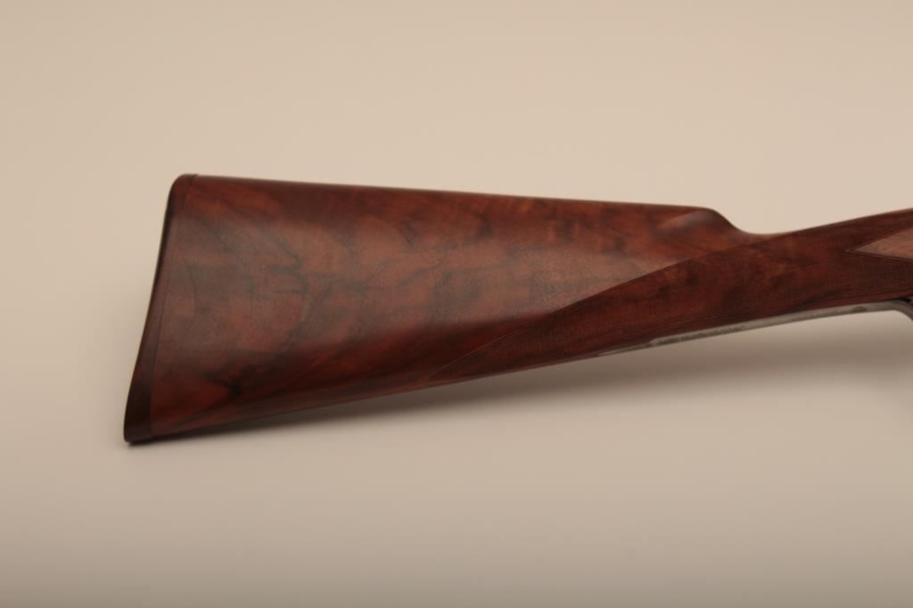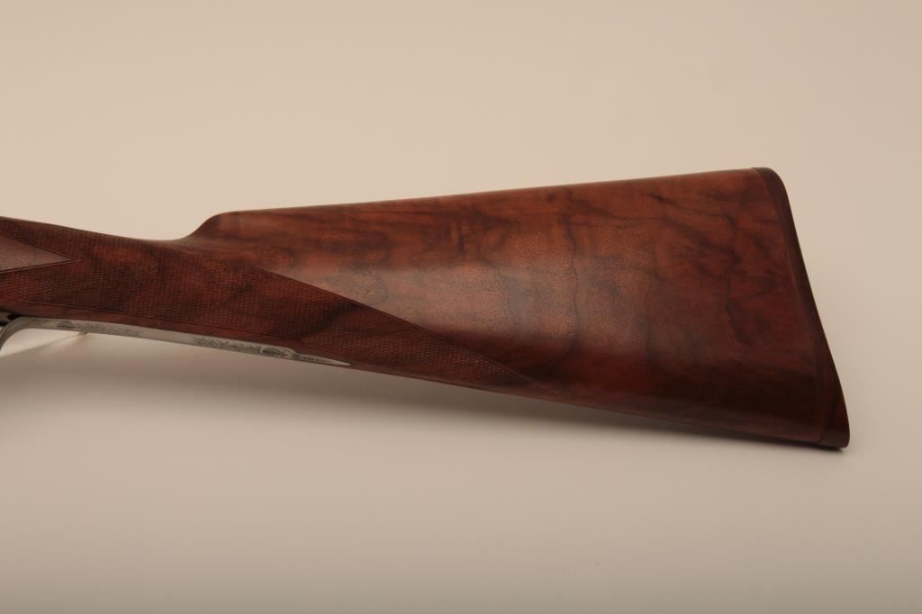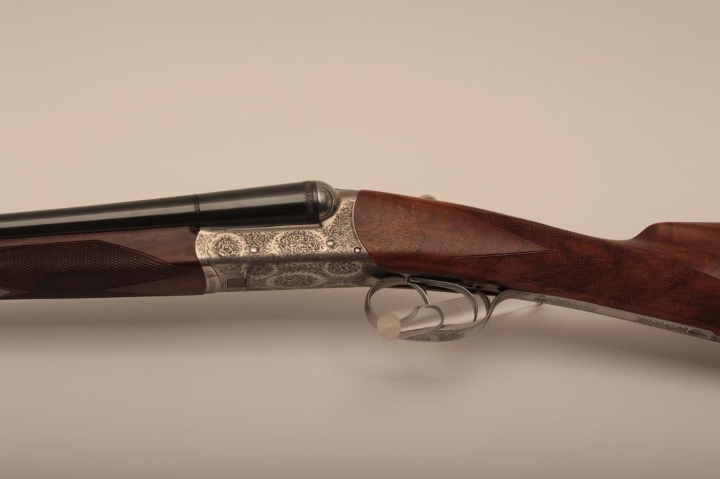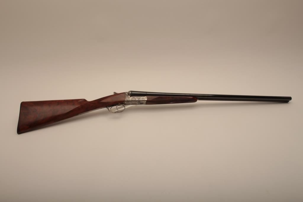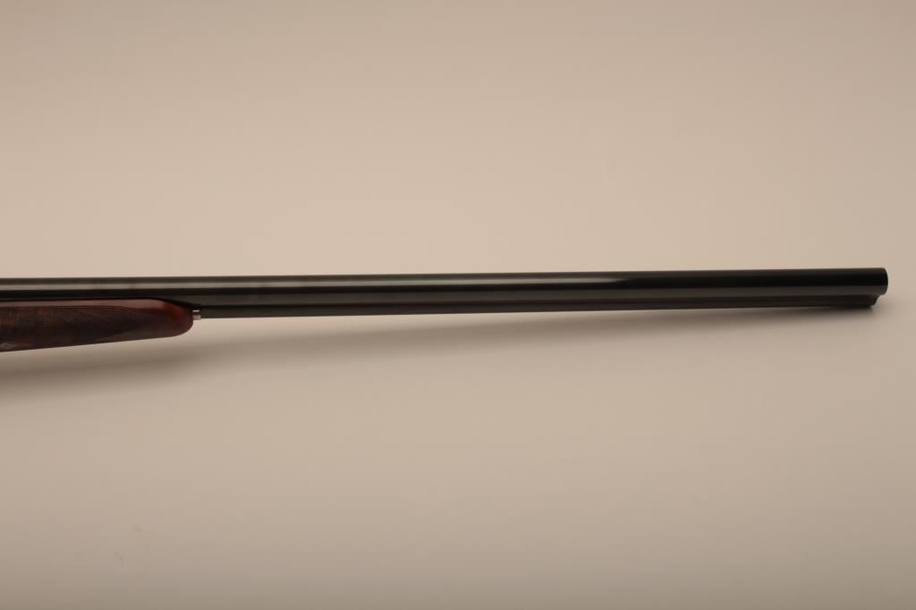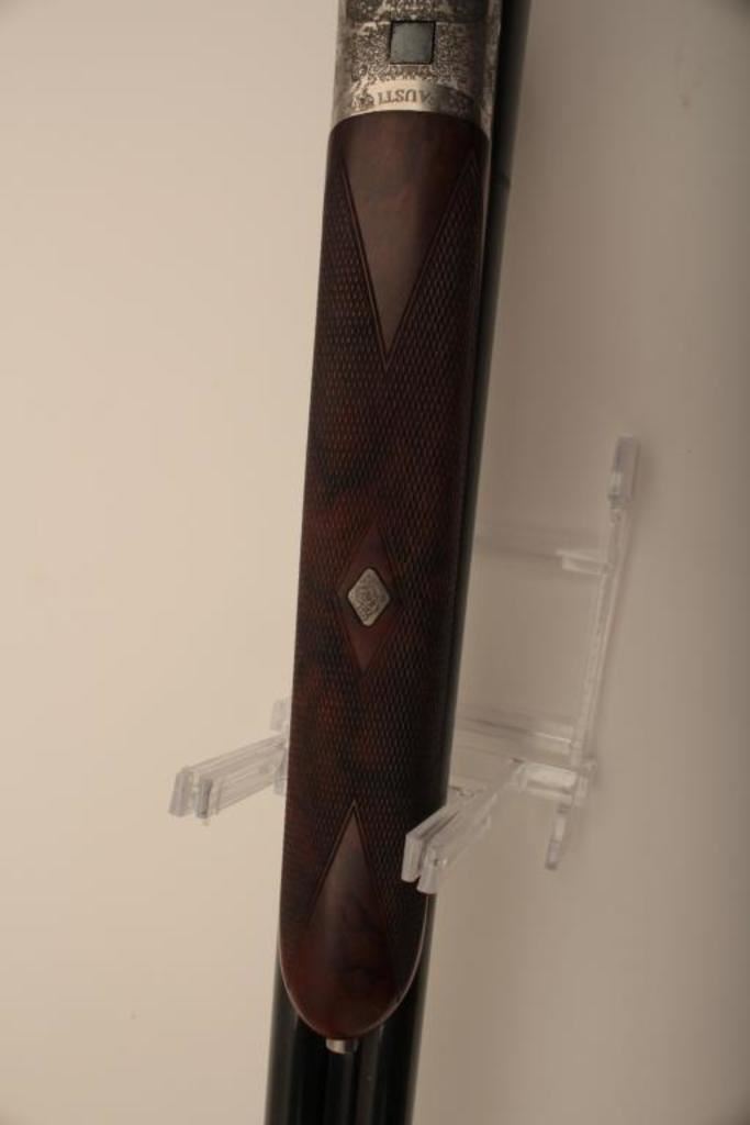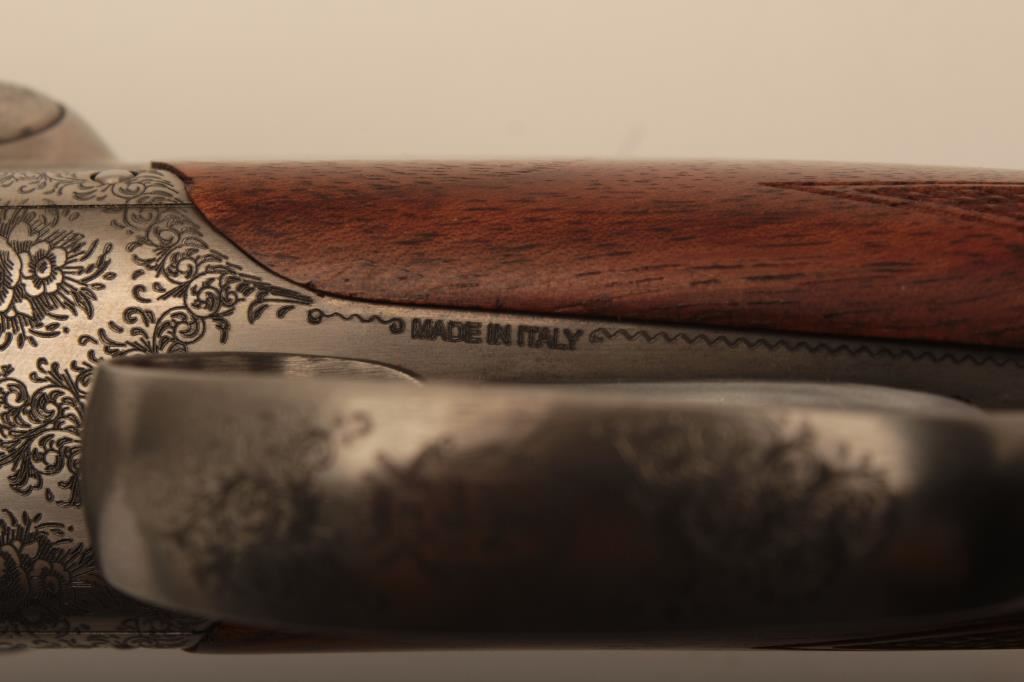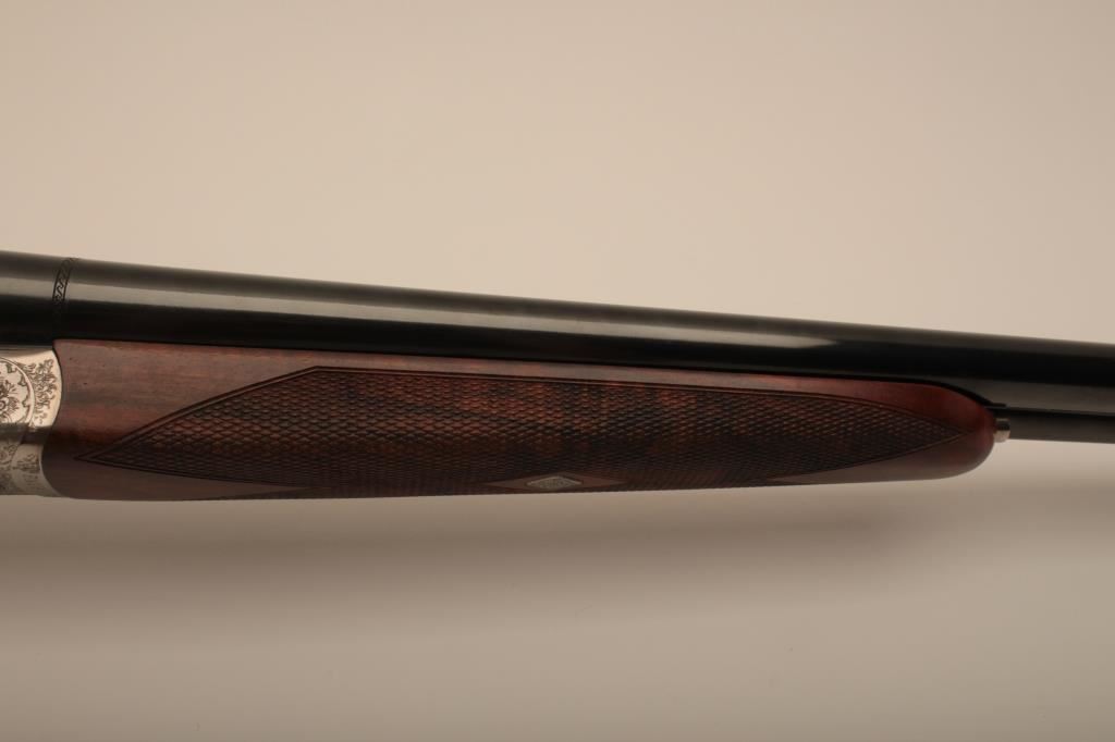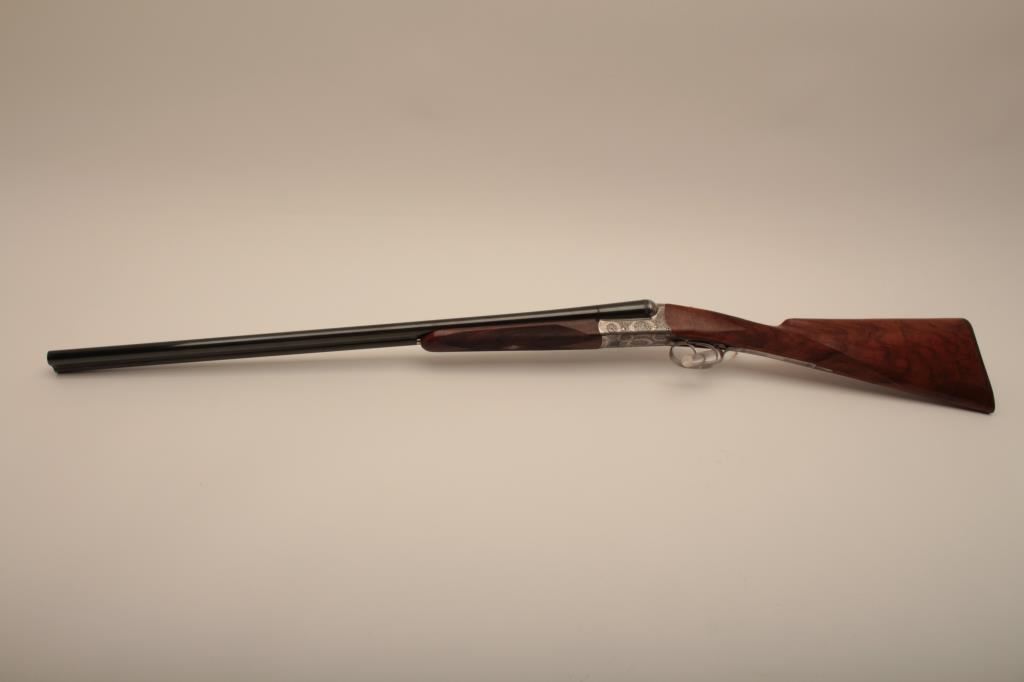 Fausti DEA SLX model SxS shotgun, #B45994, 20 Ga., 28" barrels with solid rib, finely engraved coin finished rounded receiver, double triggers, long tang with English stock and hard wood butt plate. Fine condition overall, bores are minty, action is crisp, stocks are fine showing crisp checkering and minimal handling marks. Barrels retain nearly all their original blue. Forend shows a minor chip where the barrels and receiver meet on the left side. (Modern) Est. $2750-5500