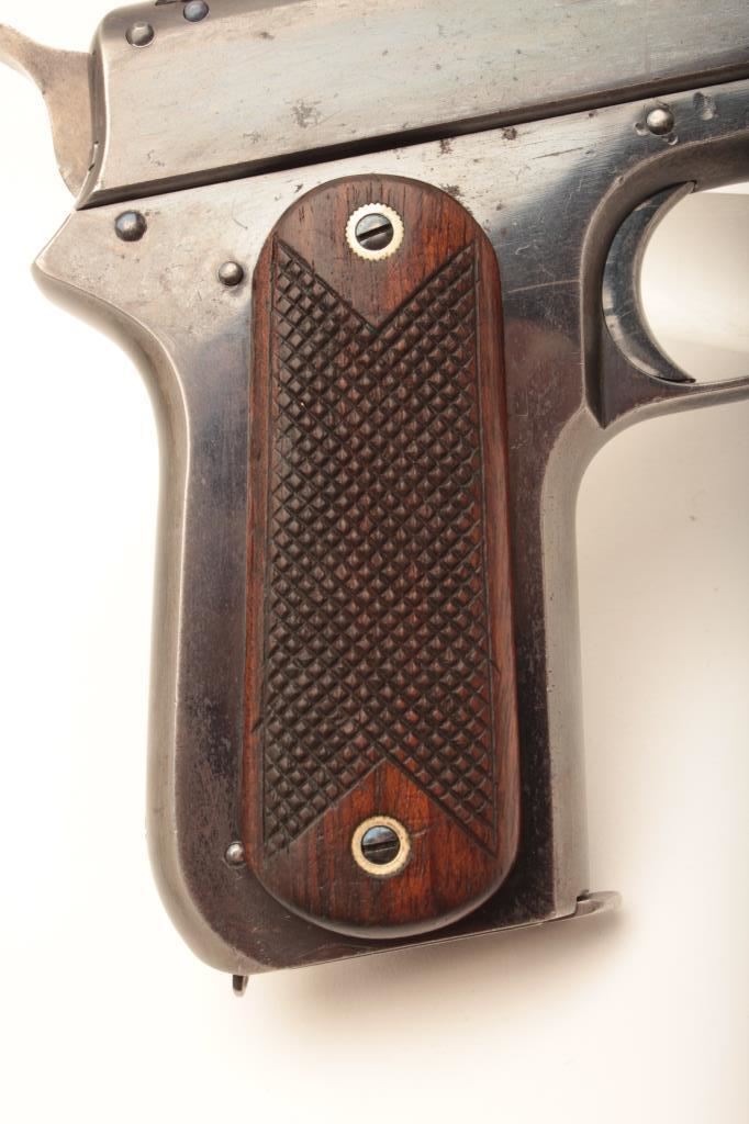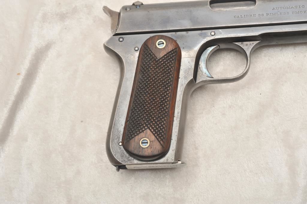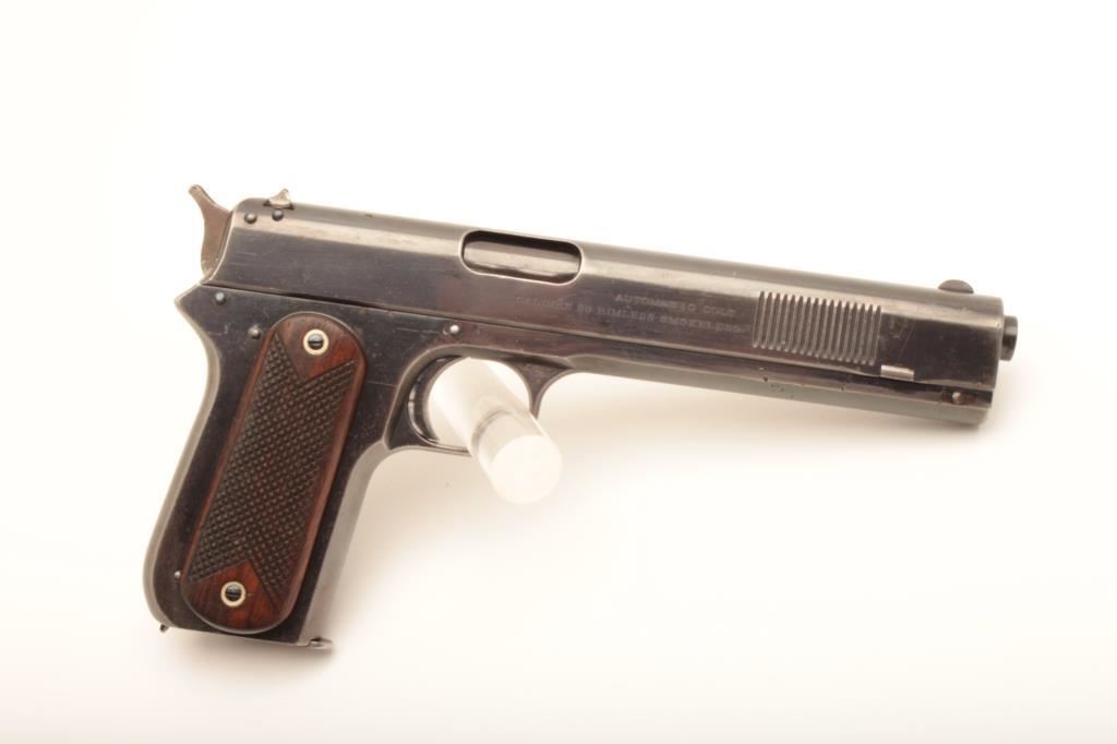 Colt Model 1900 second army contract U.S. marked and factory converted “Sight Safety” S/N 1614. One of only 200 produced and delivered to U.S. military in 1901. .38 A.C.P. caliber with checkered wood grips, forward slide serrations, large U.S. on front of left trigger guard bow, R.A.C. inspections on right. Very good plus original condition with 75%-85% original blue remaining, minor erosion and slight scratches, shows some minor carry and use along with just natural aging. The grips are crisp and also very good plus with bright blue on screws. Most case colors on hammer. Bright bore and pristine interior. Patent dated nickel plated magazine correct to this issue. One of the rarest of all Colt martially issue semi-auto pistols and a completely authentic collector’s quality example. (Refer: William A. Goddard’s book “The Government Model” page 54-55 and illustration #46 for similar example). (C&R/PPT) Est.: $7,500-$15,000
