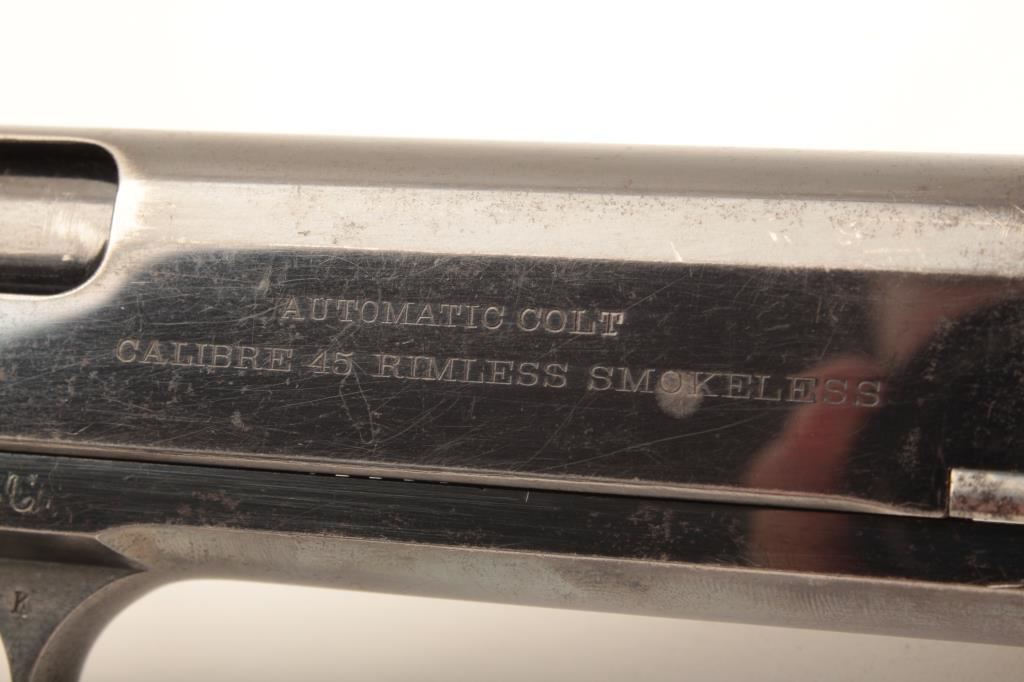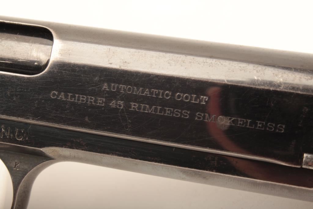 Colt Model 1905 .45 A.C.P. Semi-Auto pistol S/N 4298 originally shipped to George Worthington & Co., Cleveland, Ohio, Jan 12, 1910, 1 gun in shipment. Also showing 2 ordnance stamps on right side of frame above trigger and stamped F.N.C. The stamping shows crossed cannons with flaming bomb with cascabels on cannon (Refer article “Man at Arms” magazine included discussing this type marking on Colt pistols Feb 1995). The author discussed dual ordnance stampings on 1917 revolvers and a Colt .380 converted to .32. This type markings is found on Colt .25, .32, and .380 pistols made after 1940 usually with no other inspector’s markings. This Colt remains in very good plus condition with 75%-85% bright original commercial blue finish remaining showing even loss and patina at areas of gripping and muzzle. Sharp markings. Bright blue on trigger and most case colors on hammer. Good plus overall with correct magazine. The grips are also good with slight wear at buttons from carry and use. A very interesting 1905 with intriguing F.N.C. stamp and ordnance markings indicating