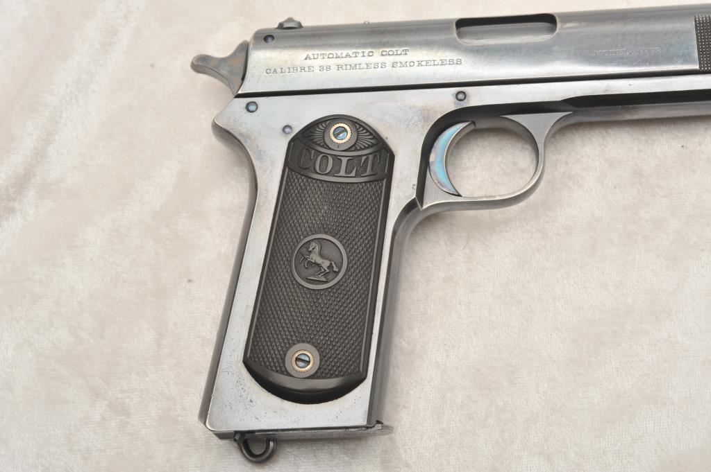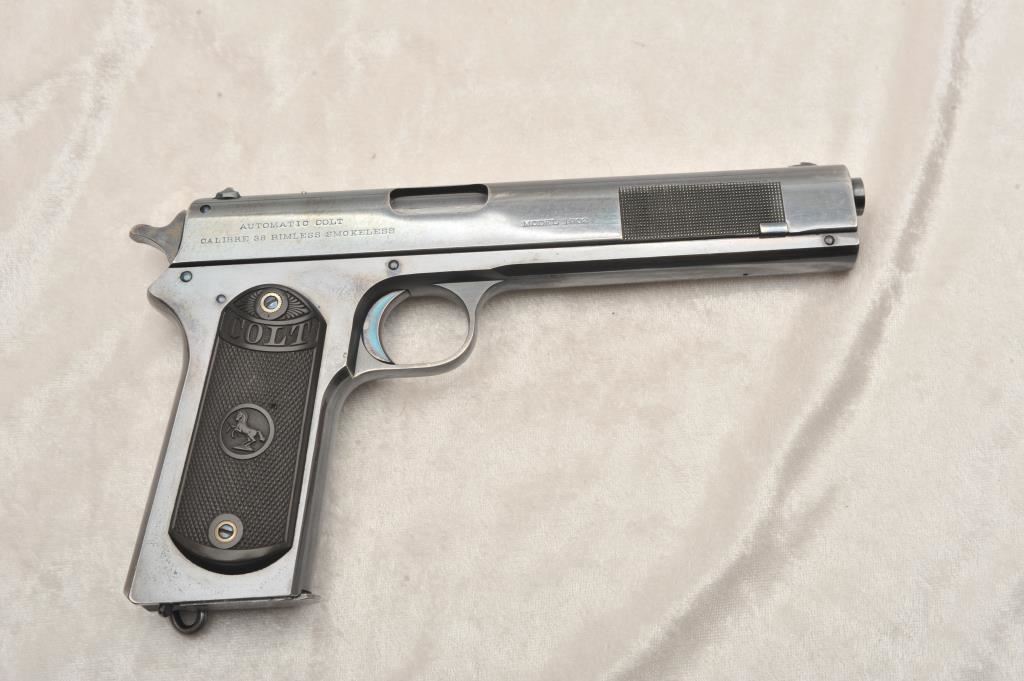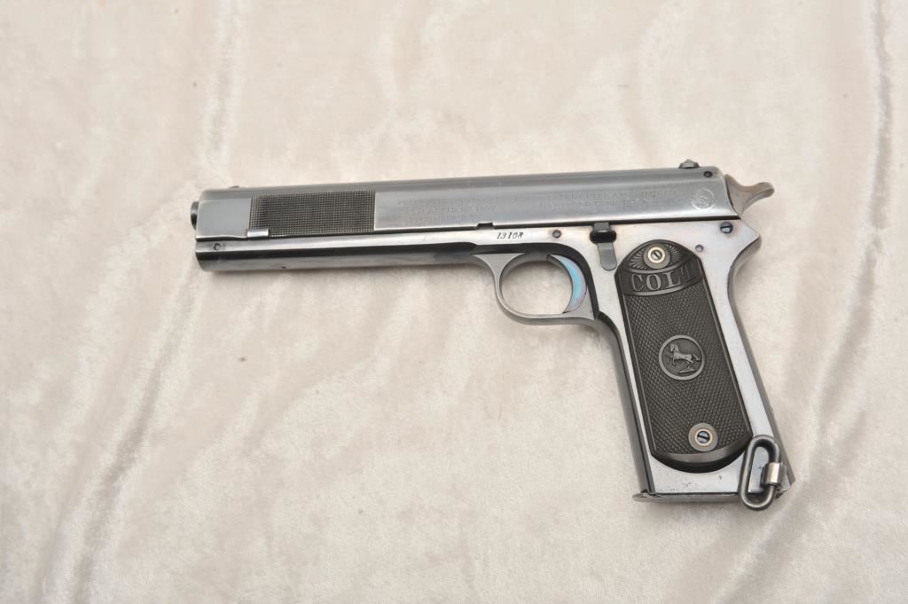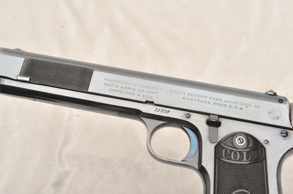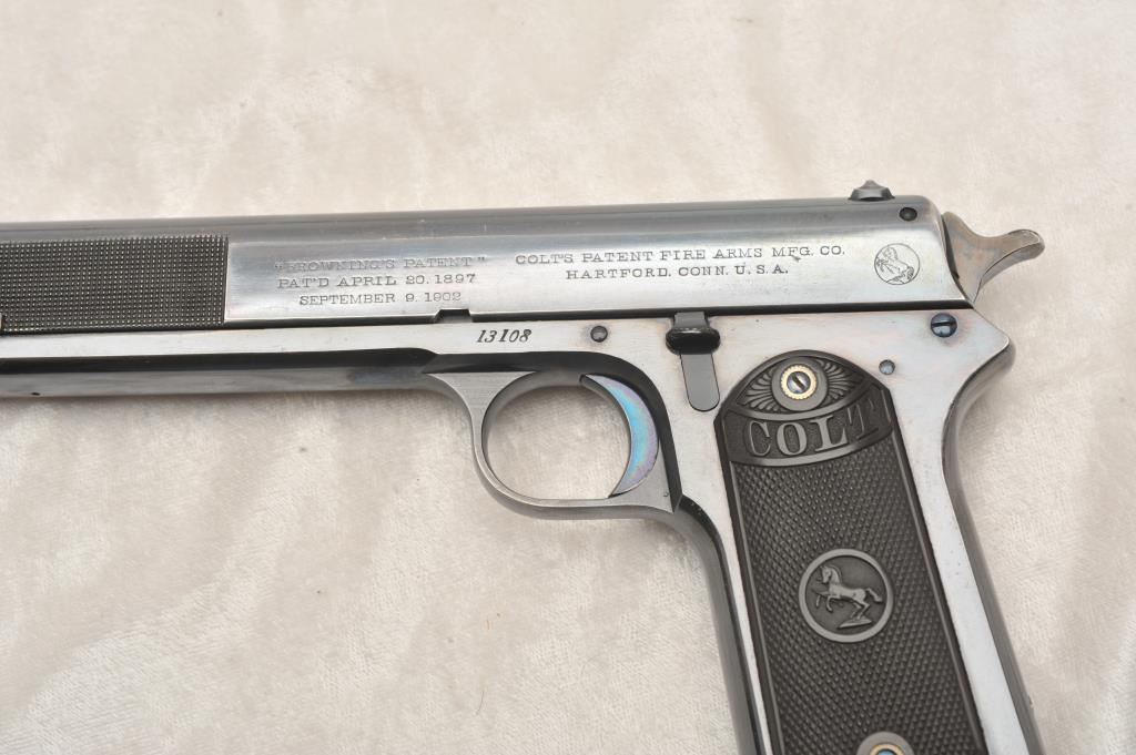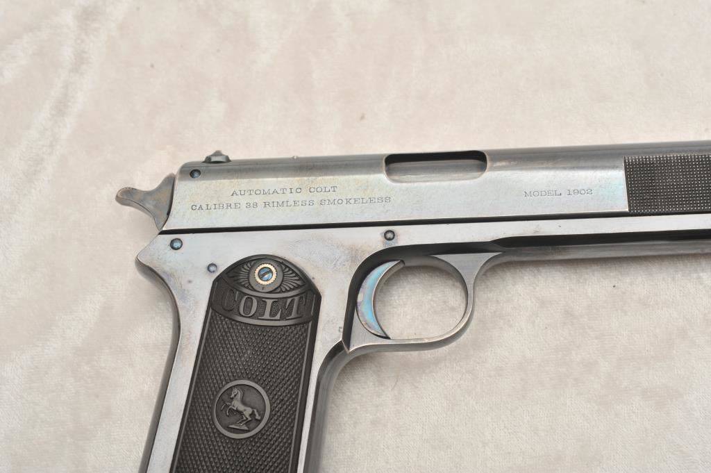 Colt Model 1902 Military Model .38 A.C.P. Caliber Semi-Auto with early “Nail File” forward slide knurling, S/N 13108. This early auto retains 90%-95% of its original high polish and bright blue finish showing slight losses and high points, edges and gripping areas. Crisp markings. Brilliant blue and small parts and strong case colors on hammer. Excellent grips. Excellent and bright bore. Magazine shows patent dates and bright original blue on bottom almost all intact. A 9 plus on a 1-10 scale. (C&R/PPT) Est.: $3500-$7000