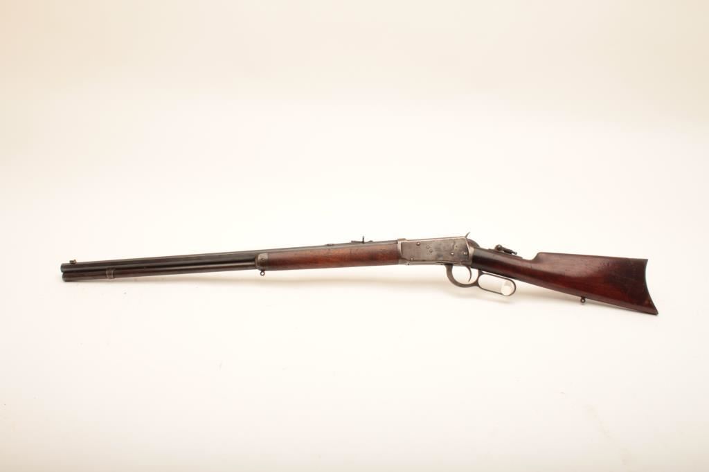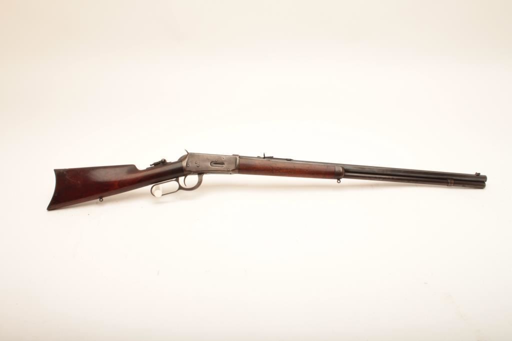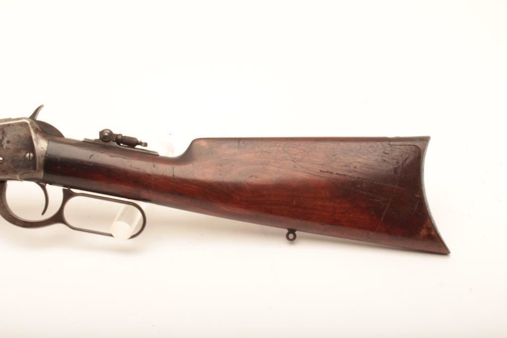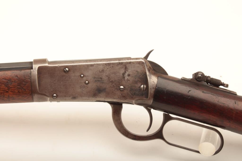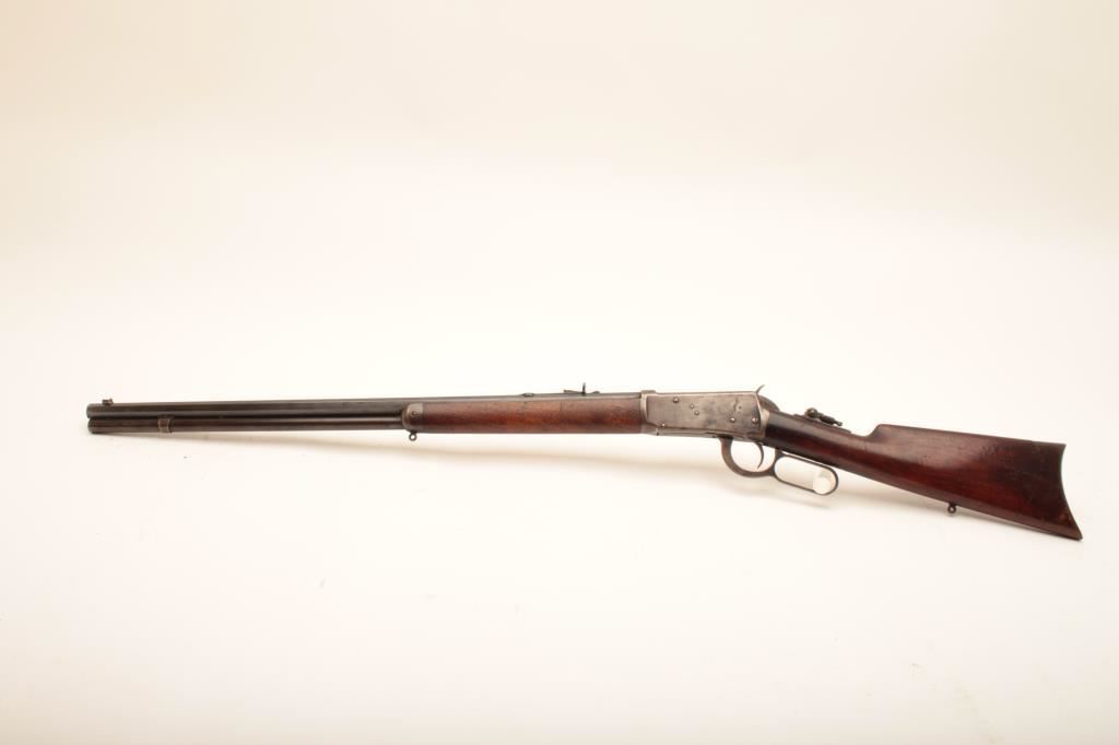 Winchester Model 1894 lever action rifle, .30 W.C.F. caliber, 26” octagon barrel, blued finish, wood stocks, adjustable flip-up tang sight and flip-up front sight, S/N 37516; overall good to very good condition showing considerable blued finish on barrel with some scattered spots of pitting on mid right area of loading tube, good bore, crisp action, sharp markings and good wood stocks (stock stamped “Company ‘A’ Santa Barbara Sharpshooters, N. Brokenridge”. Accompanied by a factory letter confirming caliber, barrel shape, plain trigger and indicating received in warehouse on March 21, 1898 and shipped from warehouse on April 12, 1898, order number 7124. (Antique). Est.: $750-$1,500.