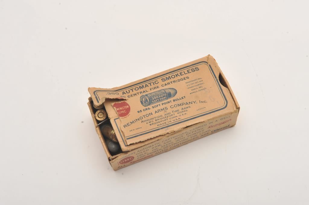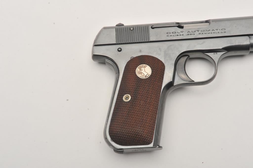 Colt Model 1908 .380 caliber Semi-Auto pistol in original excellent condition contained within original box, S/N 85796. Made 1927 during height of prohibition era in “roaring twenties”. This Colt shows 99% plus bright original blue with original bright polish on muzzle and barrel. Pristine interior and bright bore. Excellent medallion wood grips. Correct and excellent magazine. Very slight evidence of operation on trigger only. Original box with serial number and end labels. Manuel and literature included. A 9.5 on a 1-10 scale. (C&R/PPT) Est.: $1750-$3500