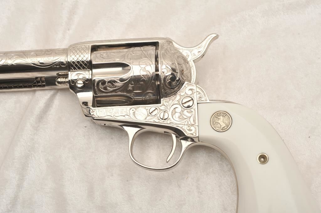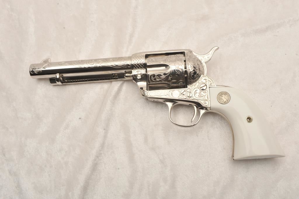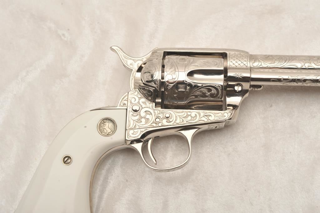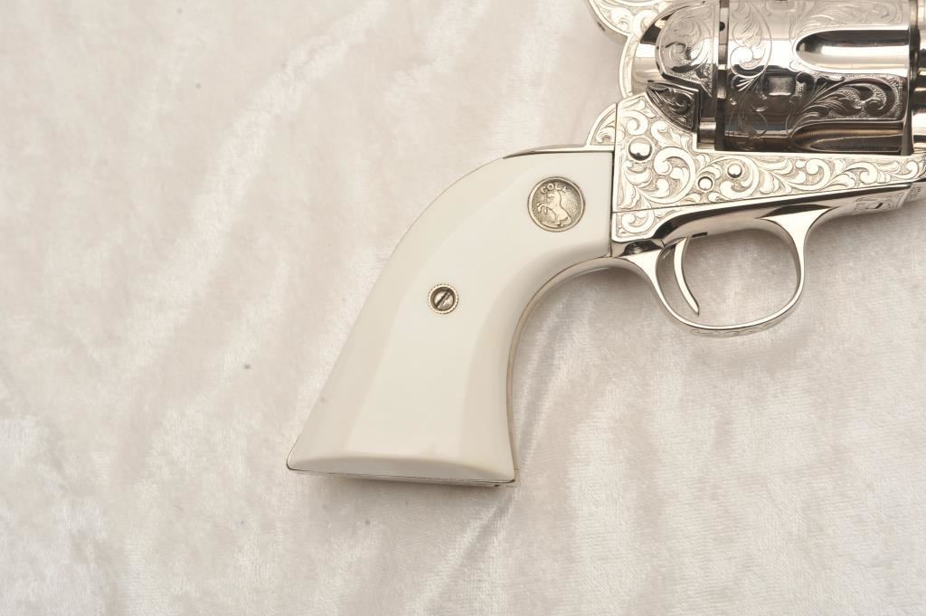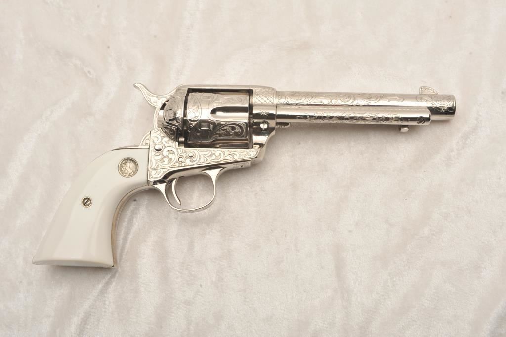 Colt Single Action Army revolver in .32-20 caliber with a 5 ½ā barrel, custom engraved, faux ivory medallion grips, S/N 275644 and made about 1906. This Colt shows a Germanic scroll engraving reminiscent of classic Germanic engravers with Helfricht style checkerboard and āDā coverage having engraved hammer and front sight. The pistol was refinished and restored correctly retaining patent dates and all markings. Also matching serial numbers. The action and bore are good. A nice looking 1st gen that shows good quality embellishments. (C&R/PPT) Est.: $3500-$7000
