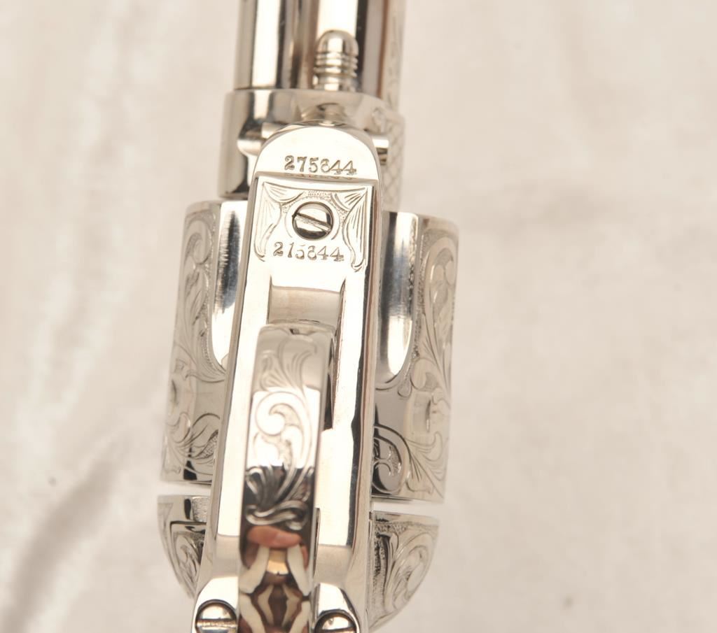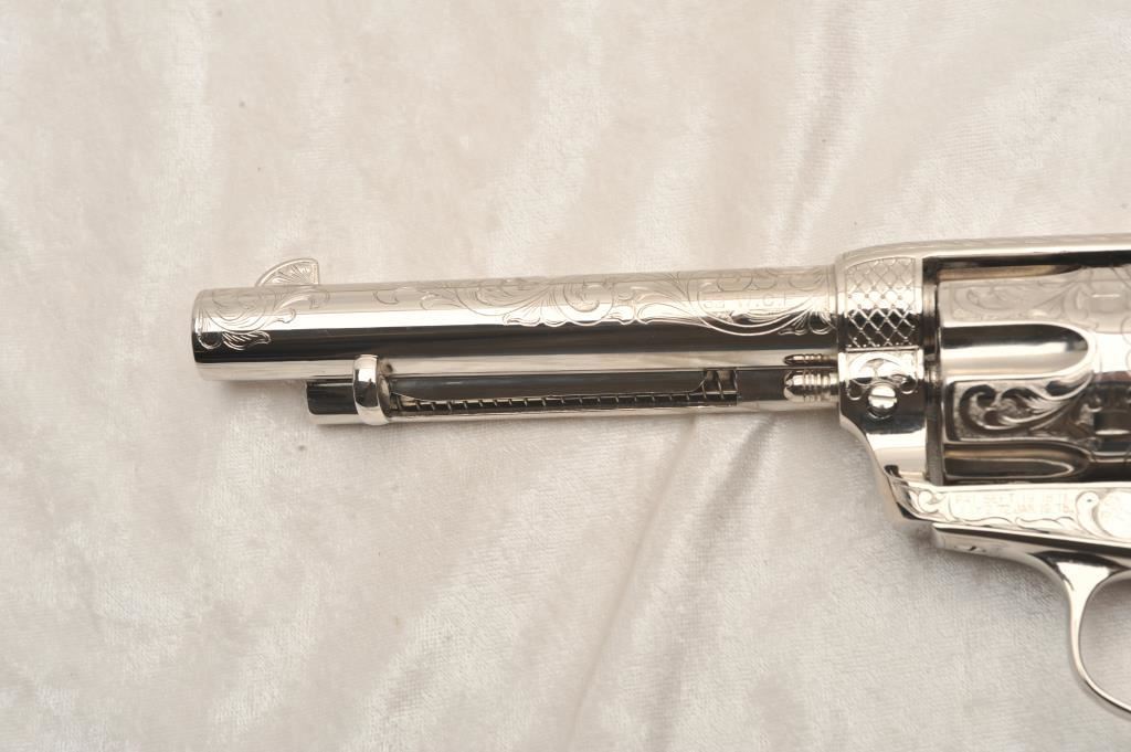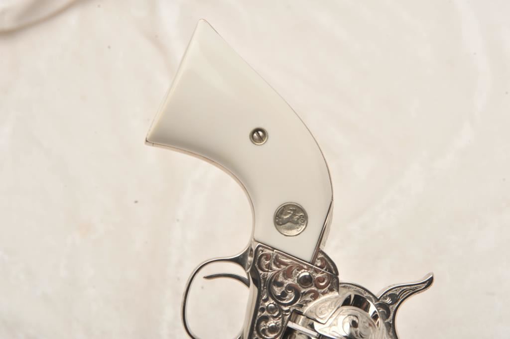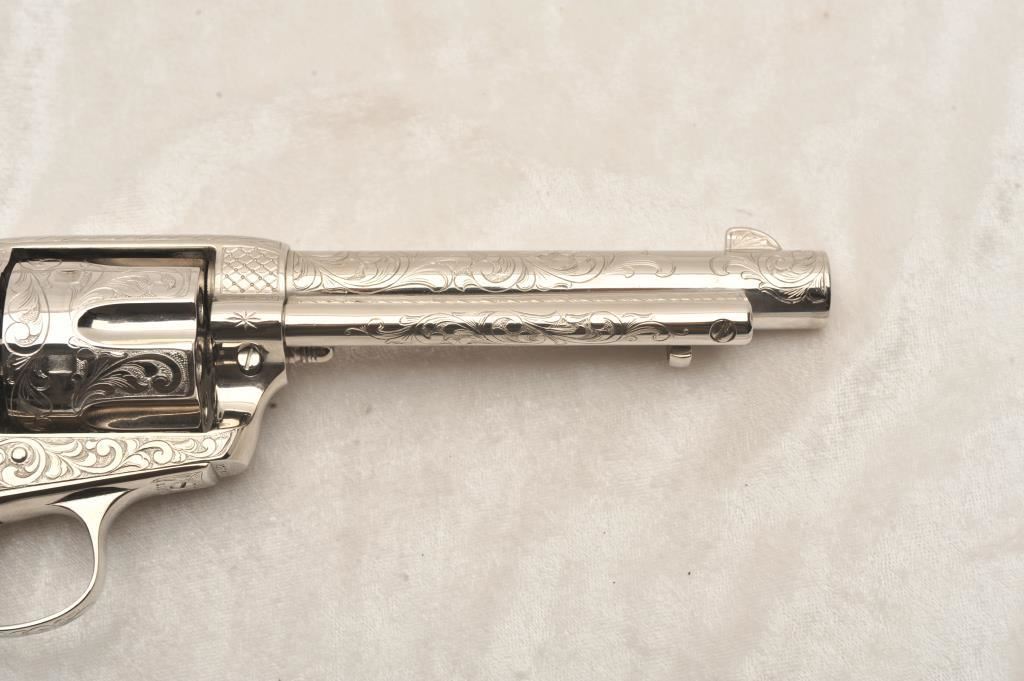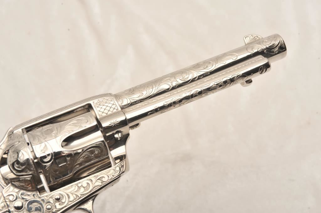 Colt Single Action Army revolver in .32-20 caliber with a 5 ½ā barrel, custom engraved, faux ivory medallion grips, S/N 275644 and made about 1906. This Colt shows a Germanic scroll engraving reminiscent of classic Germanic engravers with Helfricht style checkerboard and āDā coverage having engraved hammer and front sight. The pistol was refinished and restored correctly retaining patent dates and all markings. Also matching serial numbers. The action and bore are good. A nice looking 1st gen that shows good quality embellishments. (C&R/PPT) Est.: $3500-$7000