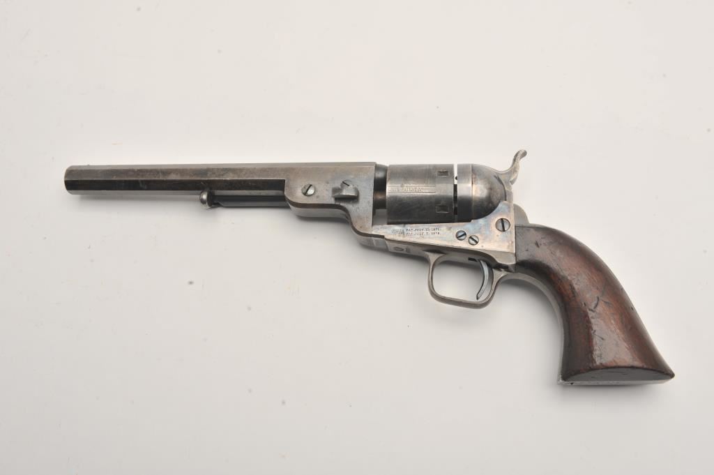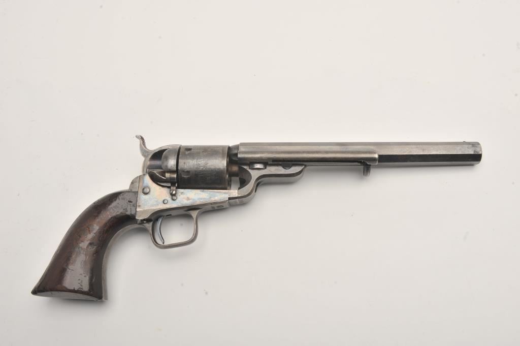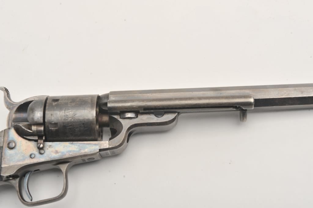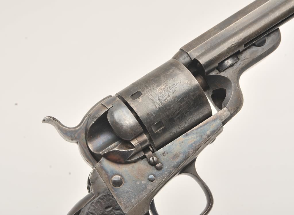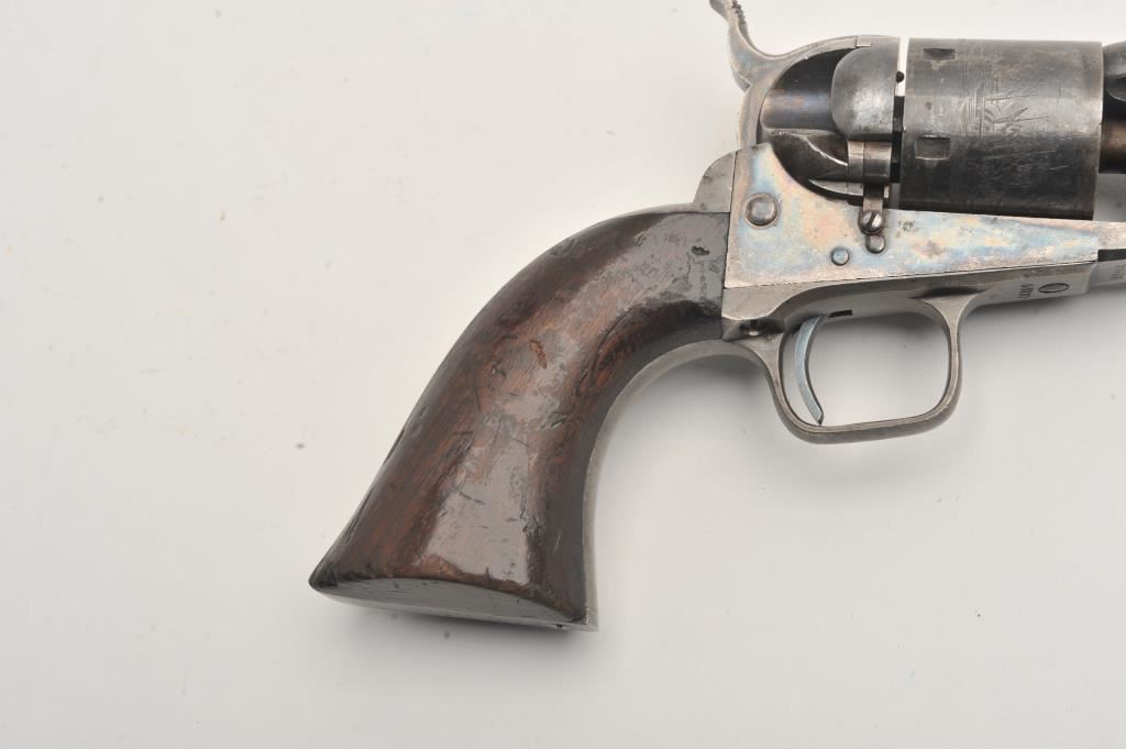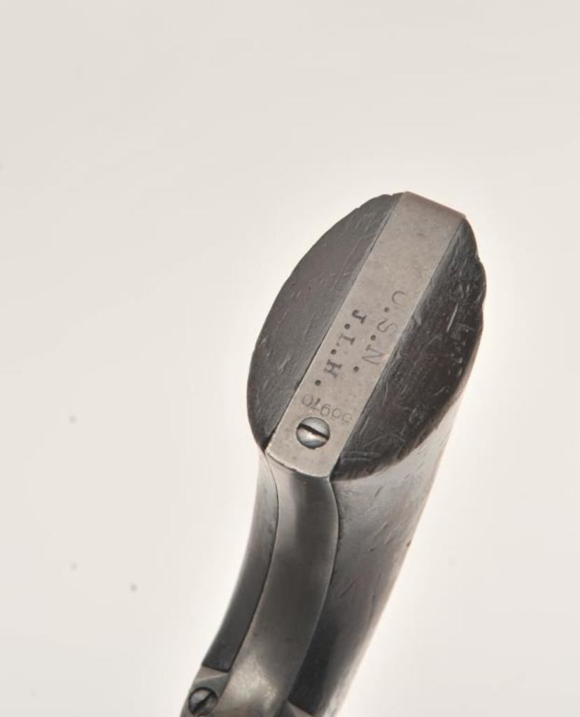 Colt Model 1851 Navy conversion, .38CF caliber, 7.5” barrel, blued and case hardened finish, wood grips, iron straps, S/N 56970; frame is marked “U.S.”; but strap is marked “U.S.N./J.L.H.”; underside barrel flat marked “R.W.M.” and anchor; majority of cylinder scene remaining (no visible serial number on cylinder), scattered blued finish on barrel assembly and cylinder with considerable case colors on frame; crisp action, good markings, very good bore and good grips showing some areas of loss to varnish. (Antique). Est.: $4,000-$8,000.