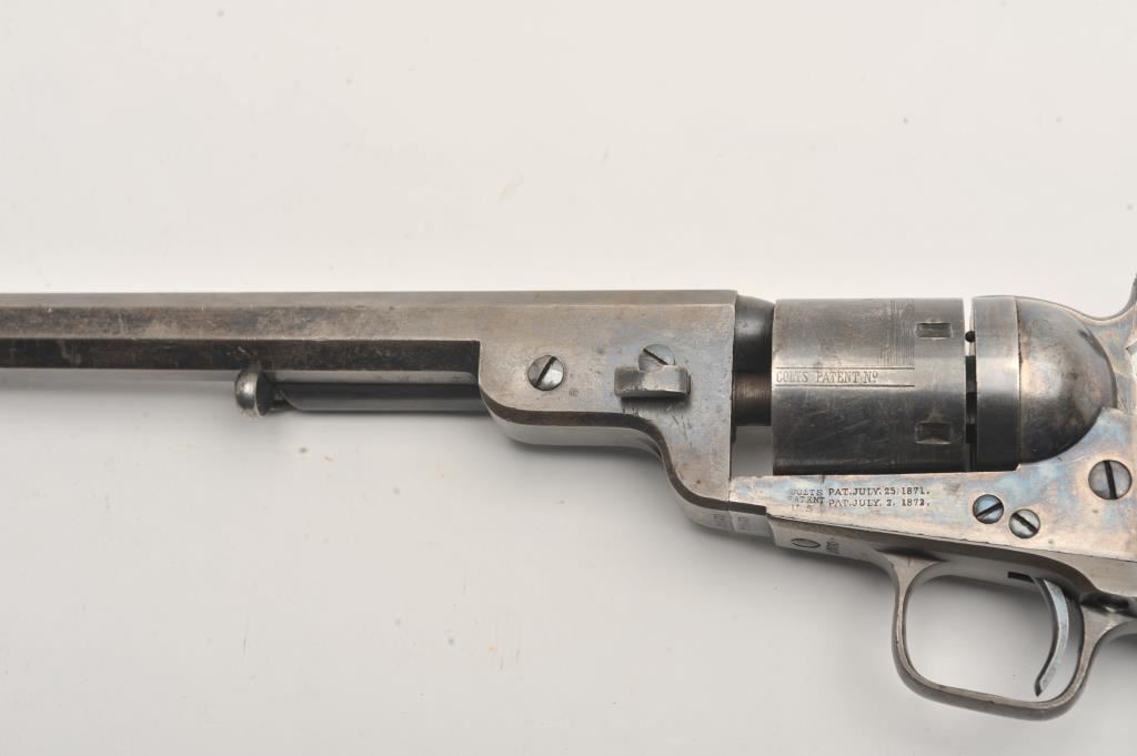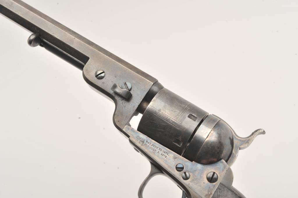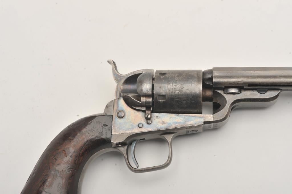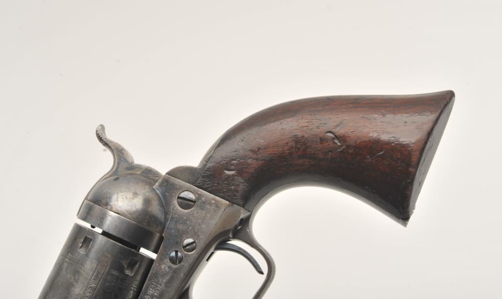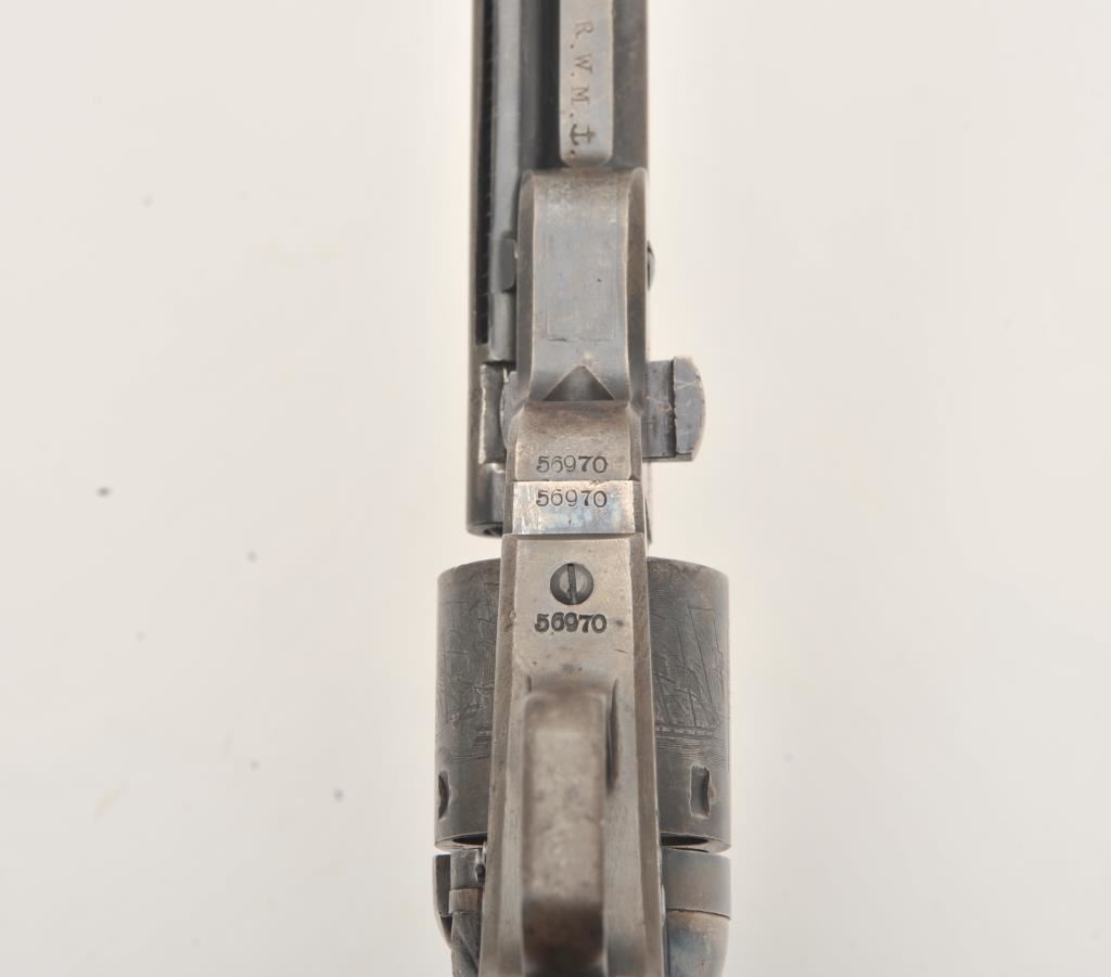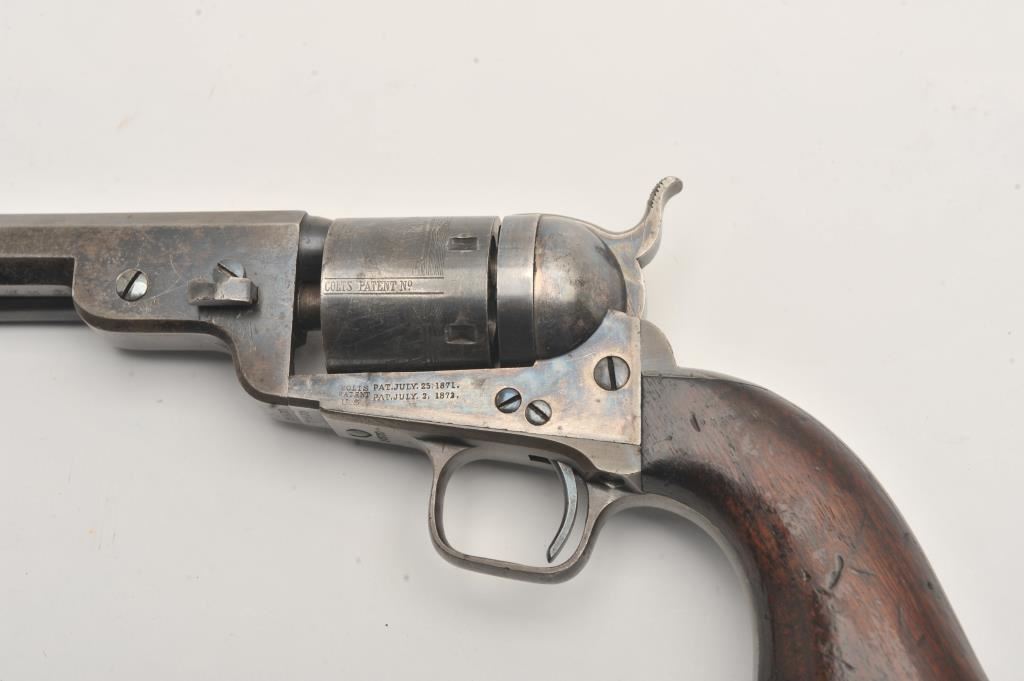 Colt Model 1851 Navy conversion, .38CF caliber, 7.5” barrel, blued and case hardened finish, wood grips, iron straps, S/N 56970; frame is marked “U.S.”; but strap is marked “U.S.N./J.L.H.”; underside barrel flat marked “R.W.M.” and anchor; majority of cylinder scene remaining (no visible serial number on cylinder), scattered blued finish on barrel assembly and cylinder with considerable case colors on frame; crisp action, good markings, very good bore and good grips showing some areas of loss to varnish. (Antique). Est.: $4,000-$8,000.