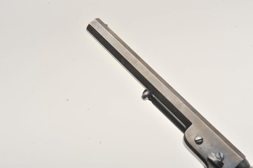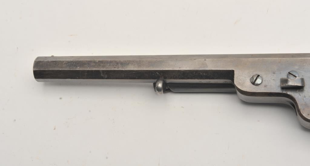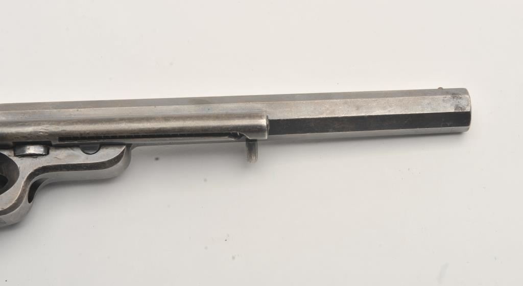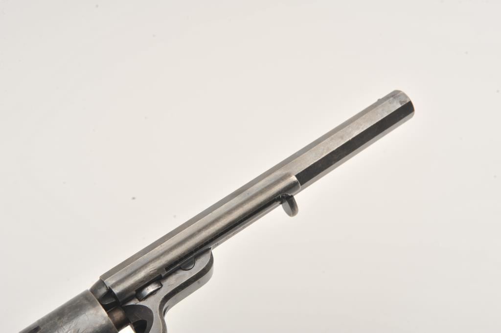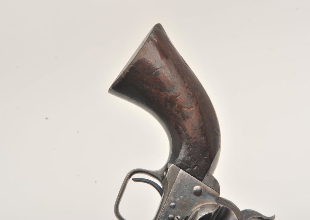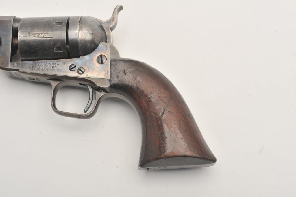 Colt Model 1851 Navy conversion, .38CF caliber, 7.5” barrel, blued and case hardened finish, wood grips, iron straps, S/N 56970; frame is marked “U.S.”; but strap is marked “U.S.N./J.L.H.”; underside barrel flat marked “R.W.M.” and anchor; majority of cylinder scene remaining (no visible serial number on cylinder), scattered blued finish on barrel assembly and cylinder with considerable case colors on frame; crisp action, good markings, very good bore and good grips showing some areas of loss to varnish. (Antique). Est.: $4,000-$8,000.