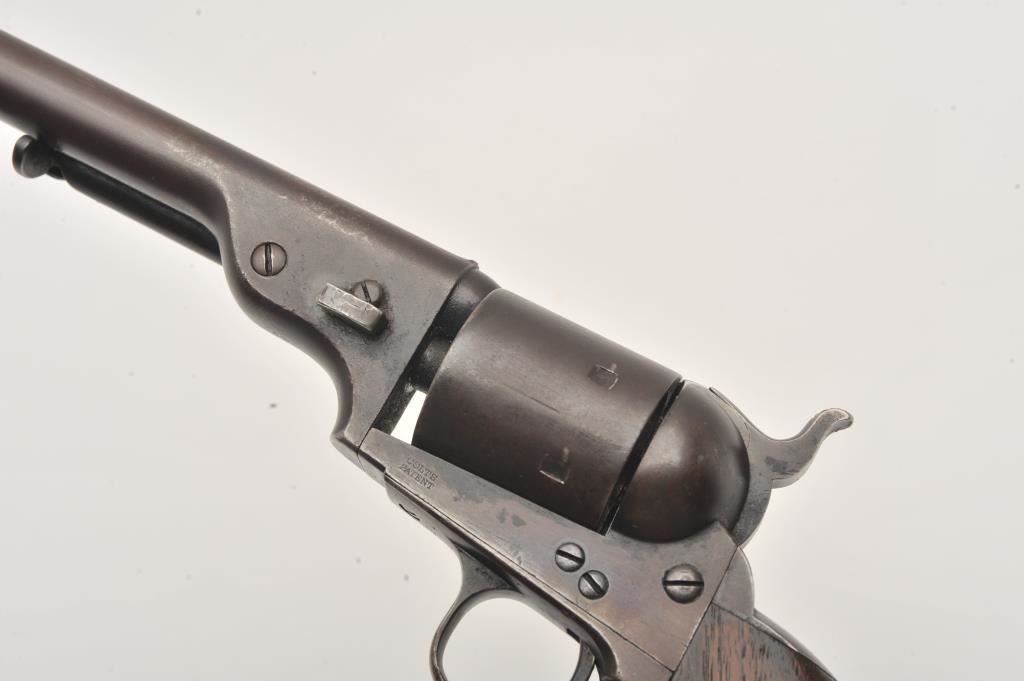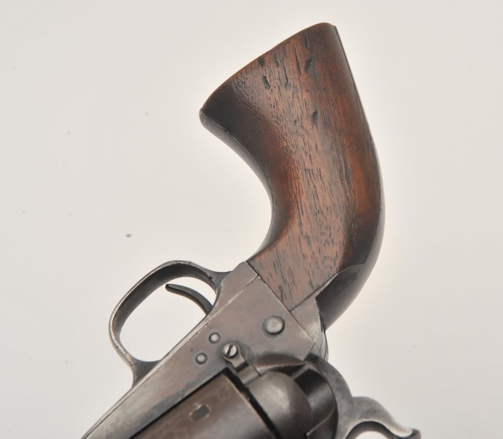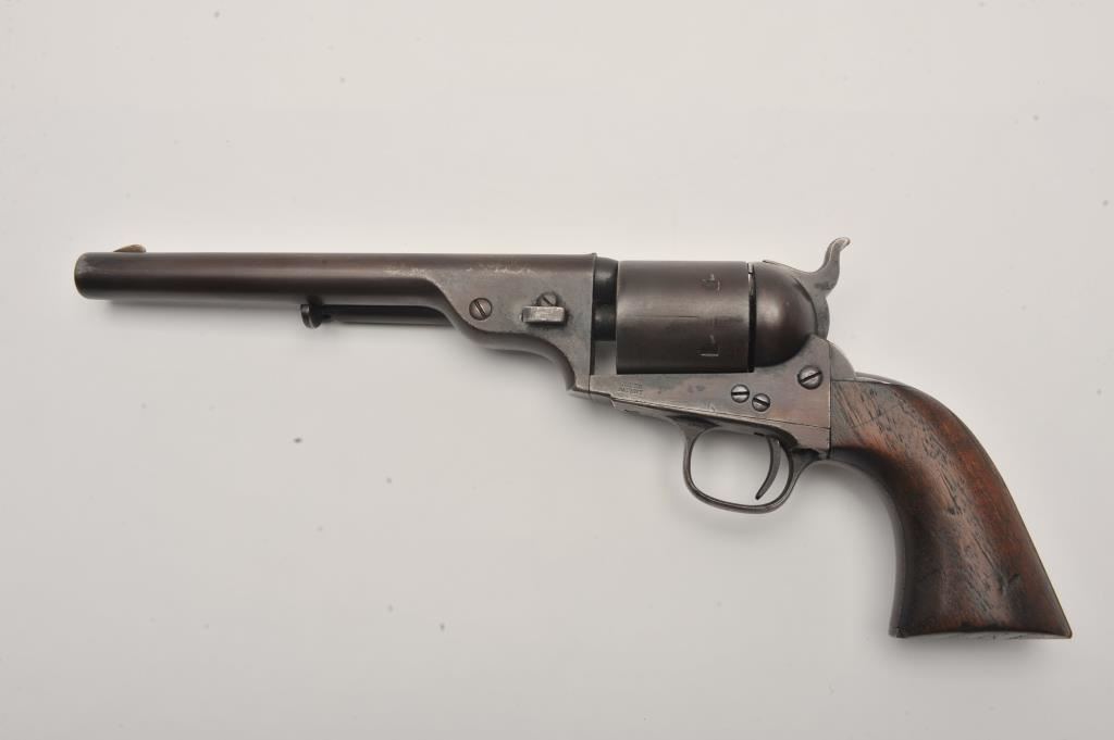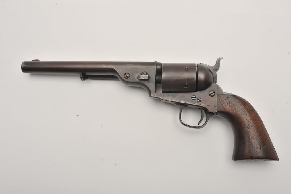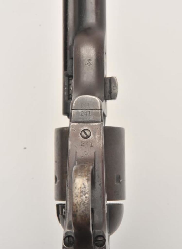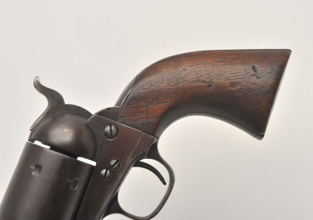 Scarce Colt Model ’72 Open Top revolver, .44RF caliber, 7.5” barrel, dark patina, wood grips, S/N 241; overall as found and untouched good to very good condition displaying dark plum brown patina to metal surfaces, crisp action, good markings and overall good grips with scattered old mars and scratches from carry and storage. (Antique). Est.: $3,000-$6,000.