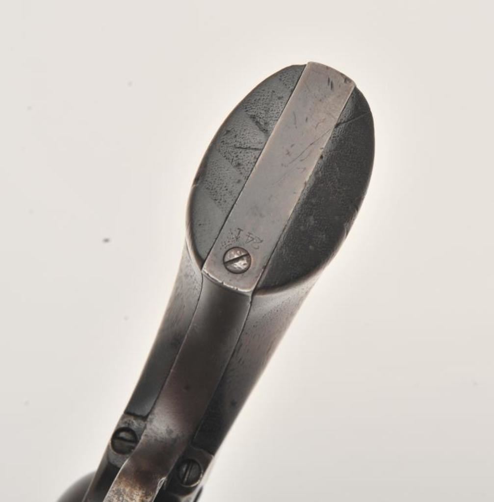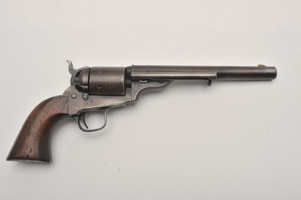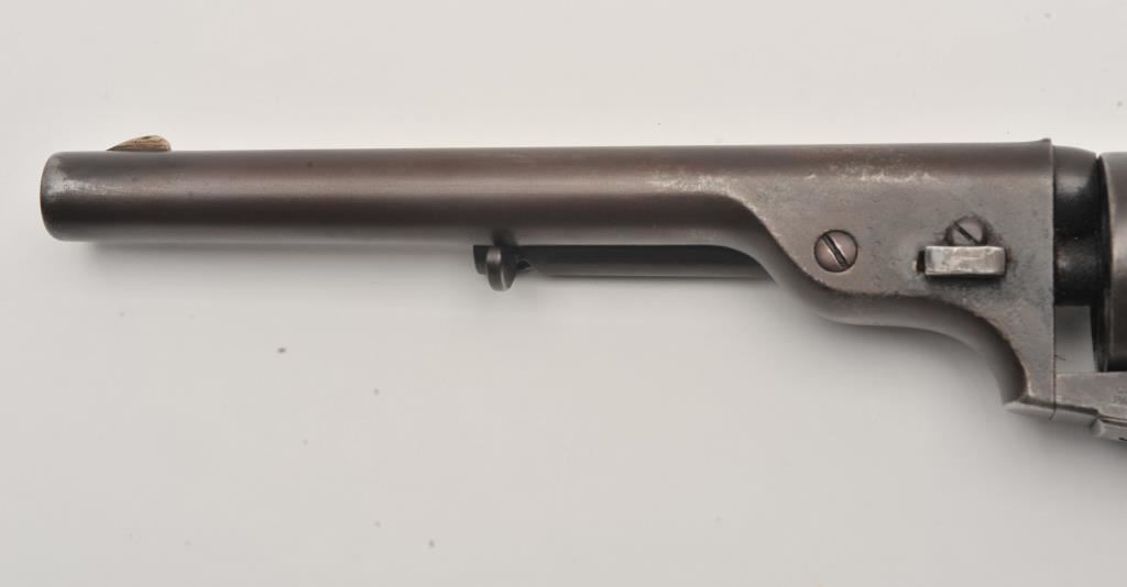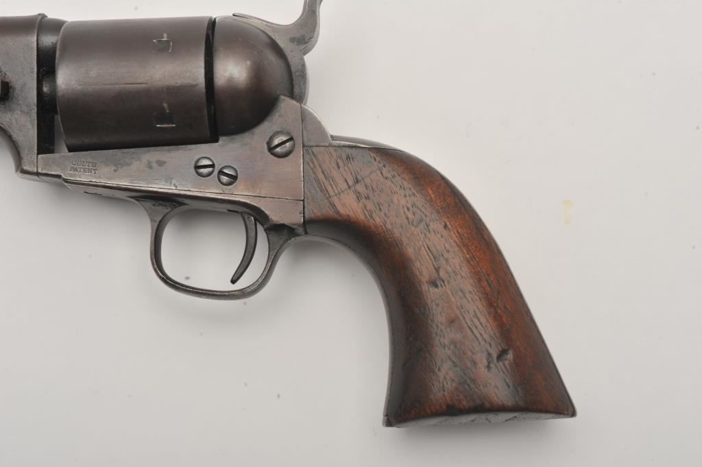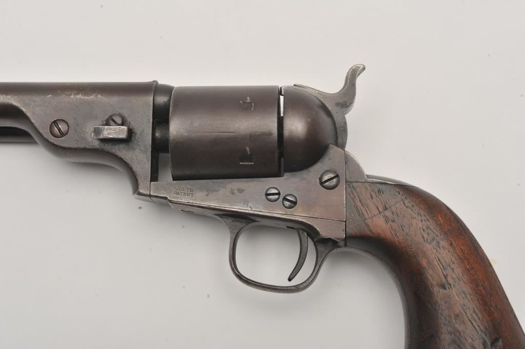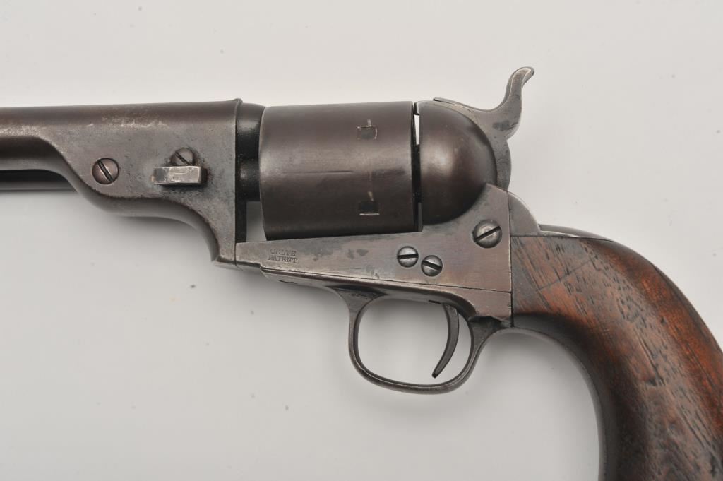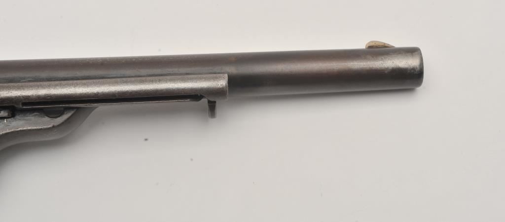 Scarce Colt Model ’72 Open Top revolver, .44RF caliber, 7.5” barrel, dark patina, wood grips, S/N 241; overall as found and untouched good to very good condition displaying dark plum brown patina to metal surfaces, crisp action, good markings and overall good grips with scattered old mars and scratches from carry and storage. (Antique). Est.: $3,000-$6,000.
