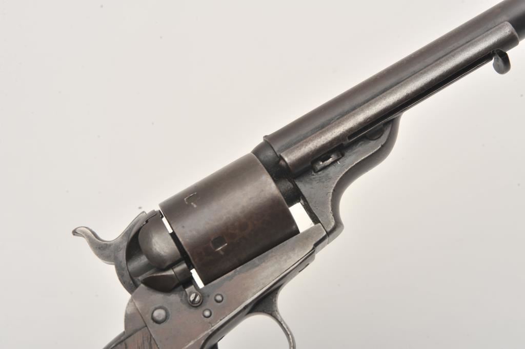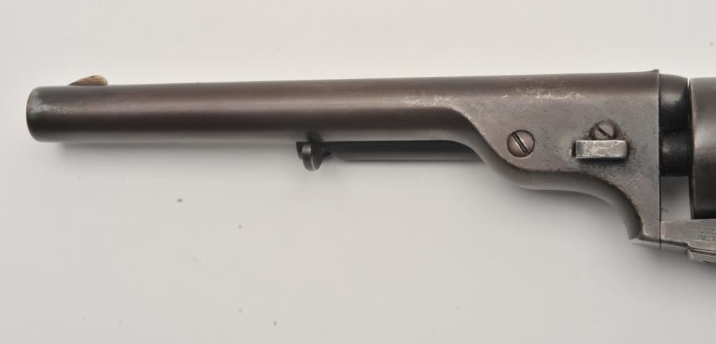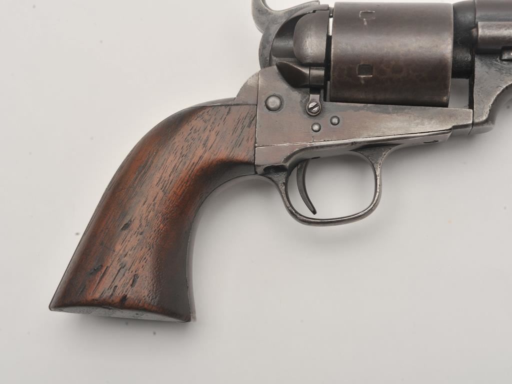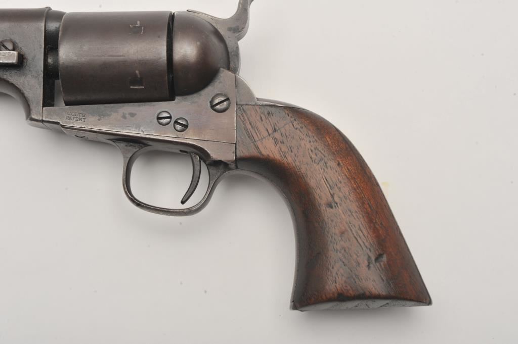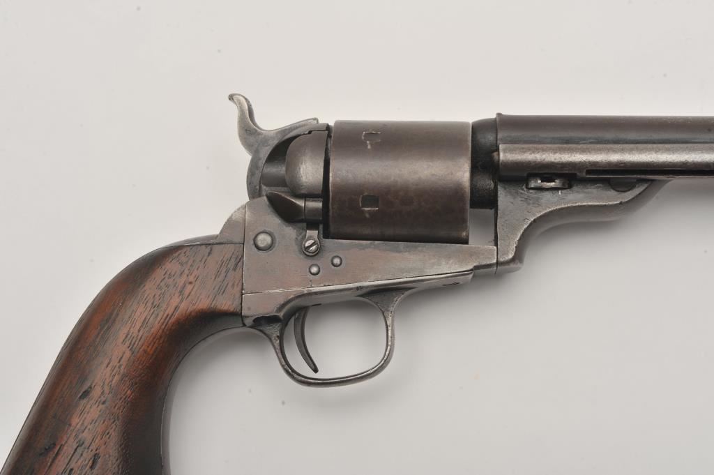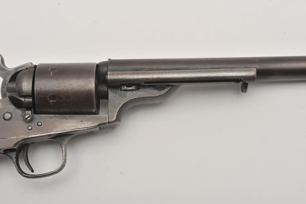 Scarce Colt Model ’72 Open Top revolver, .44RF caliber, 7.5” barrel, dark patina, wood grips, S/N 241; overall as found and untouched good to very good condition displaying dark plum brown patina to metal surfaces, crisp action, good markings and overall good grips with scattered old mars and scratches from carry and storage. (Antique). Est.: $3,000-$6,000.