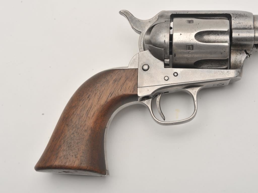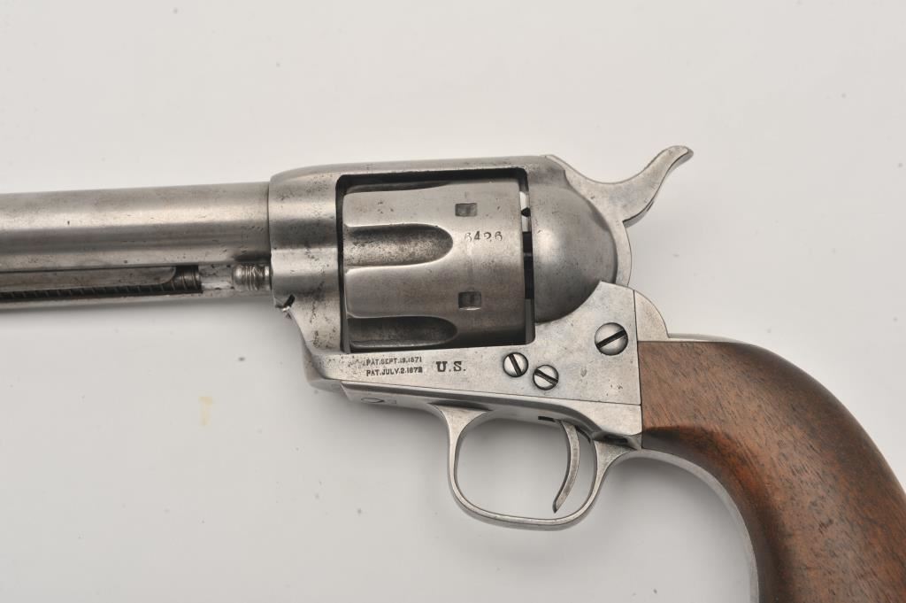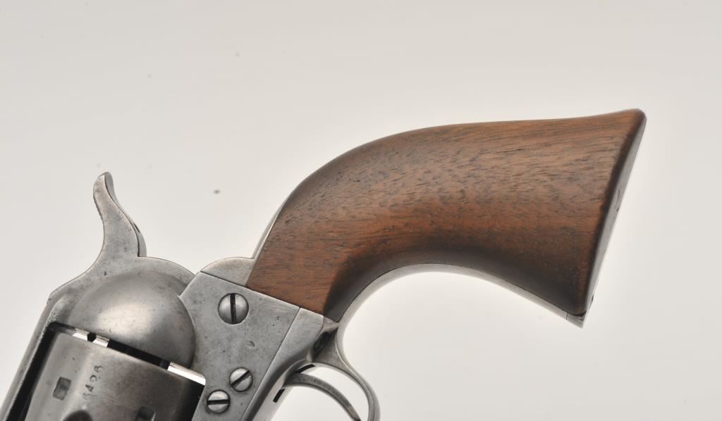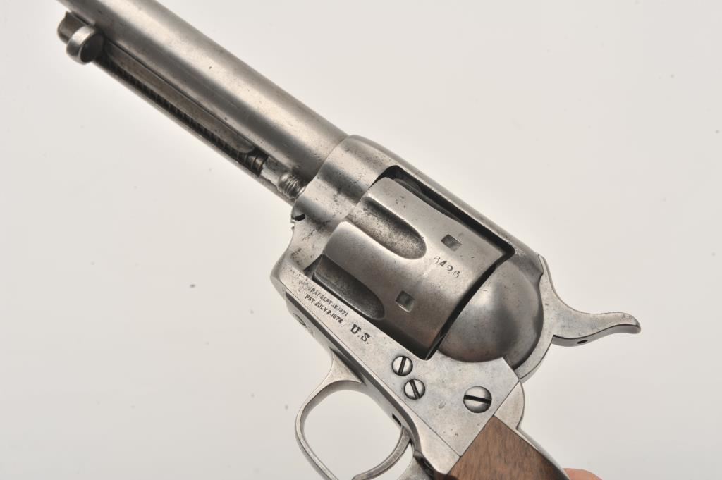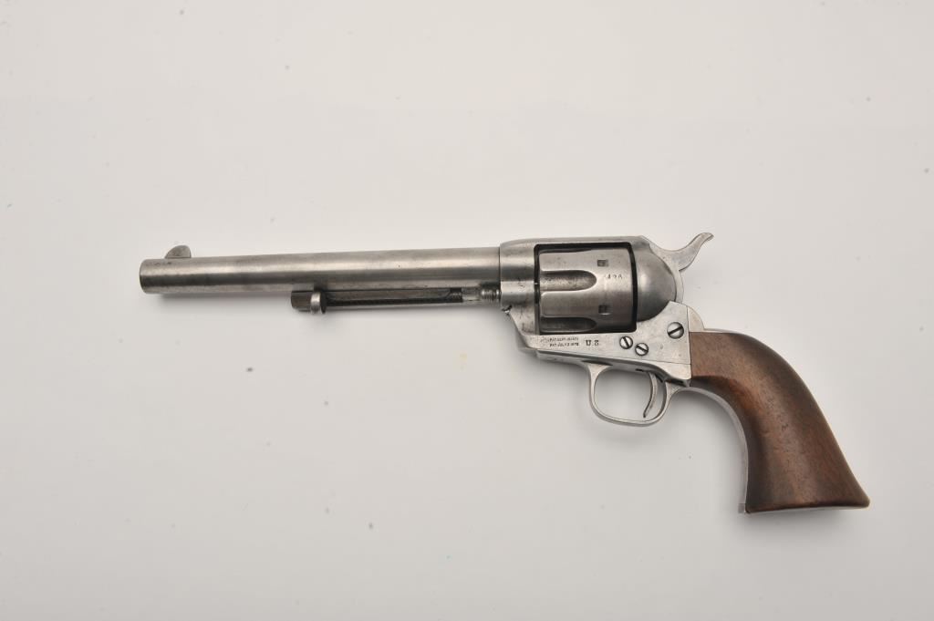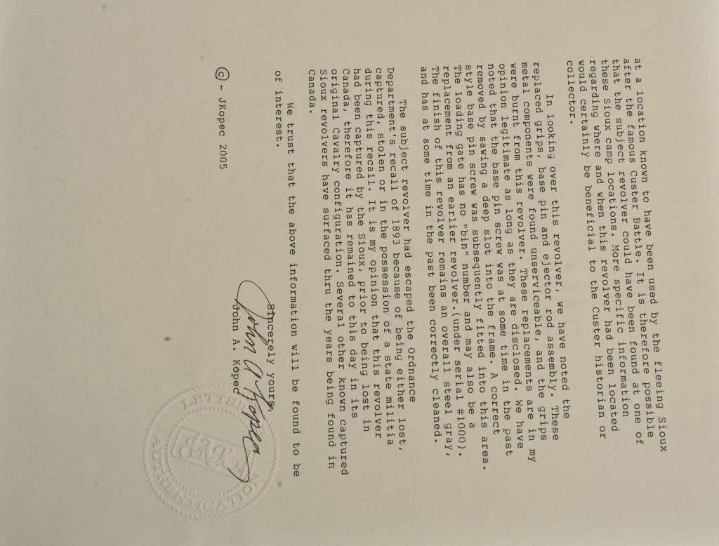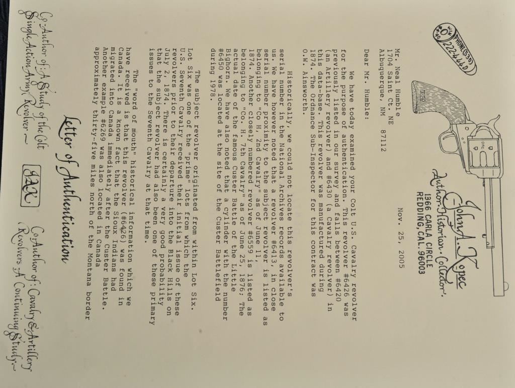 Colt U.S. SAA revolver, .45 caliber, 7.5” barrel, grey patina, wood grips, Ainsworth inspected, S/N 6426 (in a prime Custer serial number range). Accompanied by a John Kopec letter dated Nov. 25, 2005 indicating this Colt came out of Canada and stated “In looking over this revolver, we have noted the replaced grips, base pin and ejector rod assembly (cataloger’s note: replaced ejector rod assembly included with this lot). These metal components were found unserviceable, and the grips were burnt from this revolver. These replacements in my opinion legitimate as long as they are disclosed. We have noted that the base pin screw was at some time in the past removed by sawing a deep slot into the frame. A correct style base pin screw was subsequently fitted into this area. The loading gate has no “bin” number and may also be a replacement from an earlier revolver. (under serial #1000). The finish of this revolver remains an overall steel gray, and has at some time in the past been correctly cleaned”. Importantly, Kopec concludes the letter “The subject revolver had escaped the
