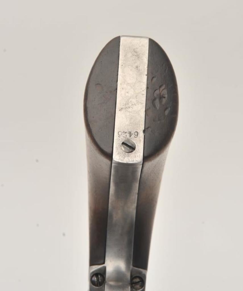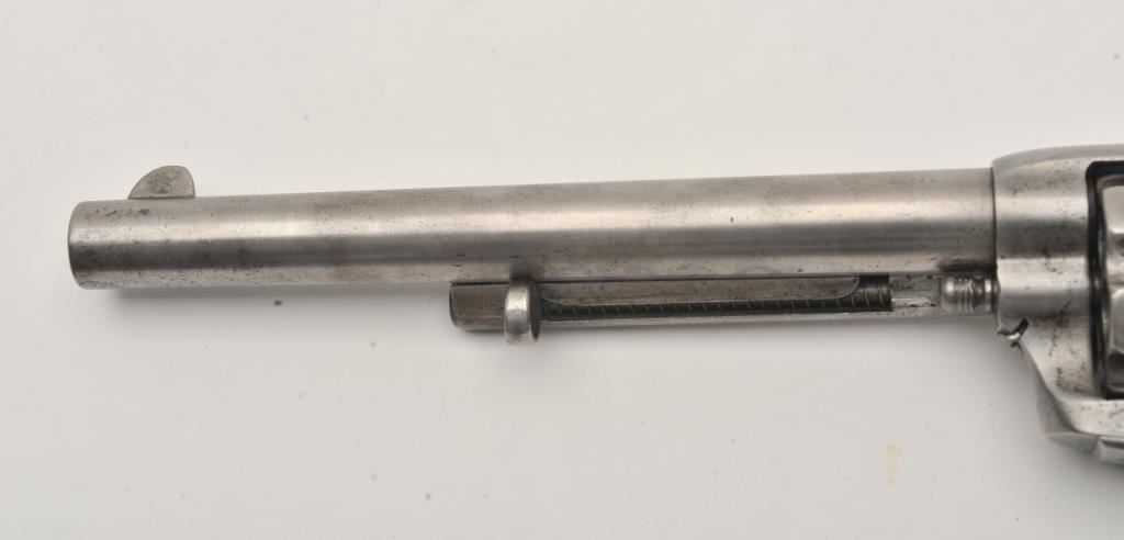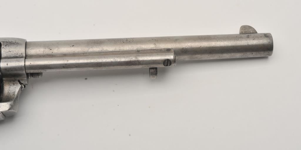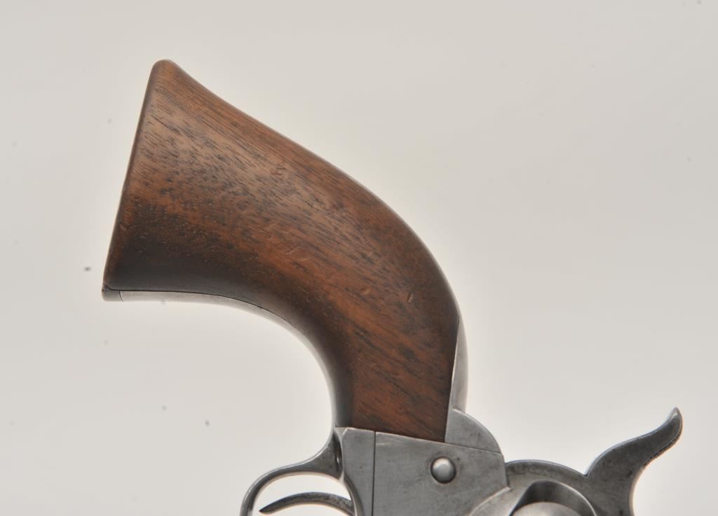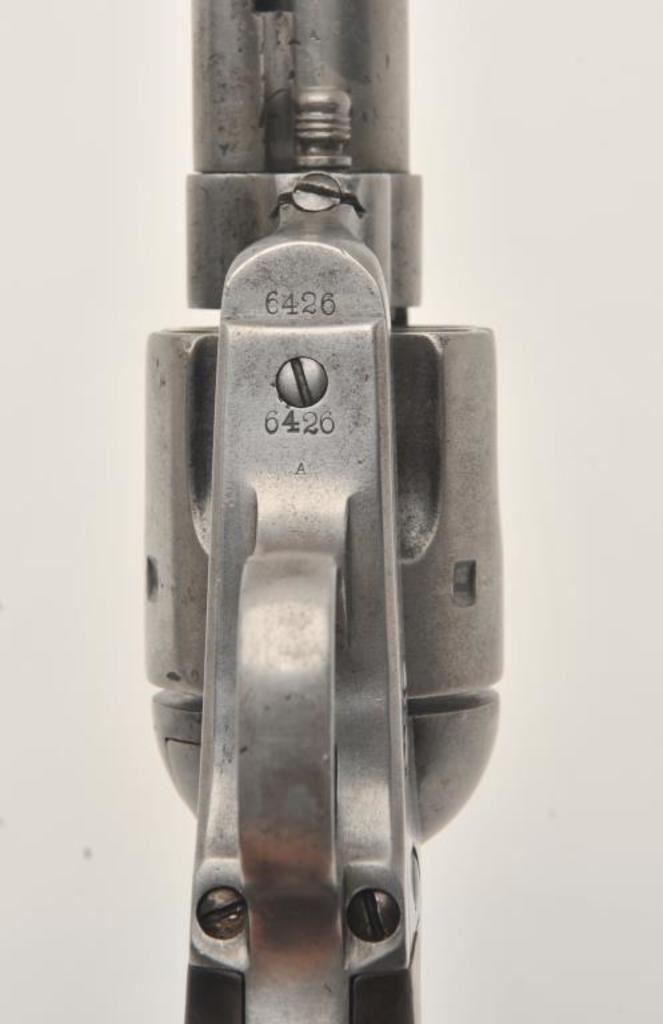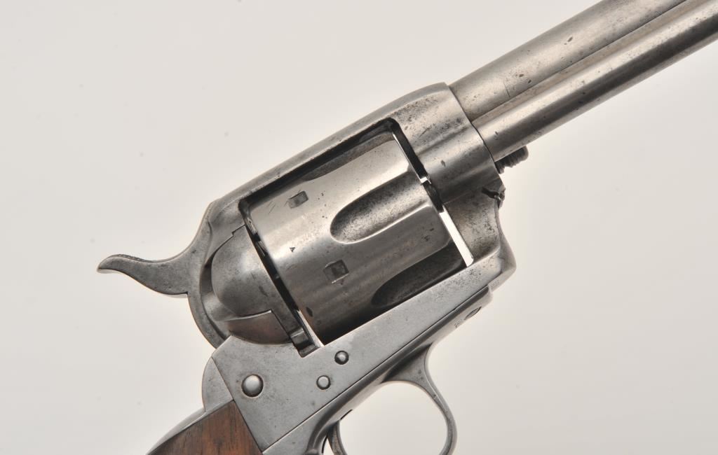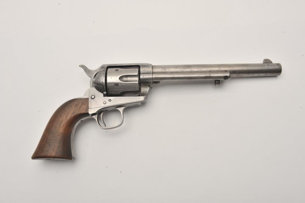 Colt U.S. SAA revolver, .45 caliber, 7.5” barrel, grey patina, wood grips, Ainsworth inspected, S/N 6426 (in a prime Custer serial number range). Accompanied by a John Kopec letter dated Nov. 25, 2005 indicating this Colt came out of Canada and stated “In looking over this revolver, we have noted the replaced grips, base pin and ejector rod assembly (cataloger’s note: replaced ejector rod assembly included with this lot). These metal components were found unserviceable, and the grips were burnt from this revolver. These replacements in my opinion legitimate as long as they are disclosed. We have noted that the base pin screw was at some time in the past removed by sawing a deep slot into the frame. A correct style base pin screw was subsequently fitted into this area. The loading gate has no “bin” number and may also be a replacement from an earlier revolver. (under serial #1000). The finish of this revolver remains an overall steel gray, and has at some time in the past been correctly cleaned”. Importantly, Kopec concludes the letter “The subject revolver had escaped the