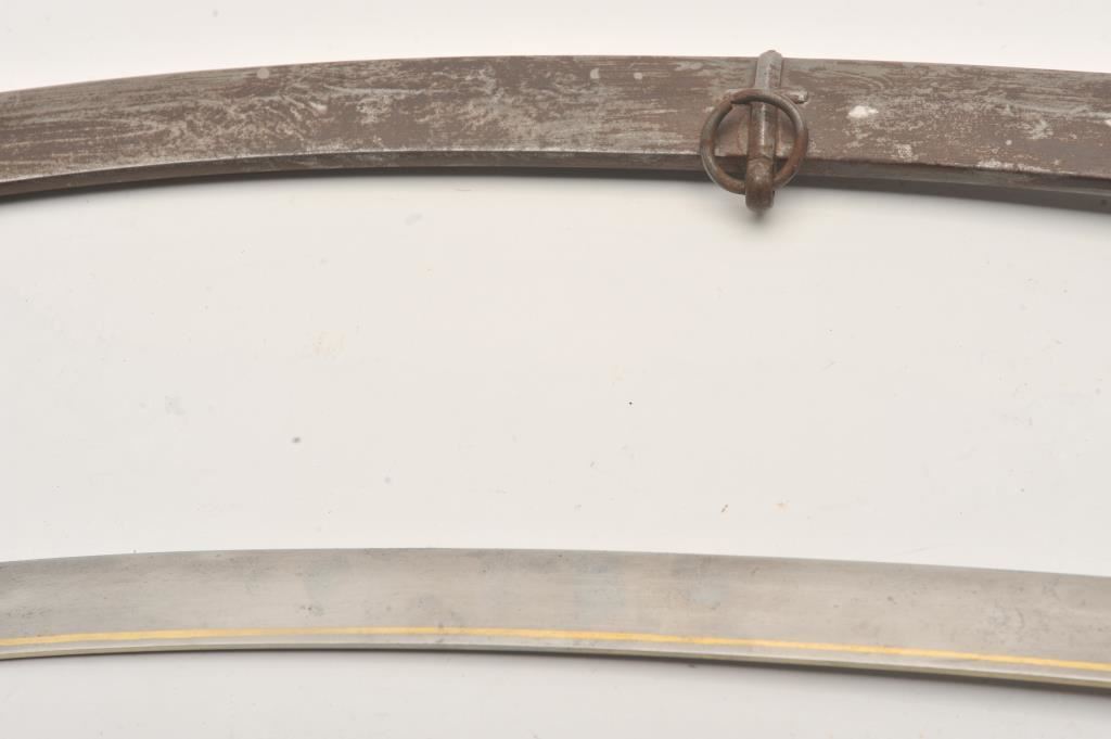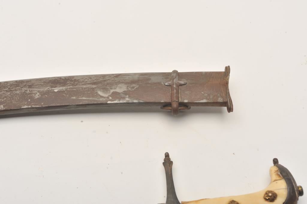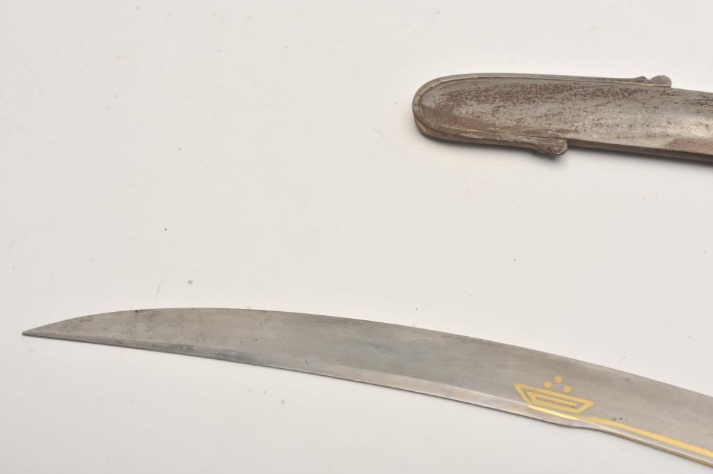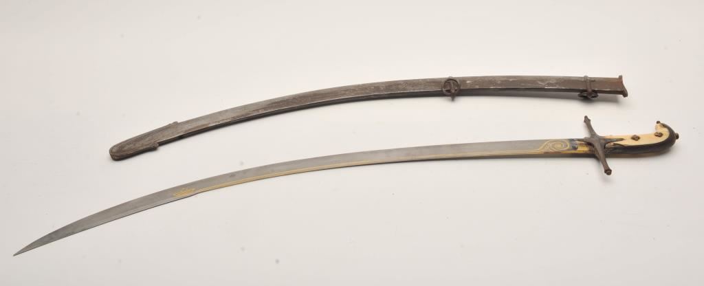A rare and unique Mameluke hilted Damascus blade Kilij with gold decoration. The deeply curved 30 inch blade with distinct Damascus pattern, 9 inch yelman and simple but elegant gold damascene decoration. Steel cross guard of Mameluke form. Ivory grip scales and Mameluke pommel. Original steel scabbard with two carrying rings. Condition of blade is fine with all gold decoration intact, no pitting or chips. The steel hilt is patinated. Ivory grips are cracked with some losses but displayable as is. Steel scabbard is patinated but free of the usual dents. A showy 19th Century Mameluke Kilij either made for an Englishman with Ottoman taste or an Ottoman Cavalry Officer in the English style. From a decades old private collection. Est:$750-1250