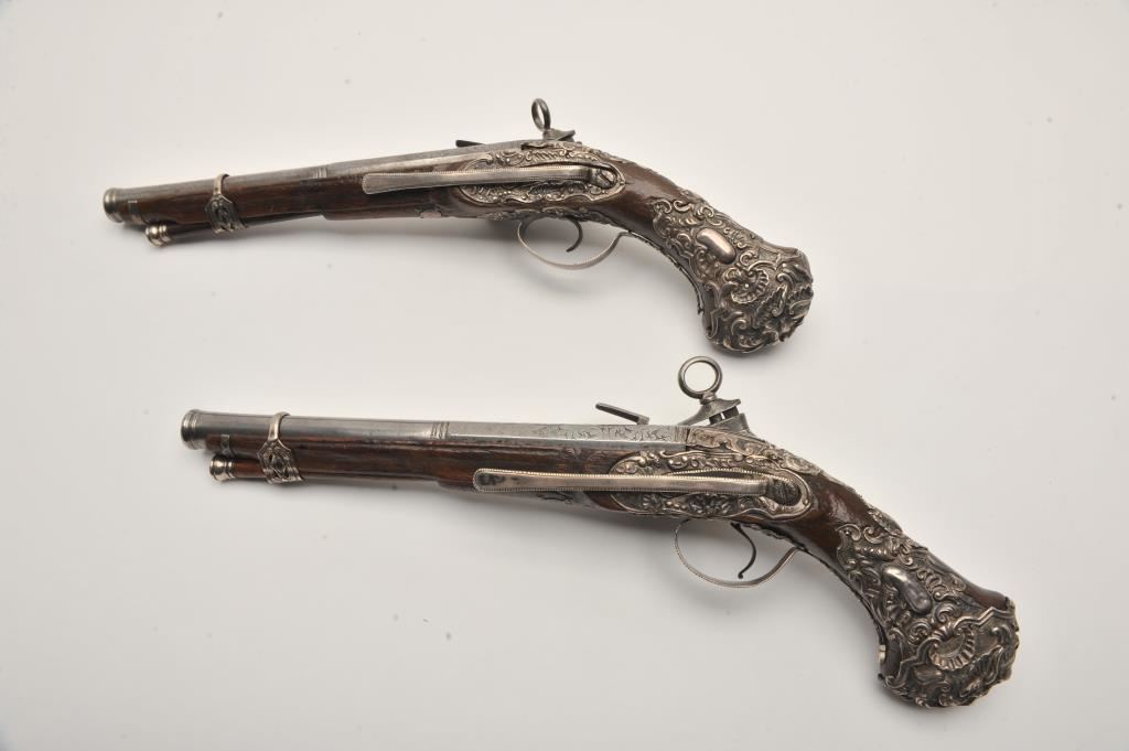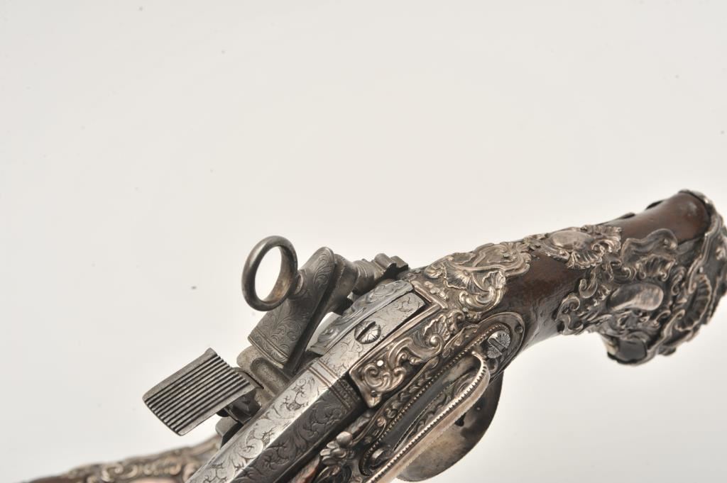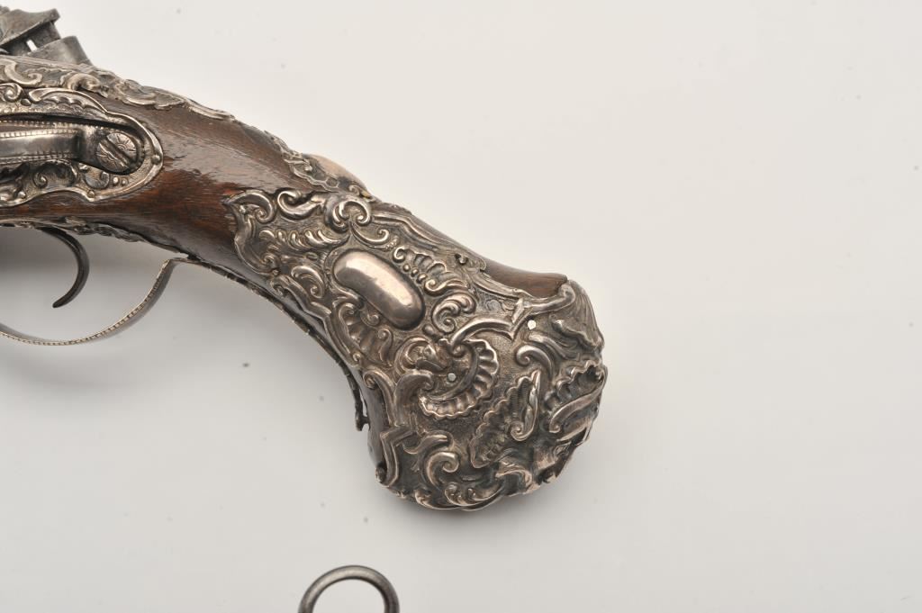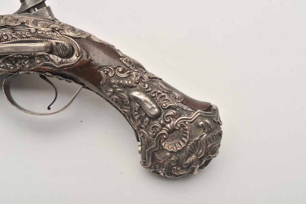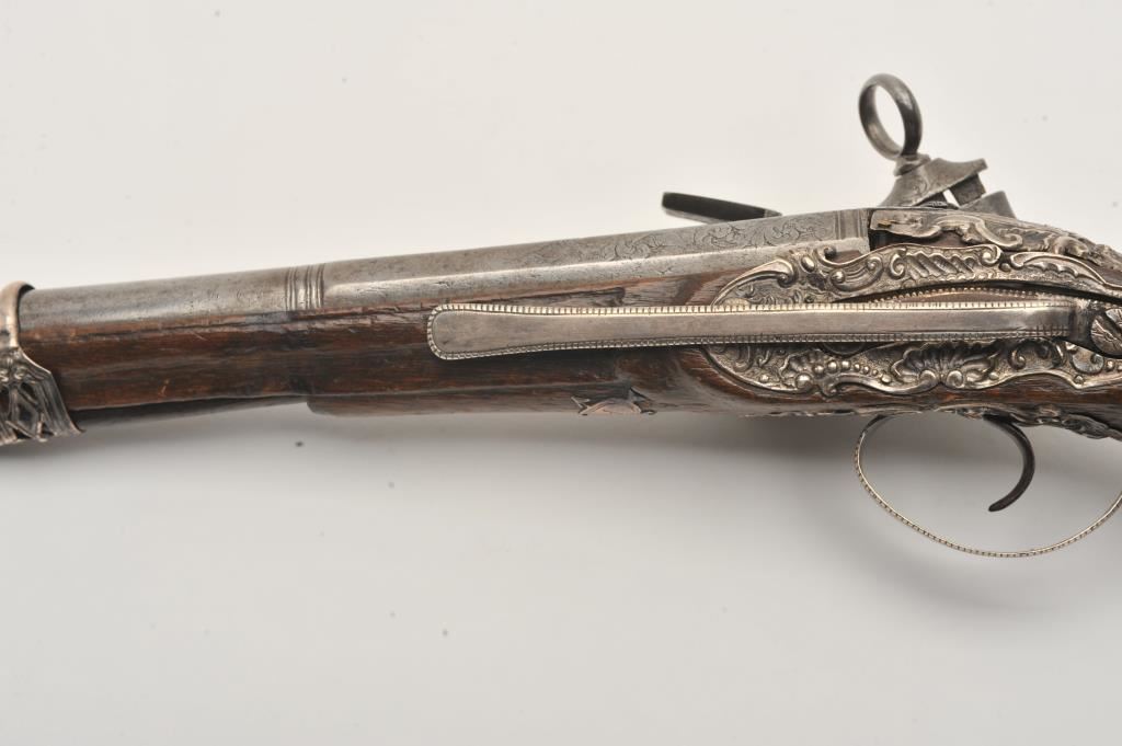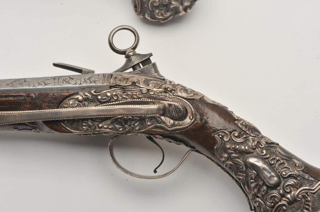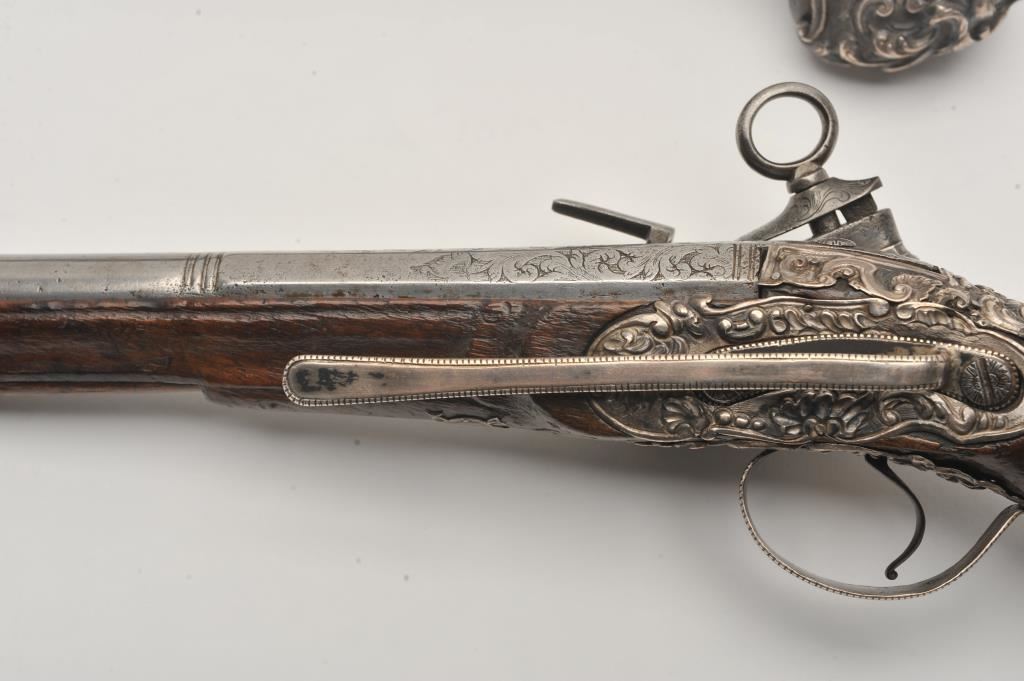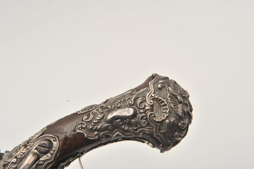 Ornate and impressive pair of Spanish miquelet horseman’s size pistols with magnificent rocco embossed in high relief full silver mountings. Measures 16 ½” overall with 10 ¼” 2 stage barrels with ringed cannon style muzzles of about .65 caliber smoothbore. The locks in barrels are lightly engraved en suite. The pair show hammered relief silver in the form of grotesque face with mustache on the butts extending all the way up the grip. The guards are silver with matching scrolling to borders. The side plate is similarly decorated with silver belt hook, pierced silver fore end band and stock retained and silver tipped ramrods. The fore end shows a small owner’s plaque with initials “A 1” or “A I” engraved upon it. The stocks are purposely plain as to not clash with ornateness of silver. The condition is very good and silver is near fine and is still crisp and not “Rubbed” from over polishing. This cataloger (John R. Gangel) first became aware of this pair of pistols when being sold by noted arms dealer Arthur Yates in the late 1970s to early 80s. Arthur
