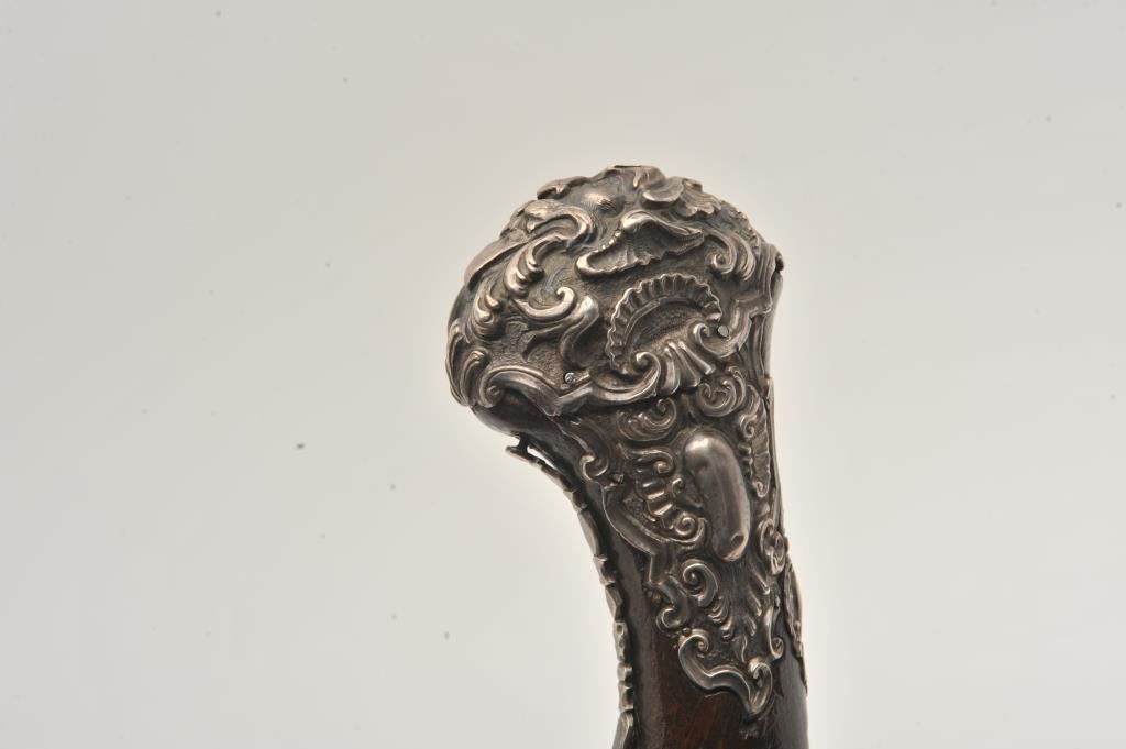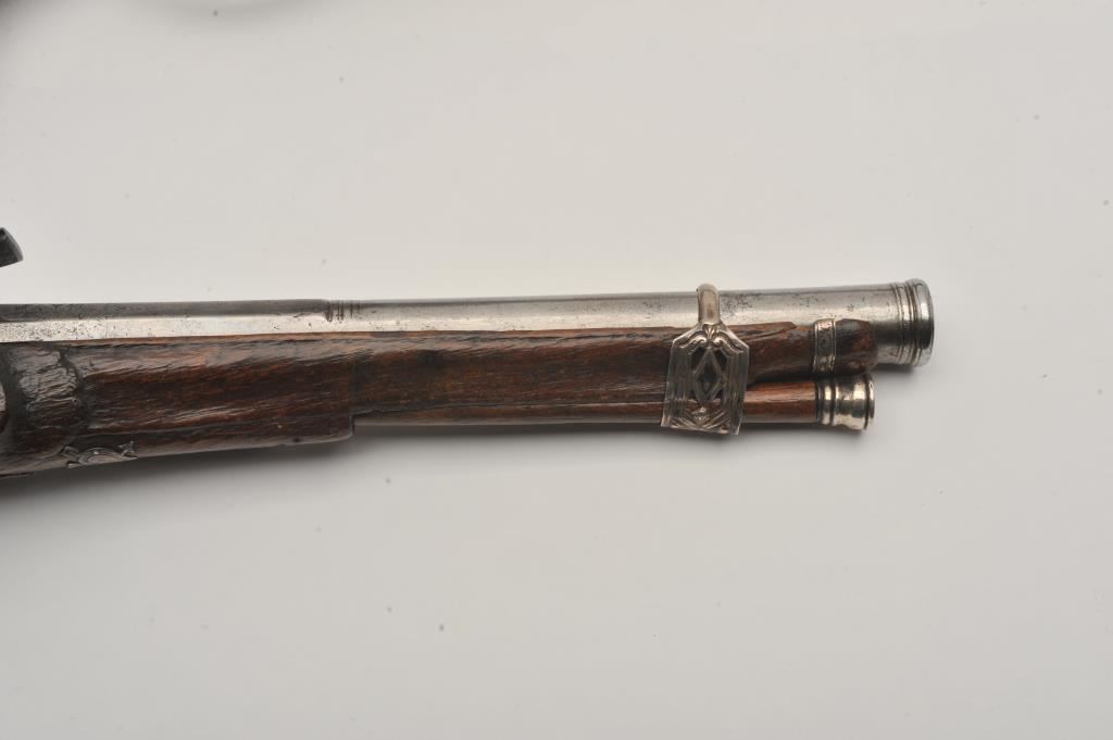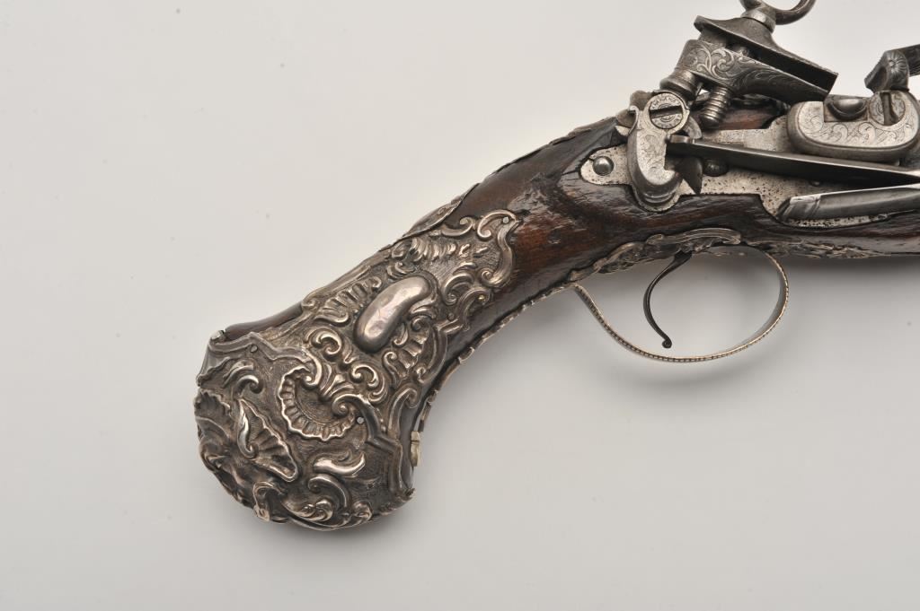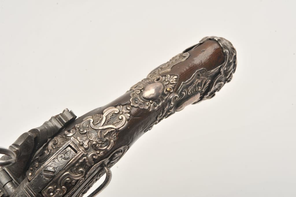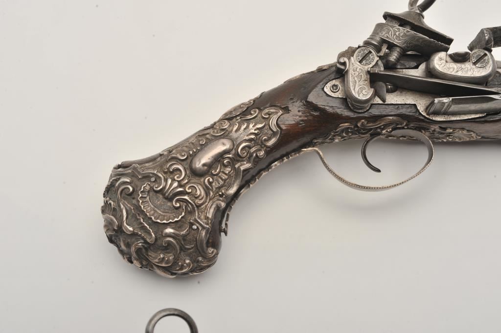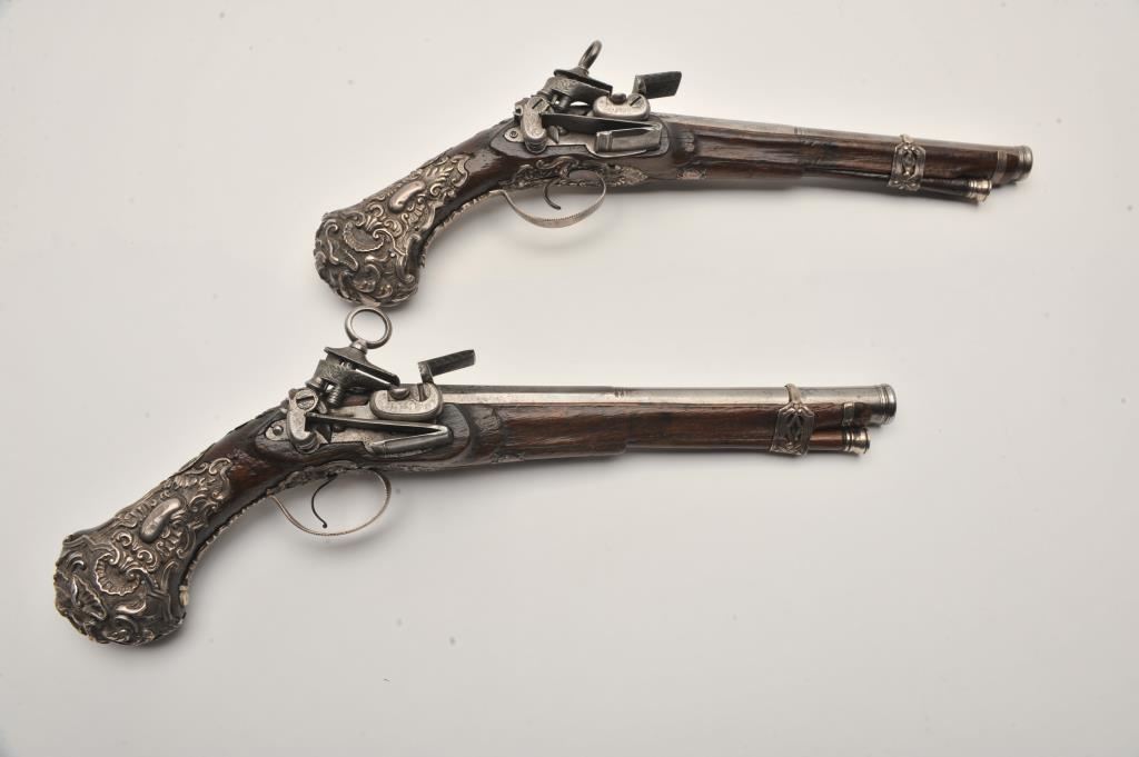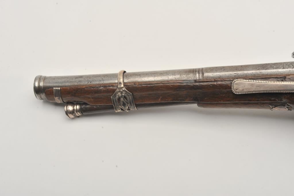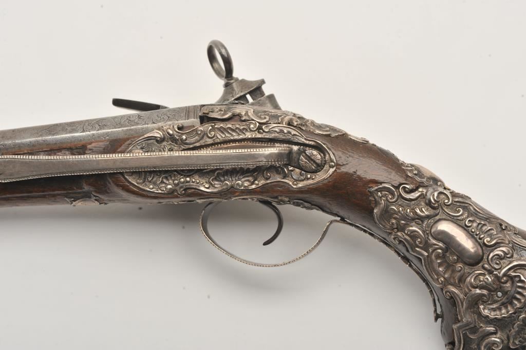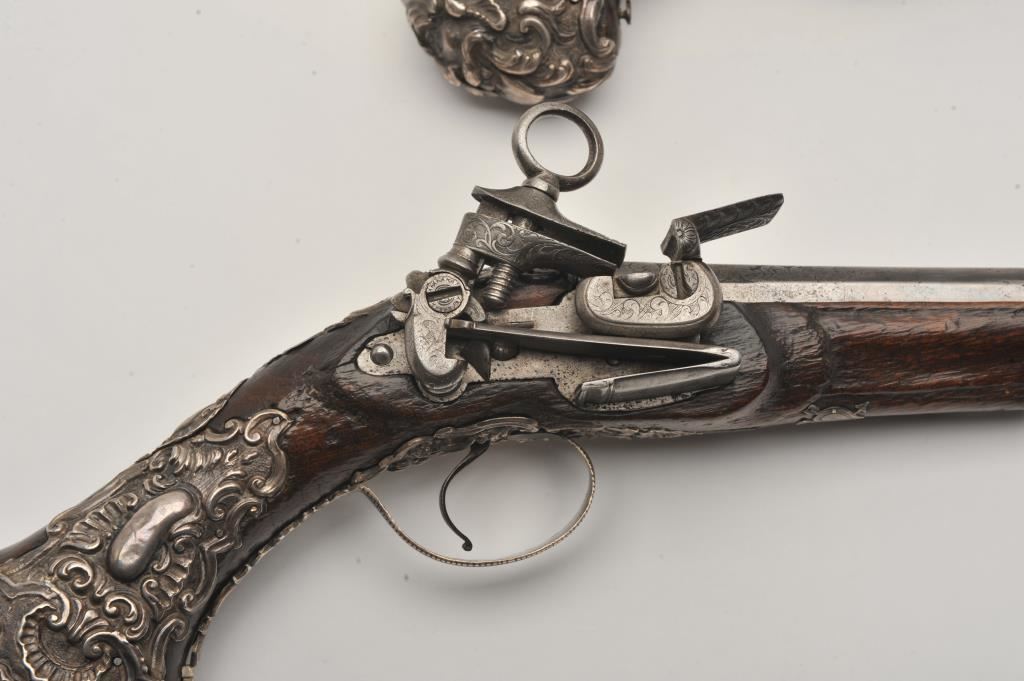 Ornate and impressive pair of Spanish miquelet horseman’s size pistols with magnificent rocco embossed in high relief full silver mountings. Measures 16 ½” overall with 10 ¼” 2 stage barrels with ringed cannon style muzzles of about .65 caliber smoothbore. The locks in barrels are lightly engraved en suite. The pair show hammered relief silver in the form of grotesque face with mustache on the butts extending all the way up the grip. The guards are silver with matching scrolling to borders. The side plate is similarly decorated with silver belt hook, pierced silver fore end band and stock retained and silver tipped ramrods. The fore end shows a small owner’s plaque with initials “A 1” or “A I” engraved upon it. The stocks are purposely plain as to not clash with ornateness of silver. The condition is very good and silver is near fine and is still crisp and not “Rubbed” from over polishing. This cataloger (John R. Gangel) first became aware of this pair of pistols when being sold by noted arms dealer Arthur Yates in the late 1970s to early 80s. Arthur