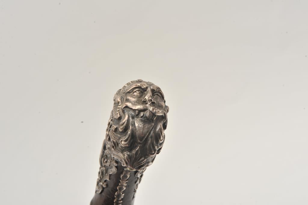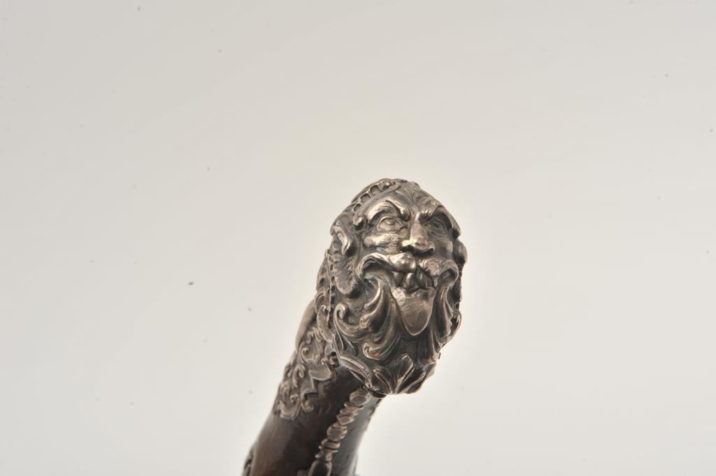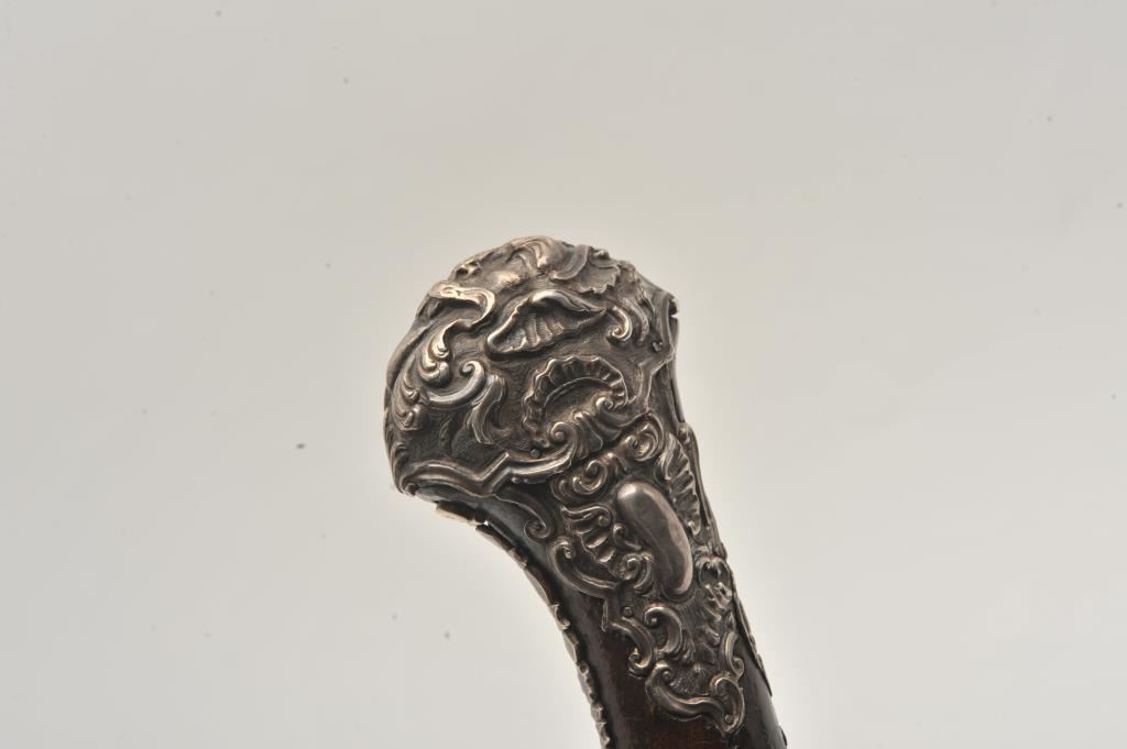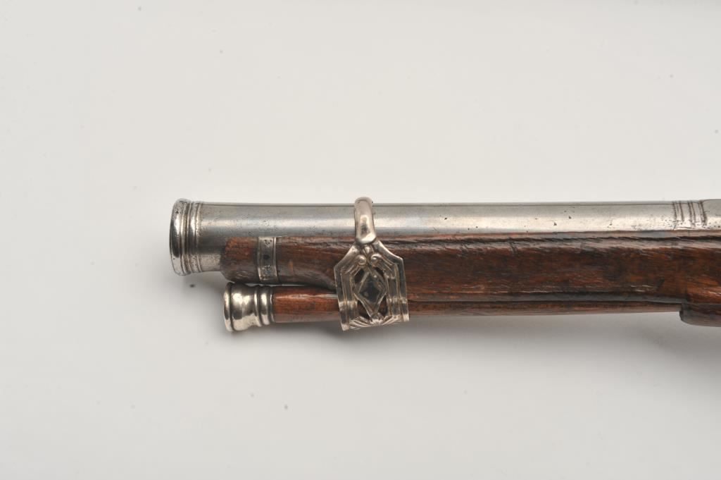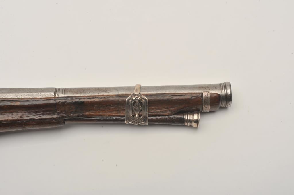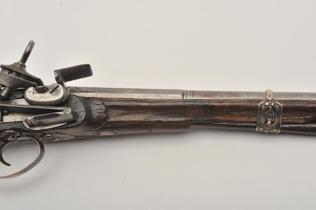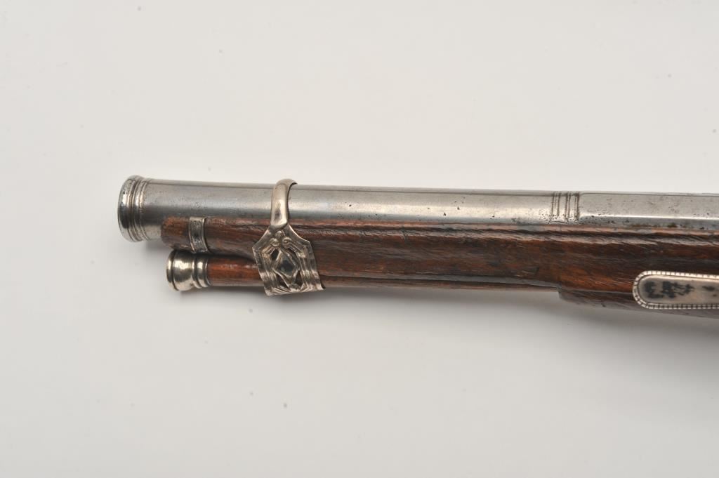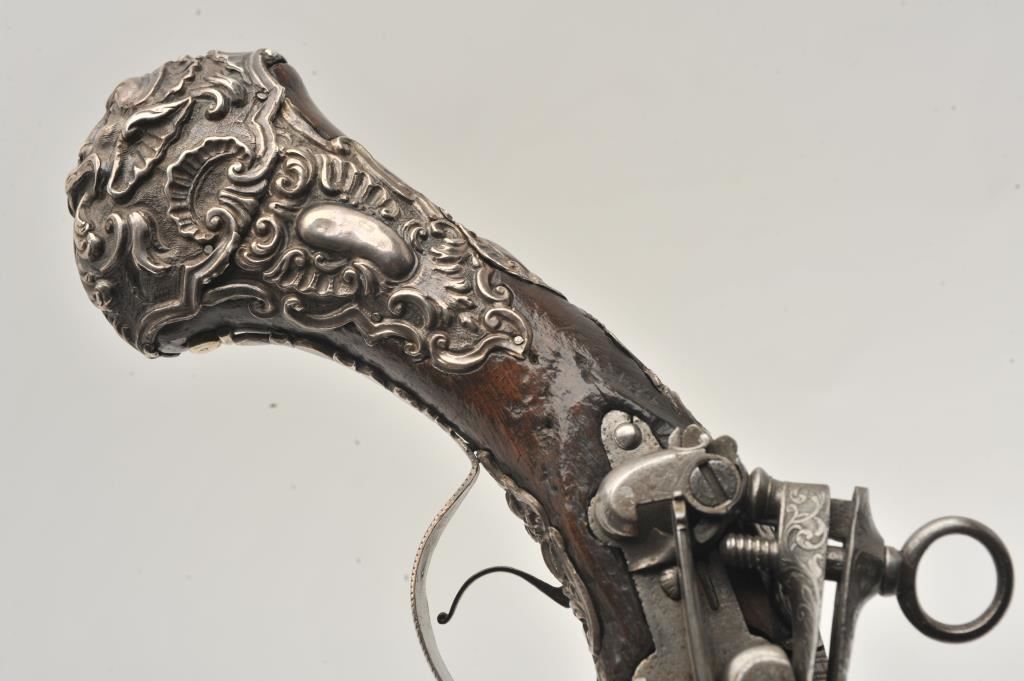 Ornate and impressive pair of Spanish miquelet horseman’s size pistols with magnificent rocco embossed in high relief full silver mountings. Measures 16 ½” overall with 10 ¼” 2 stage barrels with ringed cannon style muzzles of about .65 caliber smoothbore. The locks in barrels are lightly engraved en suite. The pair show hammered relief silver in the form of grotesque face with mustache on the butts extending all the way up the grip. The guards are silver with matching scrolling to borders. The side plate is similarly decorated with silver belt hook, pierced silver fore end band and stock retained and silver tipped ramrods. The fore end shows a small owner’s plaque with initials “A 1” or “A I” engraved upon it. The stocks are purposely plain as to not clash with ornateness of silver. The condition is very good and silver is near fine and is still crisp and not “Rubbed” from over polishing. This cataloger (John R. Gangel) first became aware of this pair of pistols when being sold by noted arms dealer Arthur Yates in the late 1970s to early 80s. Arthur