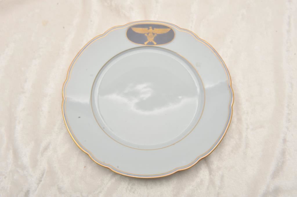 Dinner plate with Reichmarschall Herman Goring’s insignia in gold on cobalt blue panel. Marked “Richard Ginori” with star and E. Measures 8 ¼” across the center. Excellent condition. Lot 5017 Herman Historical Auction catalog. Est.: $900-$1800