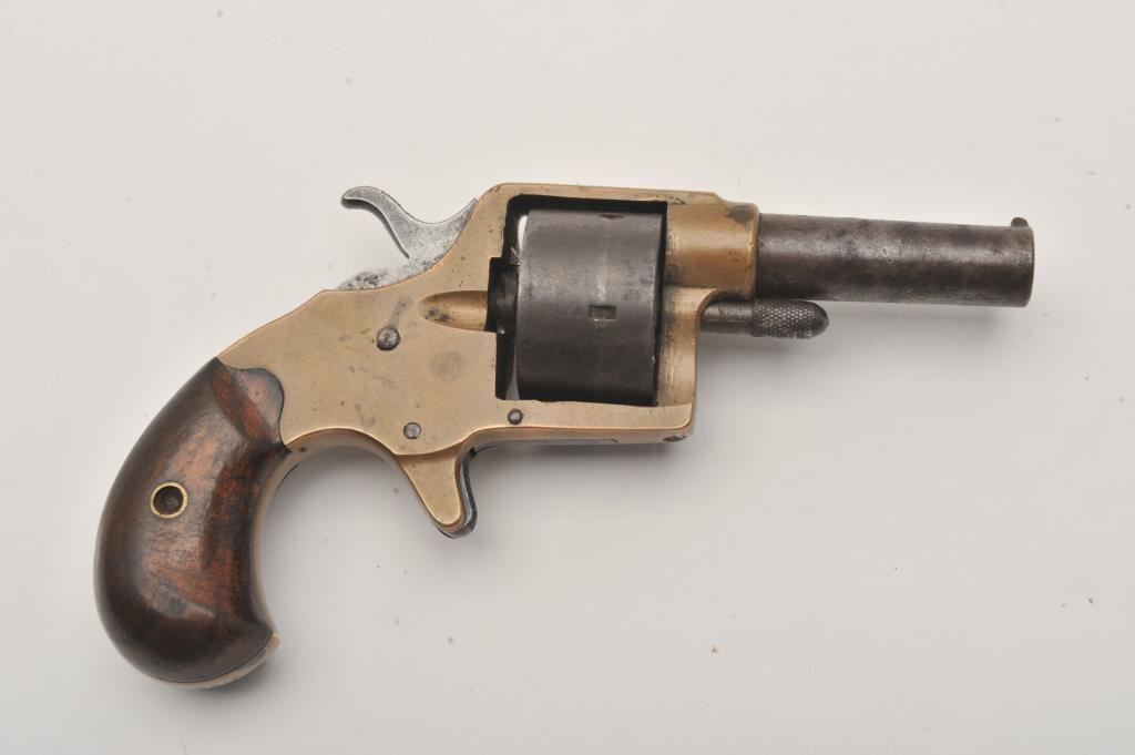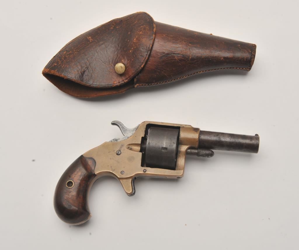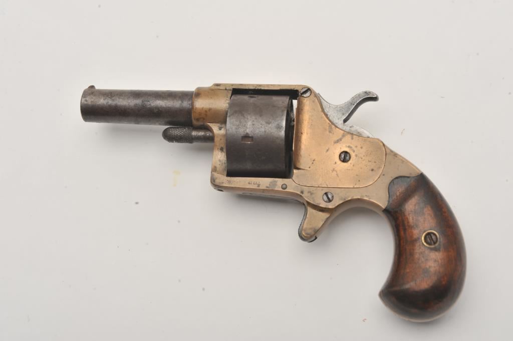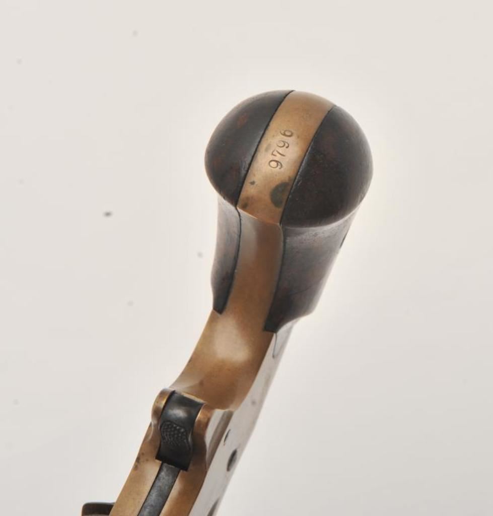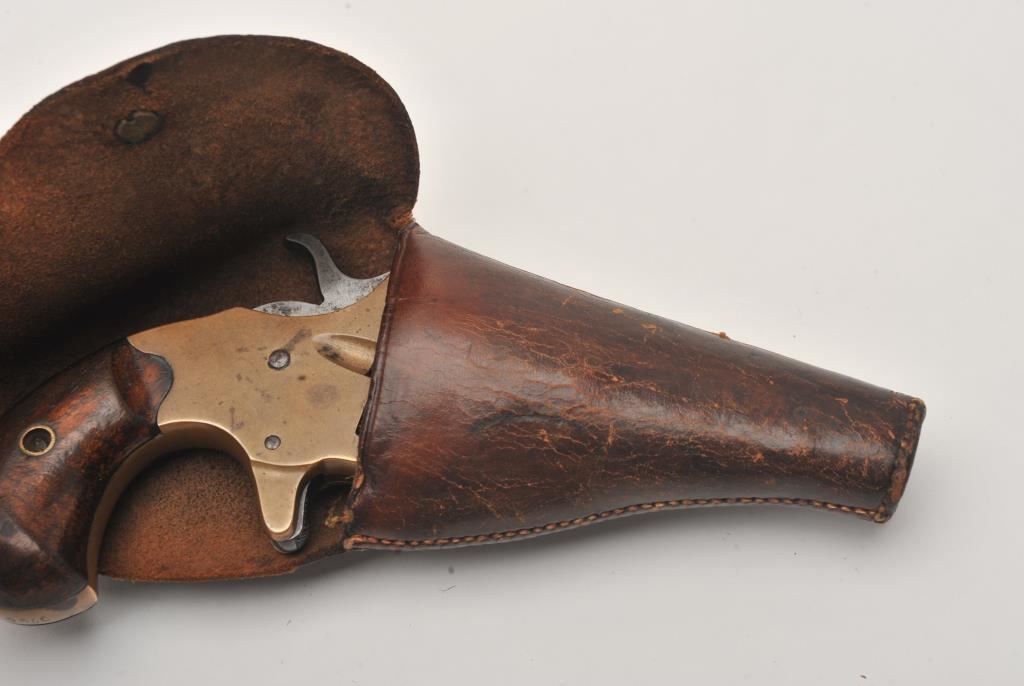 Colt House spur trigger revolver, brass frame, .41RF caliber, 2.5” barrel, dark patina to barrel, cylinder and cylinder pin, wood grips, S/N 9796; overall good condition with scattered spots of erosion on barrel and cylinder, pleasing patina to brass frame, good grips, dark bore, strong action. Accompanied by a period leather flap holster. (Antique). Est.: $600-$1,200.