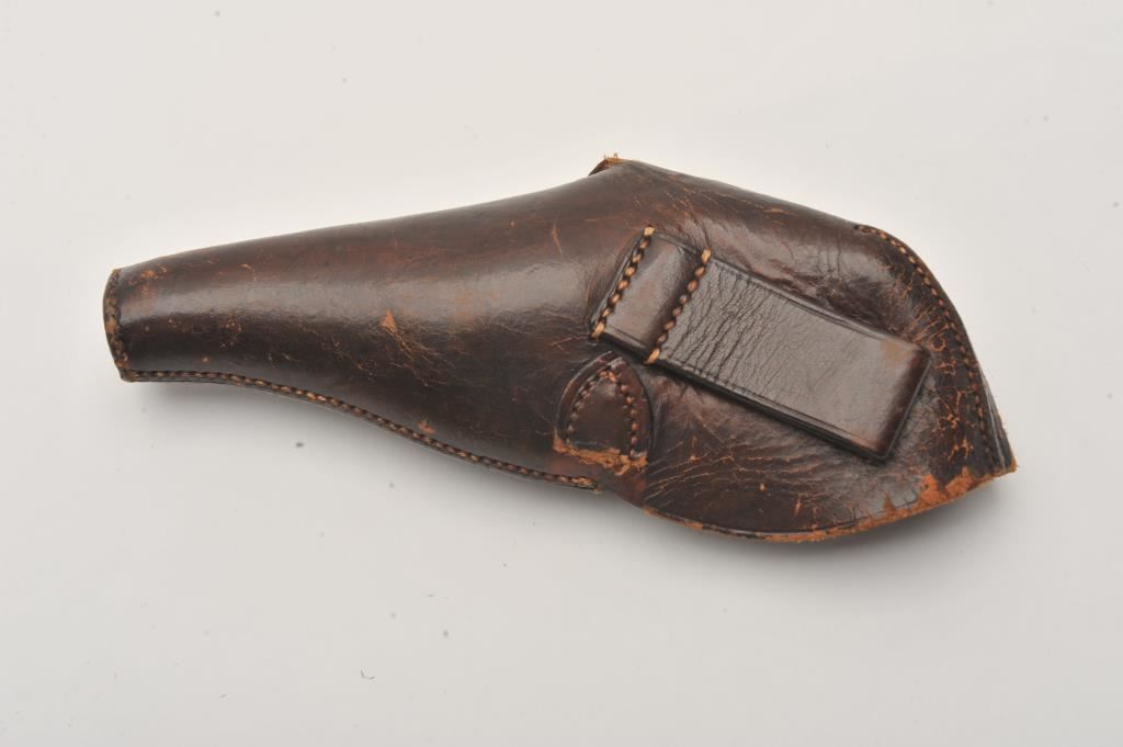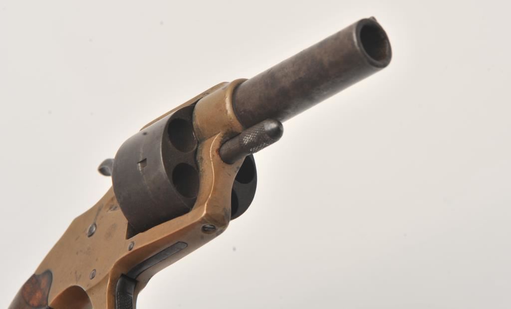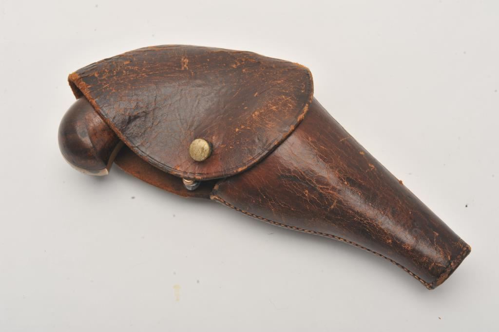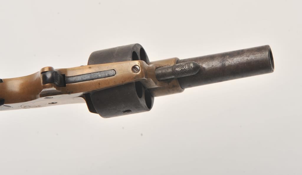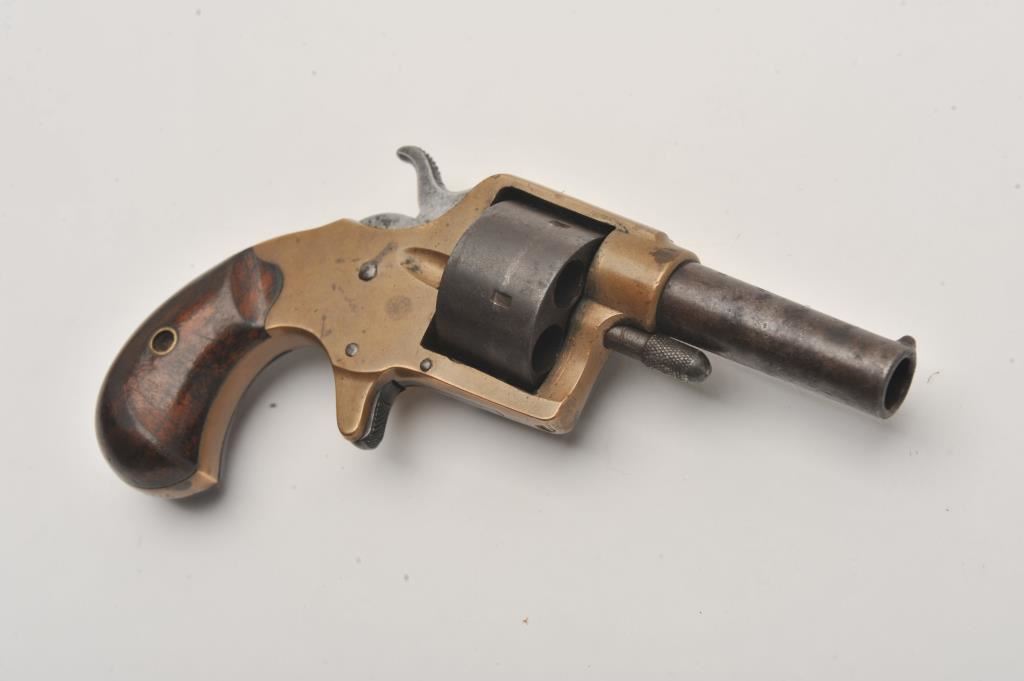 Colt House spur trigger revolver, brass frame, .41RF caliber, 2.5” barrel, dark patina to barrel, cylinder and cylinder pin, wood grips, S/N 9796; overall good condition with scattered spots of erosion on barrel and cylinder, pleasing patina to brass frame, good grips, dark bore, strong action. Accompanied by a period leather flap holster. (Antique). Est.: $600-$1,200.