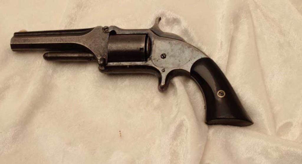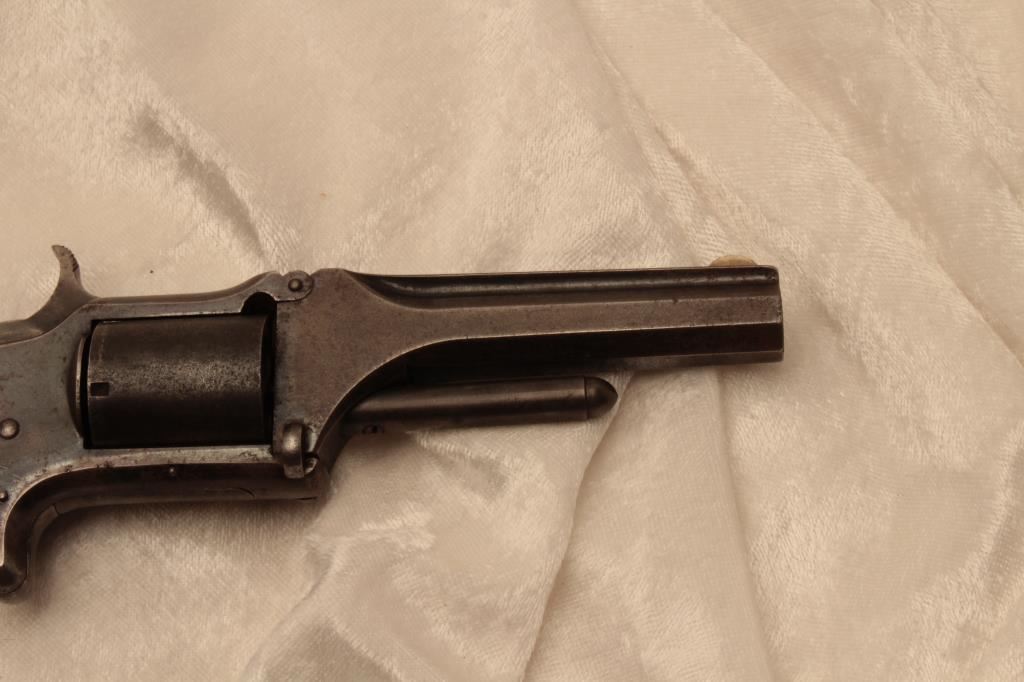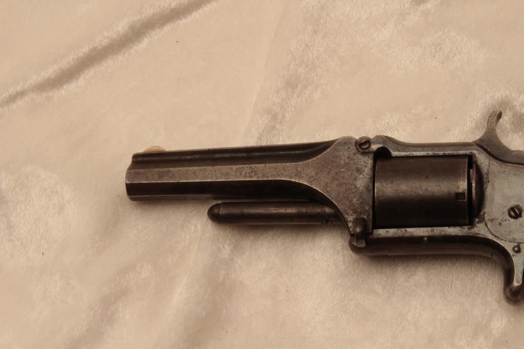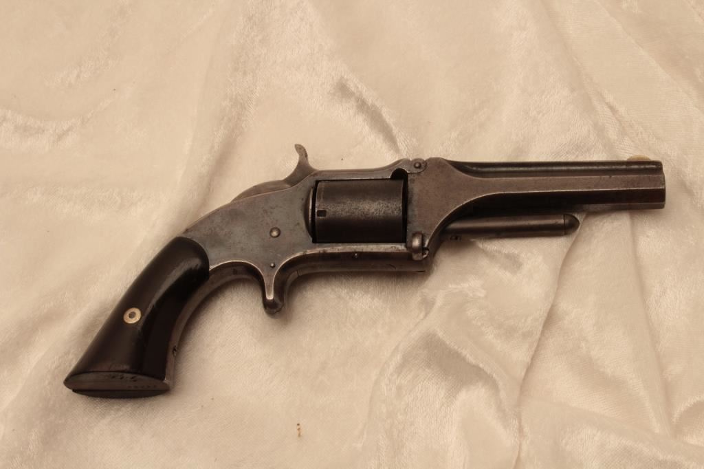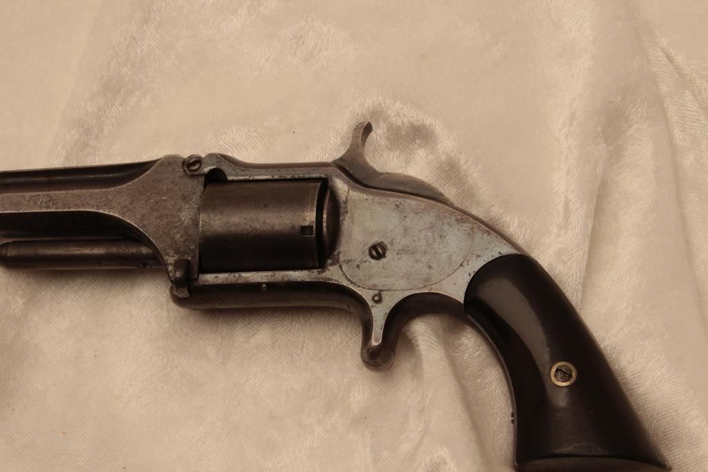Smith & Wesson Model 1-1/2 spur trigger tip-up revolver, .32RF caliber, 3.5” barrel, blued finish, rosewood grips, S/N 22947; overall good + condition displaying areas of original blued finish with balance gone to a grey patina; fair bore, crisp action, good markings and very good wood grips. (Antique). Est.: $300-$600.