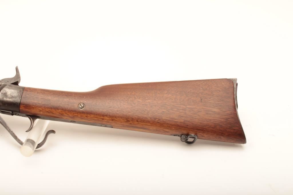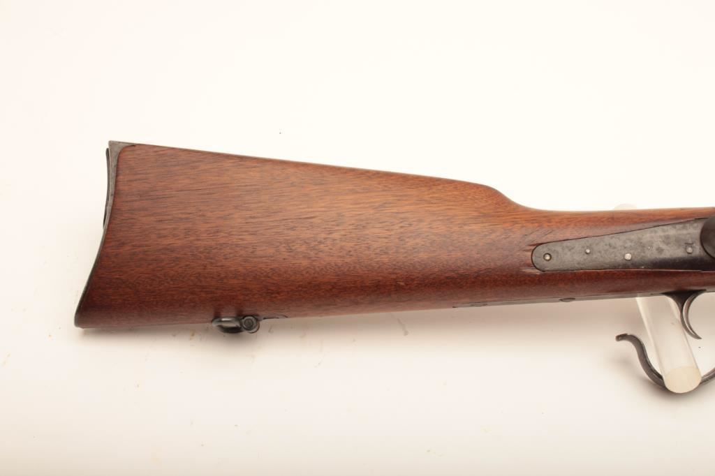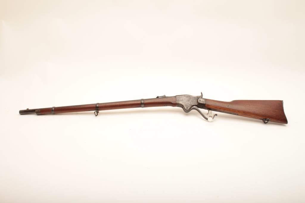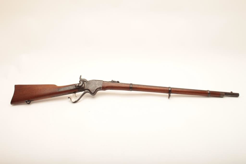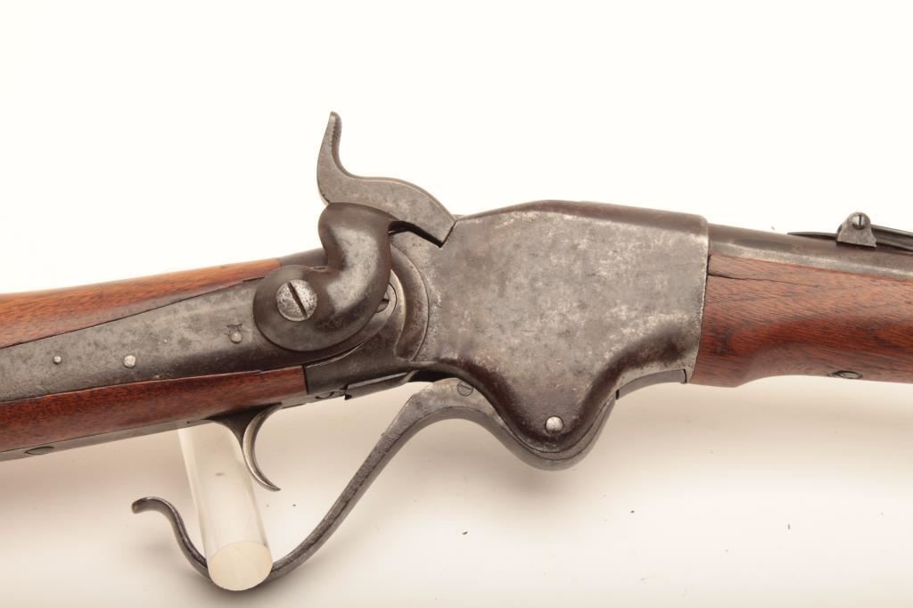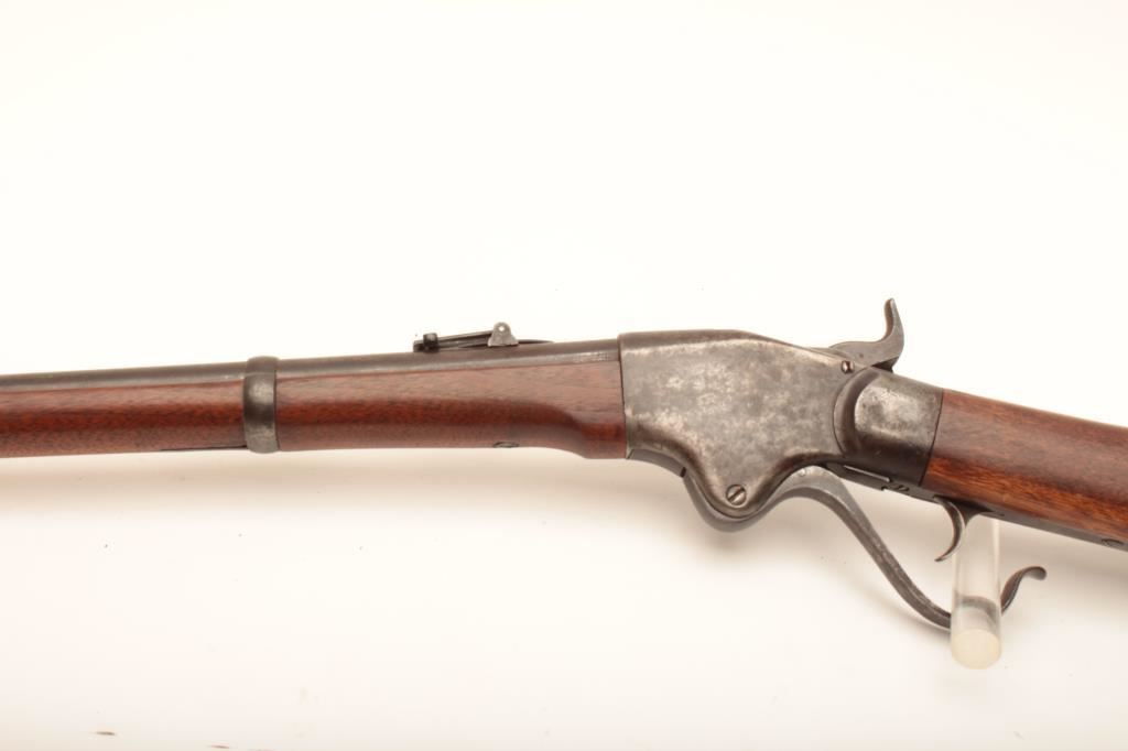 Early Spencer "Army Rifle" .52 rimfire cal., six groove rifling, serial # 4645, similar to Spencers delivered to Wilder's Lightning Brigade. Refer to Flayderman (9B-093) which states 11,470 were delivered and front sight doubles as a bayonet lug. Very good condition with traces of finish mixed in a light patina (light blue and silvery case discernable). Stocks are very good with some minor cracks and small losses, and are lightly cleaned but fit well. Side lock stamps at left breech with no other inspections which is common. Sharp address on frame, correct rear sight and small parts. Good action and clean bore. An above average example with a serial number that may be researchable through Springfield Research Service records. Est. $1750-3500