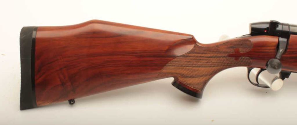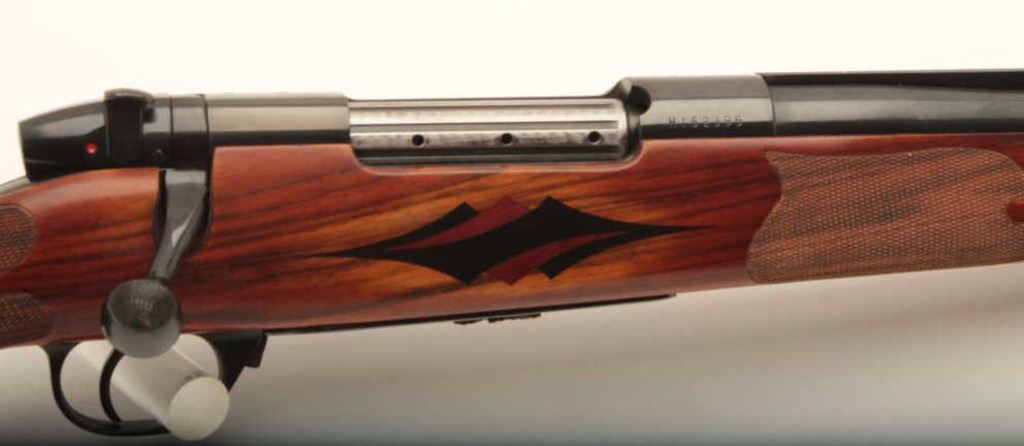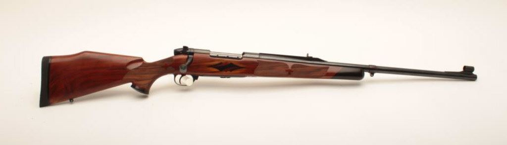Custom Weatherby MK V bolt action rifle, .378 Weatherby caliber, Serial #H162396. The rifle is in fine overall condition with a 24” ported barrel. The barrel and receiver retain nearly all of their blue finish with a hooded blade front sight, barrel band swivel, quarter rib and two-leaf folding rear sight. The receiver has been drilled and tapped for scope mounting and is marked, “SOUTH GATE CALIF. MADE IN JAPAN”. Additionally, the rifle features a jeweled bolt and magazine follower. The finely checkered Walnut stock features ebony fore end and pistol grip, with custom fleur de lis checkering and inlay. A stylized gold tone escutcheon plate reading, “CEC” has been added at the fore end and a gold tone bear embossed on the magazine plate. The butt stock shows beautiful figure and ends with a solid rubber recoil pad providing a 13 ½” LOP. The bore is good, the action crisp and markings are sharp on this fine Weatherby. The lot includes a set of RCBS reloading dies. Est.: $1,500-$3,000. (Modern).