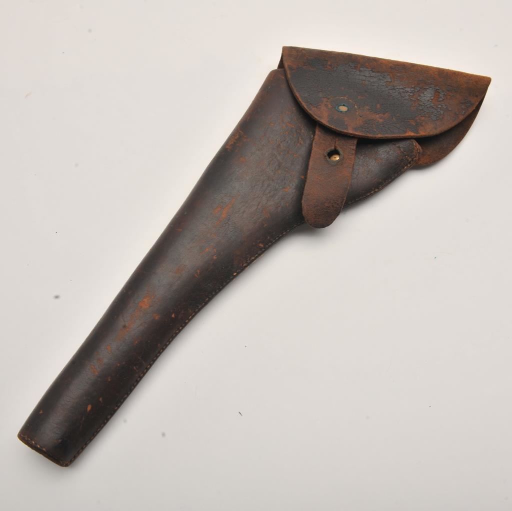 Leather flap holster modified from a Civil War 1860 Army for use with a Colt SAA revolver; good overall condition with some scuffing and flaking. Est.: $300-$600.