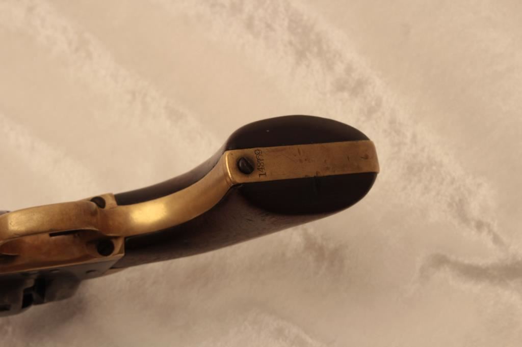 Colt 1851 Navy 4th Model with capping groove percussion revolver, .36 caliber, 7.5” barrel, grey patina, wood grips, S/N 143769; overall good condition showing considerable cylinder scene, good action, good markings and good grips. (Antique). Est.: $1,200-$2,400.
