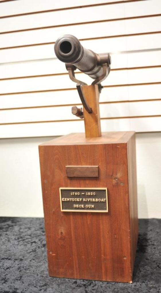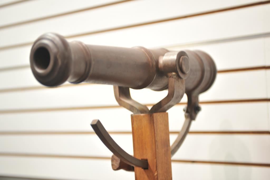 Small British style deck cannon with old swivel mount. On display stand with plaque that reads “1780-1820, Kentucky river boat deck gun”. Measures 19 ¾” from tip to end with approximately 1 ¼” bore. Iron barrel with brass mounts. The tube is unmarked with uncleaned patina and definitely 18th-19Th century or earlier. Est.: $1250-$2500