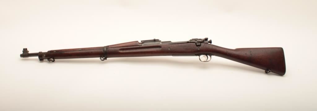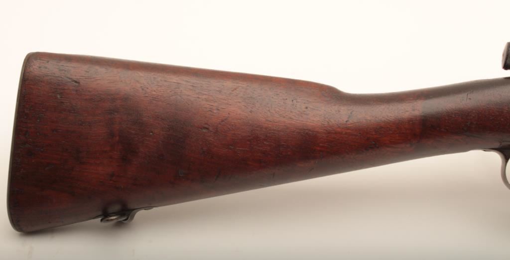 Springfield 1903 #134130, .22 cal., Hoffer Thompson training rifle, 24" barrel, blued finish and "S" type wood stock. Rifle is in good condition overall, barrel is marked SA 12-14 action is good. Stock is good with 4, 52 and "P" proof behind the trigger guard, an "S" forward of the floor plate, and AA, BJ, and "A.A.J." in rectangle on the left side above the trigger. There is also a star behind both sling swivels, Includes one Hoffer Thompson insert, O'Hare rear sight adjustment tool, and cleaning kit. (C&R) Est. $1500-3000