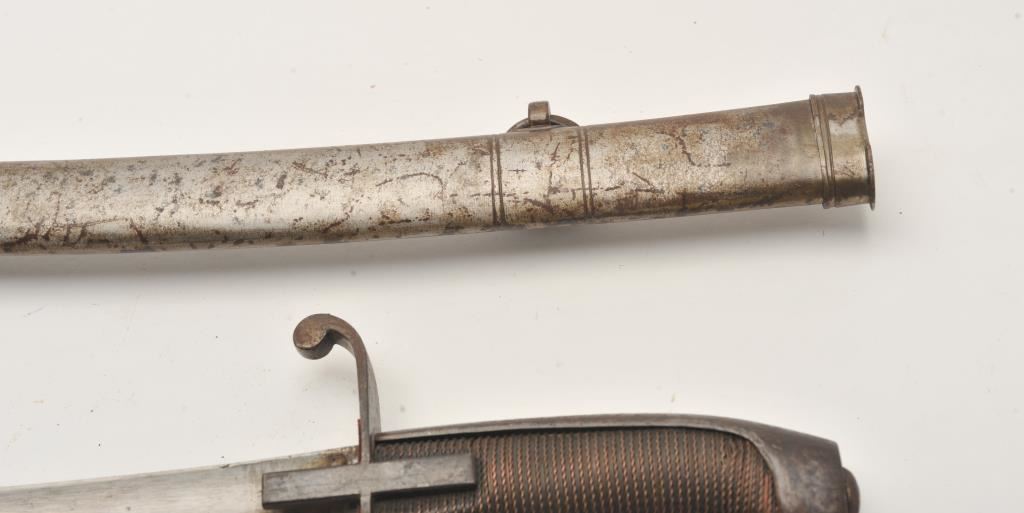 1790 Period European Cavalry Hussars Saber with 5 Ball Steel Hilt in Scabbard possibly Polish: long 34 and 1/2 inch polished blade with wide fuller. 41 and 1/2 inches overall Steel hilt with 5 ball guard and long langlets. Beautiful braided copper wire wrapped grip. Sword is in untouched condition with blade retaining some original polish with no rust or chips in its original steel scabbard with two carrying rings is stained but has no dents or pitting. This is a great late 18th century Hussar's Cavalry Sword in wonderful condition. Est:$500-1000