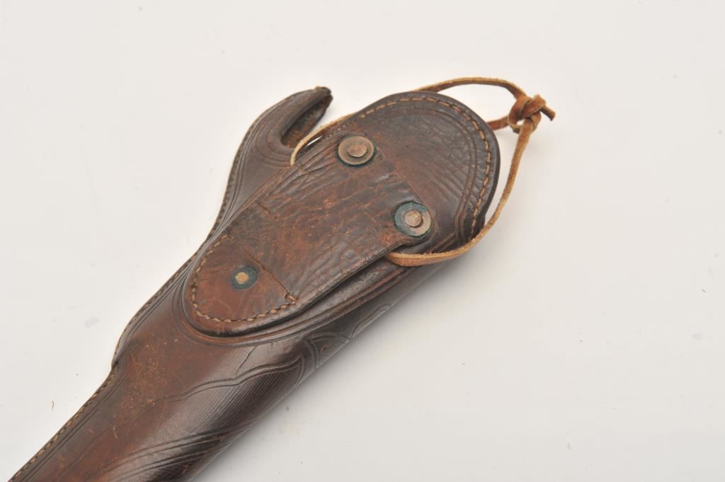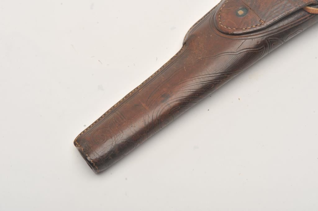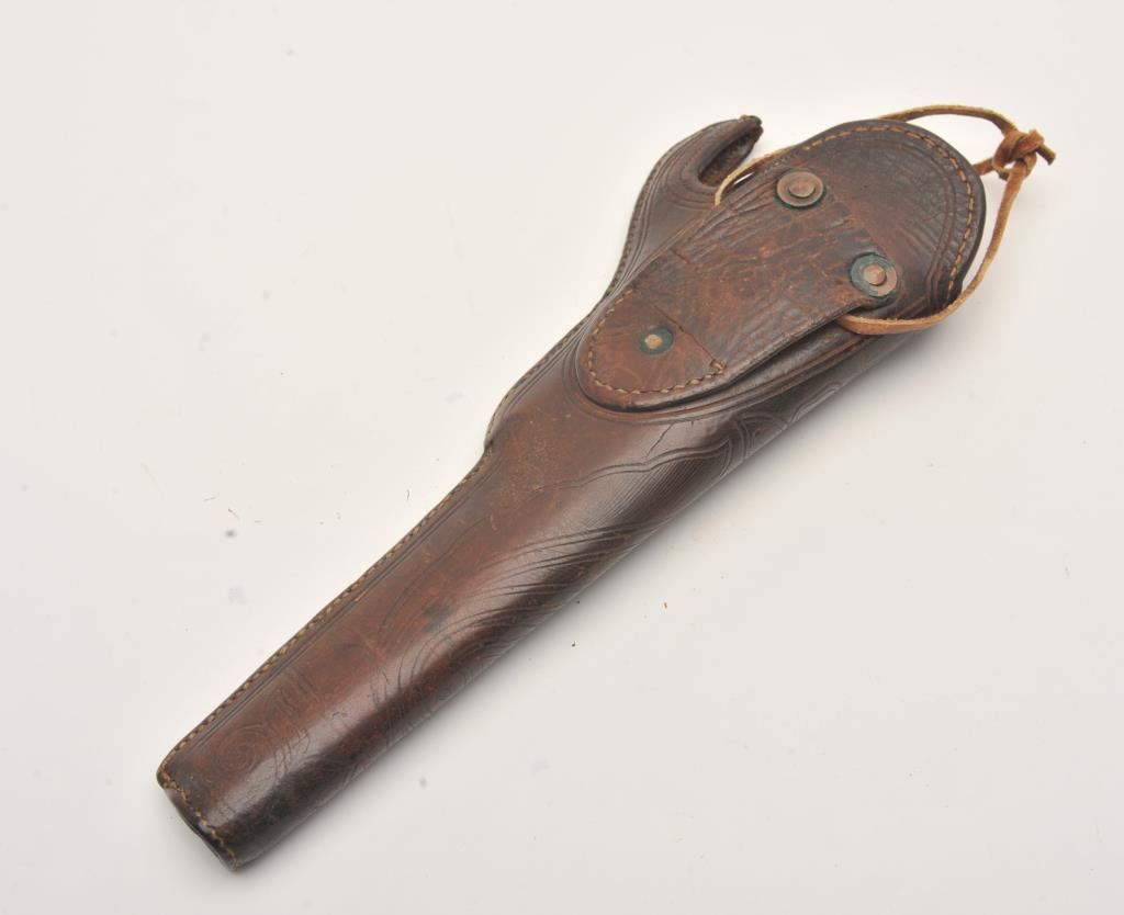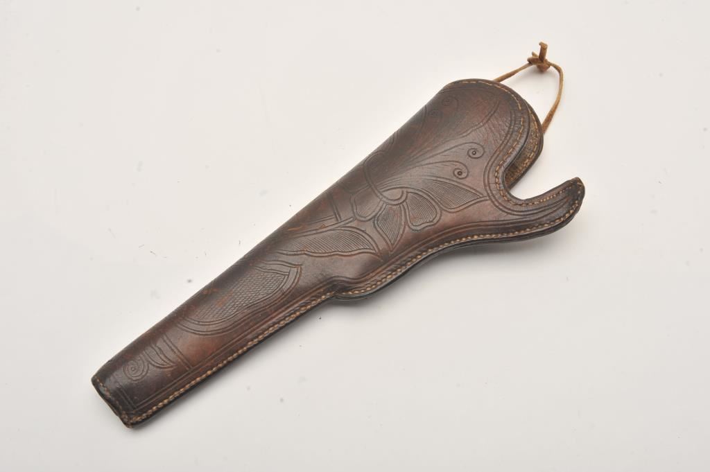 Carved leather Slim Jim holster for a Colt revolver, ca. 1870’s; very good overall and similar to example in “Packing Leather” book. Est.: $350-$700.